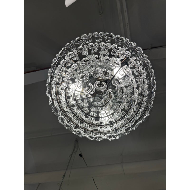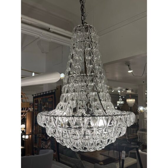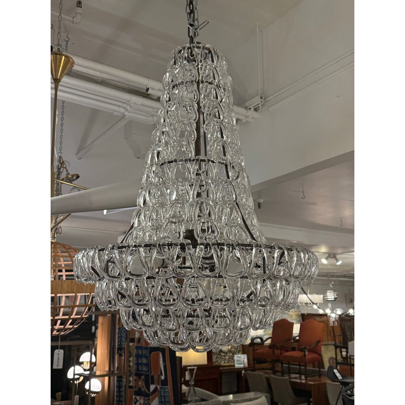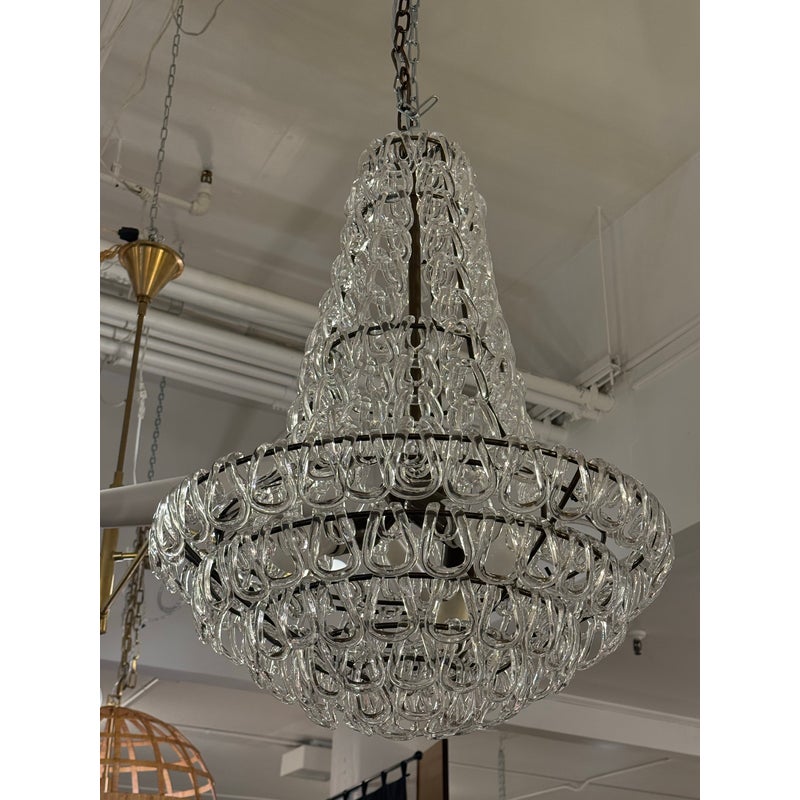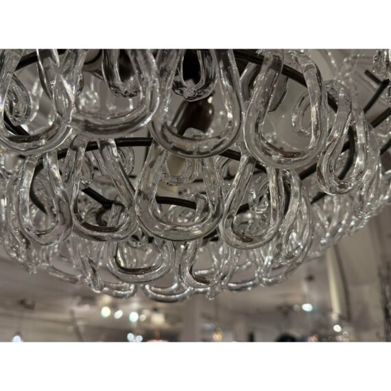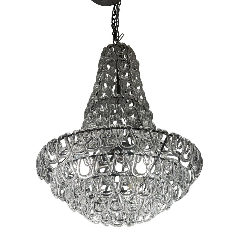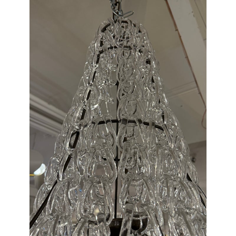 Design Plus Gallery presents a Custom Minigiogali SP Cla UL Chandelier by Angelo Mangiarotti for Vistosi. The suspension lamp is sculptural and luminous, as it is composed of an array of handmade crystal glass elements,. Each glass crystal is individually blown + assembled to create a cascading, architectural form. The repetition of interlocking glass links produces a dynamic play of light and reflection. The piece balances cutting-edge modern design with the time-honored Venetian tradition of glassblowing, a hallmark of Vistosi’s craftsmanship. A matte bronze frame provides a warm, understated contrast to the crystal clear glass. Designed to command attention while remaining a timeless centerpiece in your home. In good condition, minimal wear from usage. Made in Italy.