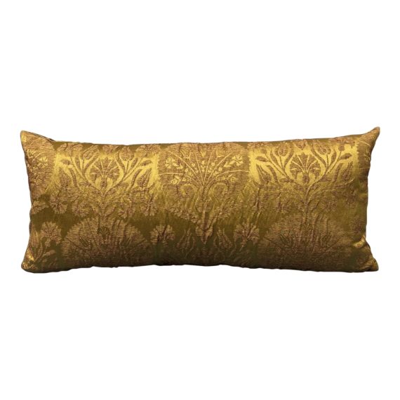 Design Plus Gallery presents a Fully Embroidered Lux Gold Silk Duponi with Silk Stitched Brocade from Anke Drechsel. Anke Drechsel is a German textile designer and internationally recognized brand, founded in 1986. She is renowned for exclusive hand-embroidered home textiles and accessories. Anke believes that real luxury lies in true craftsmanship. Her quality fabrics are dyed to her own color specifics, and her exclusive designs are then individually embroidered on the frame, piece by piece, in her atelier by master craftsmen. This elegant lumbar pillow has golden threads on a rich gold duponi silk background. In good condition, minor wear.
