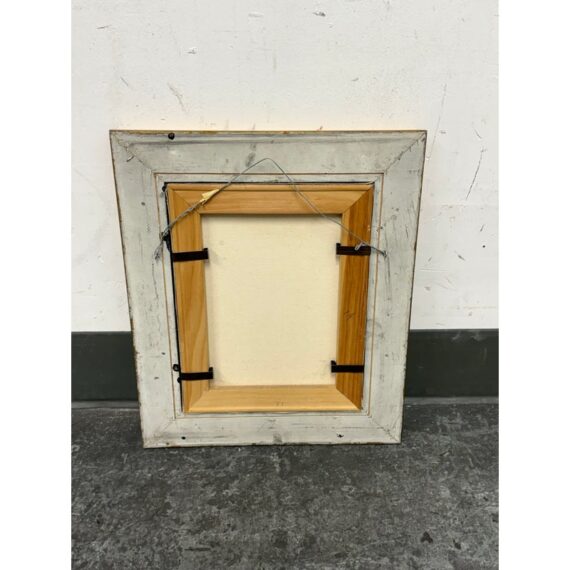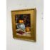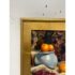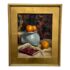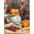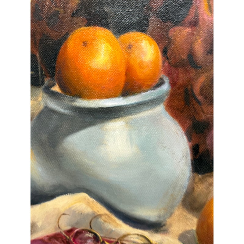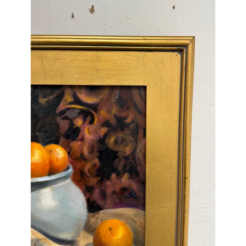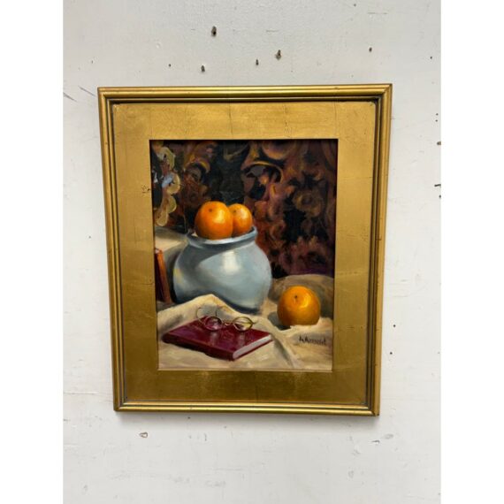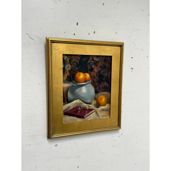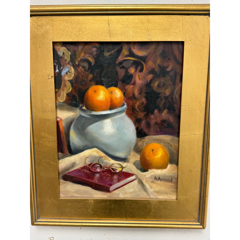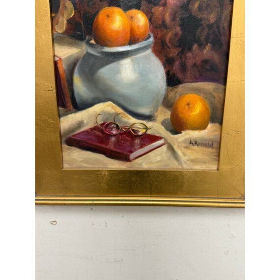 Design Plus Gallery presents an Original Painting from artist Ann Arnold (1936-2015). The composition centers on a modest table setting, a cluster of ripe oranges arranged thoughtfully in a light blue jar, their luminous color contrasting beautifully against the soft vessel. Beside them rests a well-worn red book, atop which perches a pair of reading glasses, inviting a quiet moment of reflection or an untold story. The background unfolds in deep, almost theatrical drapery of dark tones, lending the scene a rich sense of depth and hush. This masterful interplay of light and shadow is characteristic of Arnold’s gentle yet evocative approach, with brushwork that captures the tactile warmth of everyday life. Presented in a custom wood frame finished with genuine gold leaf, the painting commands attention as a conversation piece—an inviting vignette that celebrates the poetry of simple comforts. Artist signature is on bottom right. In good condition, visible and minimal wear from usage.