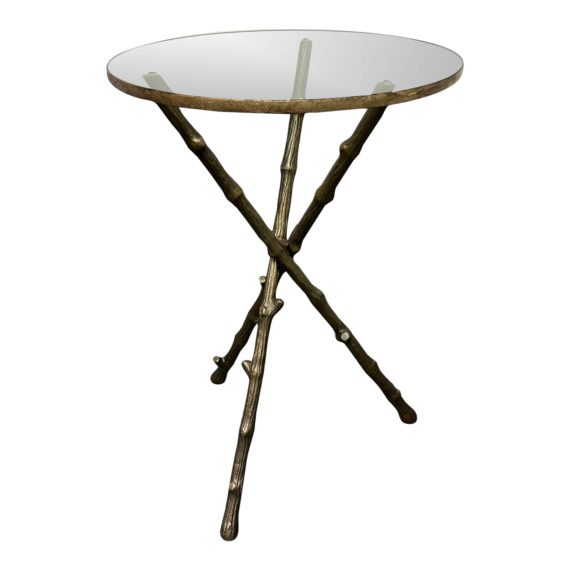Design Plus Gallery presents the Twig Tripod Table by Anthem. A round glass top has sides trimmed in a bronze finish and rests on a metal tripod base. The base has a twig appearance, and features the same bronze finish as the glass’s sides. Stylish and petite, this side table will serve well by a reading chair in a cozy corner or as a general accent piece. Minor wear from use; side table is in good condition.