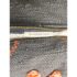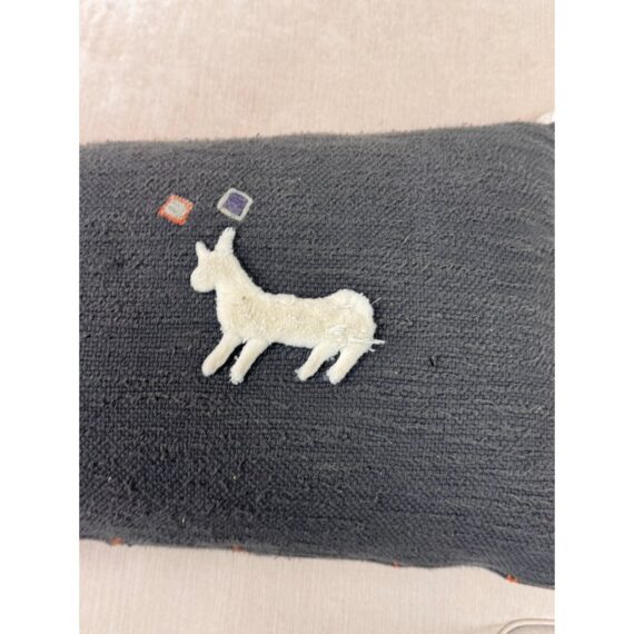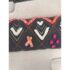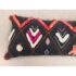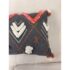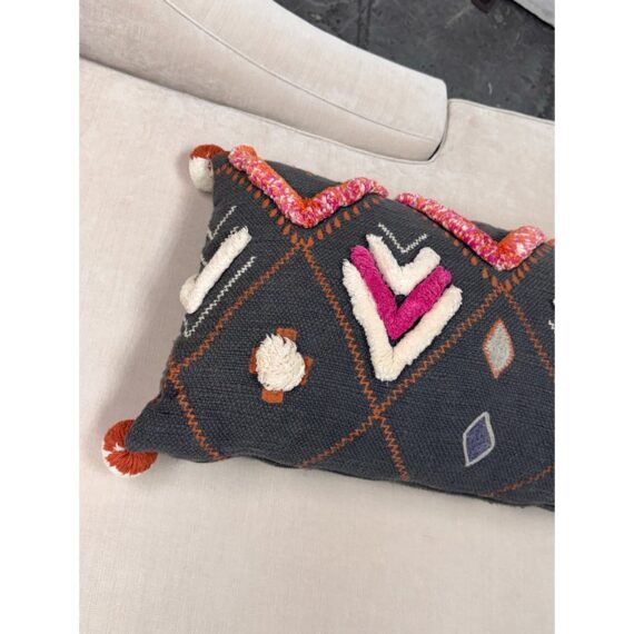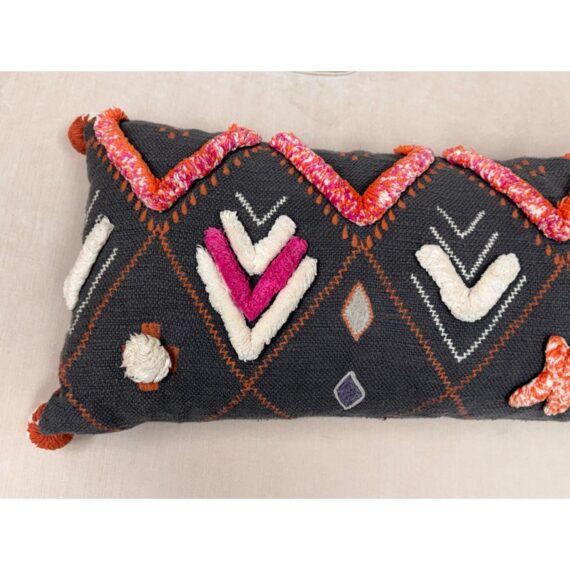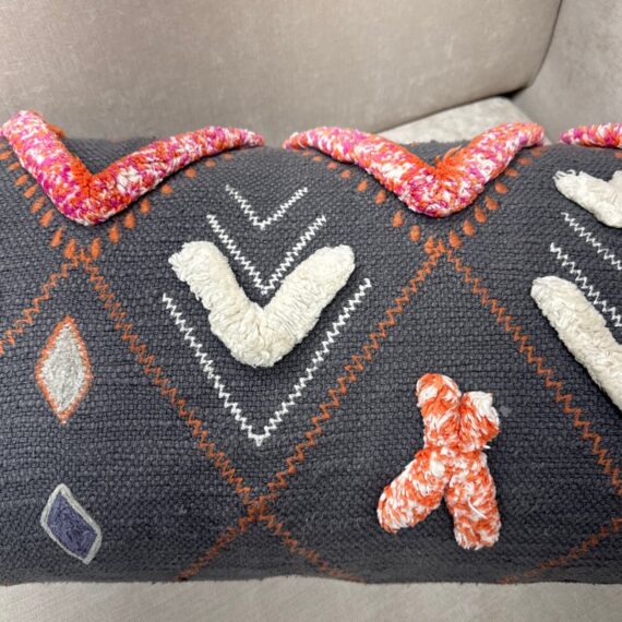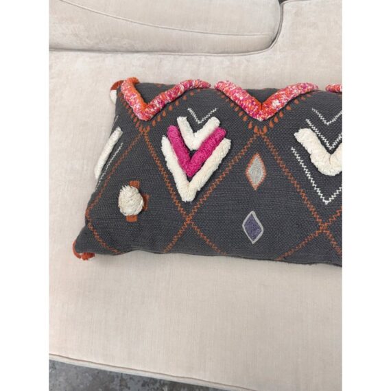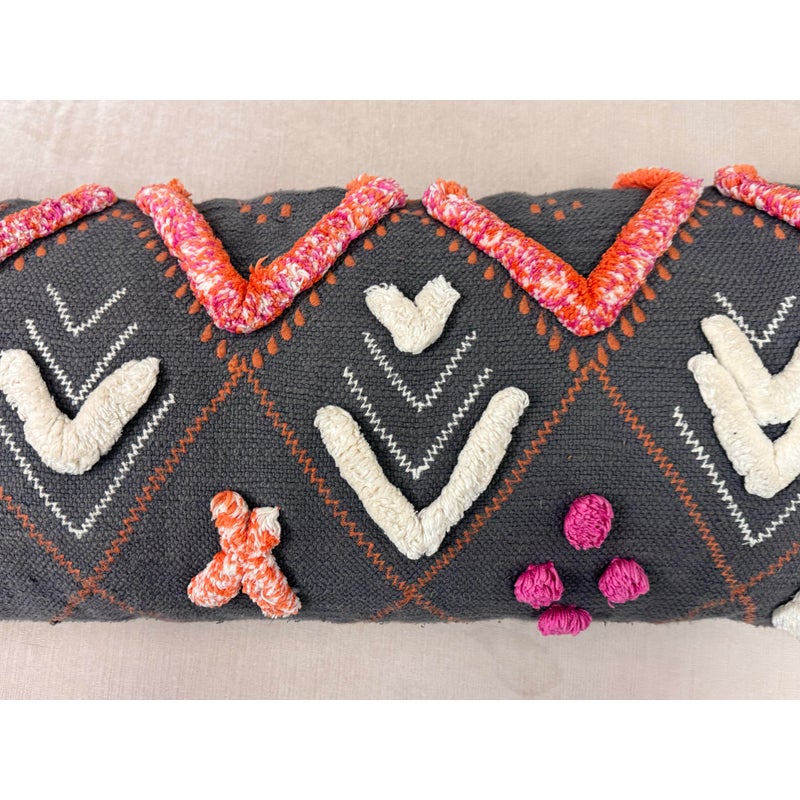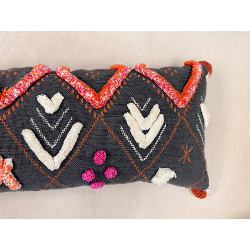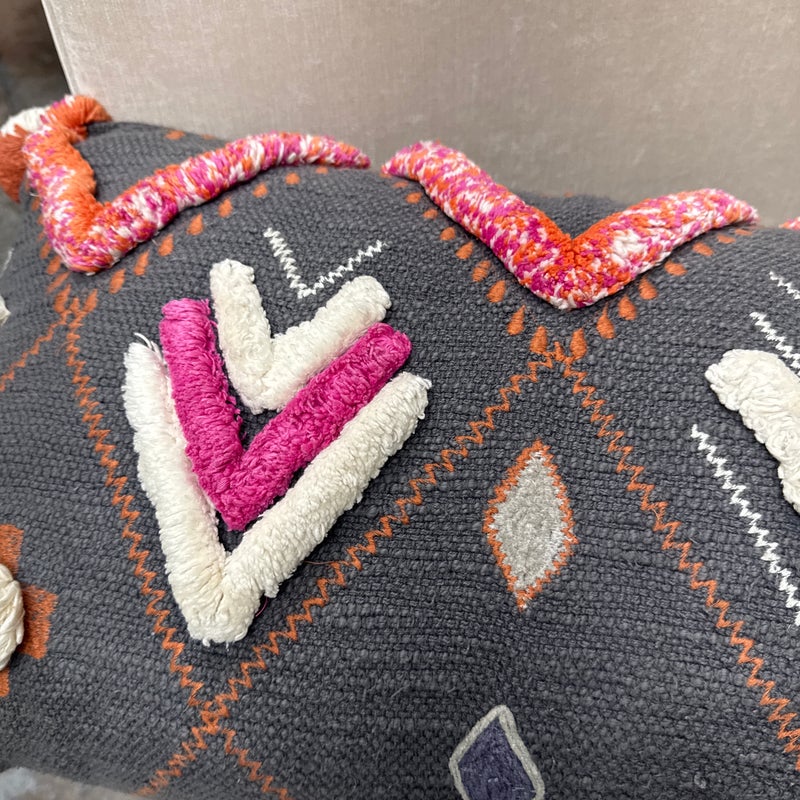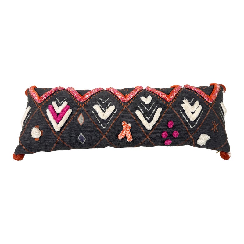 Design Plus Gallery presents a Heradia Lumbar Pillow from Anthropologie. The decorative elongated textile pillow showcasing a bold geometric pattern rendered in charcoal gray with contrasting embroidered motifs. The surface displays raised chevron forms, stitched accents, and dimensional appliqué details in ivory, coral, orange, and magenta, creating layered texture and visual rhythm across the front. Hand-stitched elements and tactile yarn work add depth, while tassel details at the corners complete the design with a playful yet intentional finish. The reverse side maintains a consistent woven textile backing for a cohesive presentation. It is in good condition, visible and minimal wear from usage.