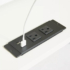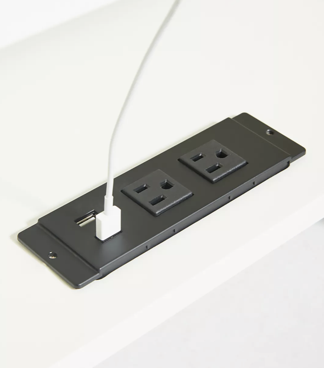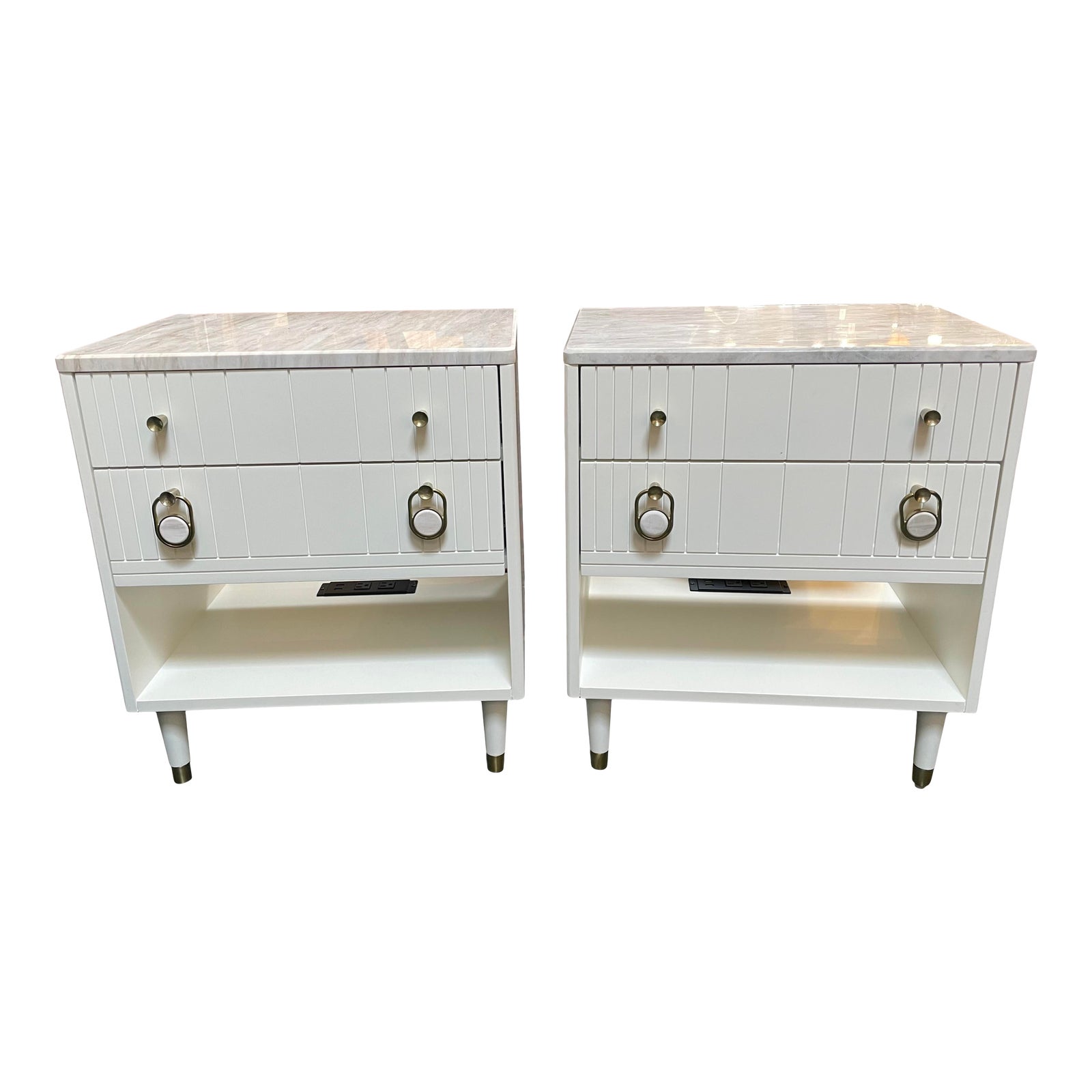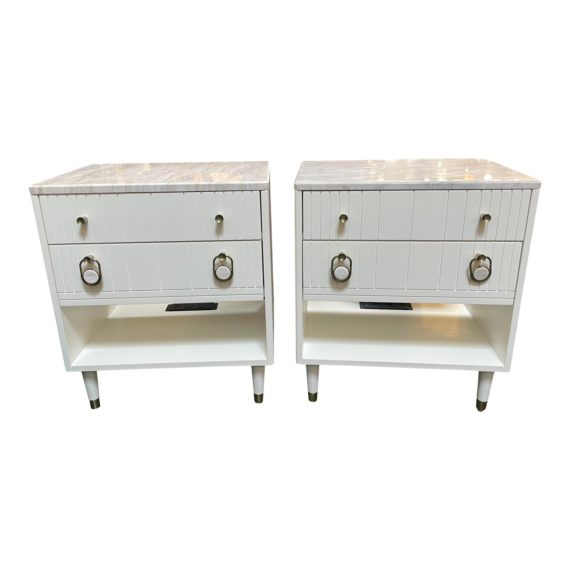 Design Plus Gallery presents a Pair of Marcell Nightstands by Anthropologie. Each nightstand has two drawers and a shelf on the bottom. The lower handles are shaped like locks and have white centers. Marble slabs rest on the tops. Wear is consistent with use; items are in good condition. The nightstands have power outlets, on the back of the shelf.