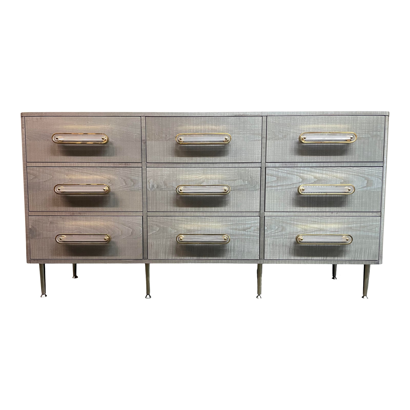 Design Plus Gallery presents the Anthropologie Odette Nine Drawer Dresser. Made with wood and given a bright gray finish. The handles are oblong, with lucite centers and edges that are covered in brass. There is one condition on the top from placement of hot liquids; item is in good condition. There are extra legs in the middle for enhanced stability.