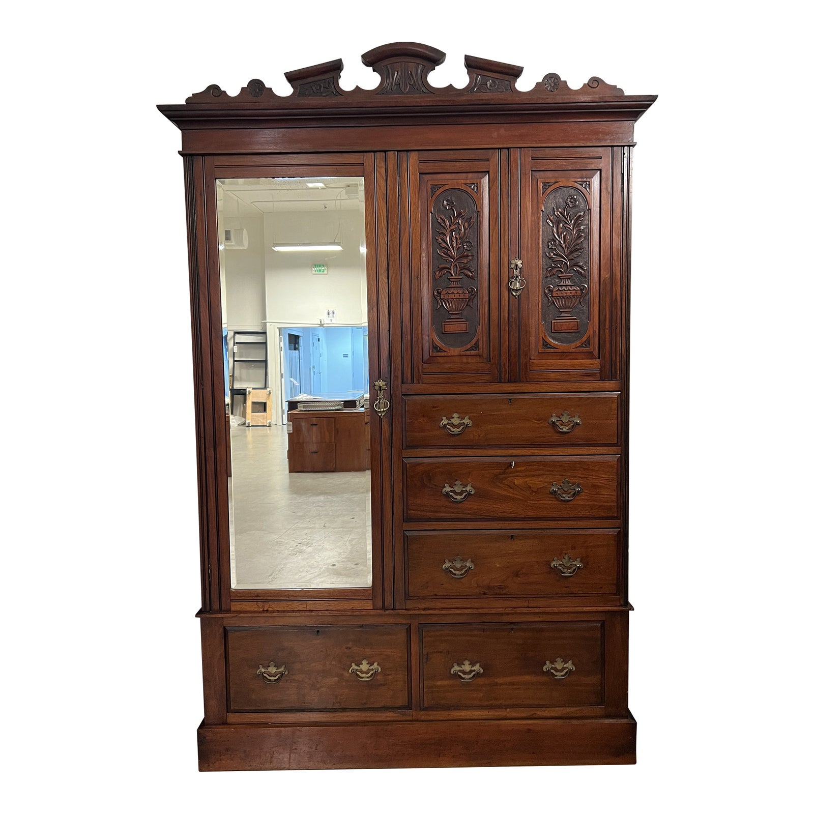 Design Plus Gallery presents an Antique 1895 English Mahogany Four Piece Compactum Wardrobe. The wardrobe is constructed with solid mahogany. Features include a mirrored cabinet door with a clothes rod inside, a double-door cabinet with a shelf, and five drawers. The double-door cabinets are accented with carvings of a pot and botanics. The hardware is made with brass. Cabinets are lockable. Visible + Minor wear consistent with age + use; wardrobe is in good condition. Comes with one Key.