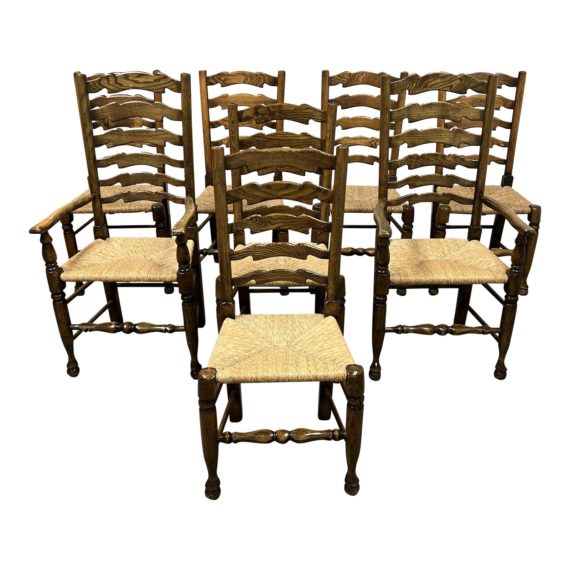 Antique 18th Century Reproductions Ladderback Dining Chairs + Rush Seating, Set of Eight. Original Price: $9,000