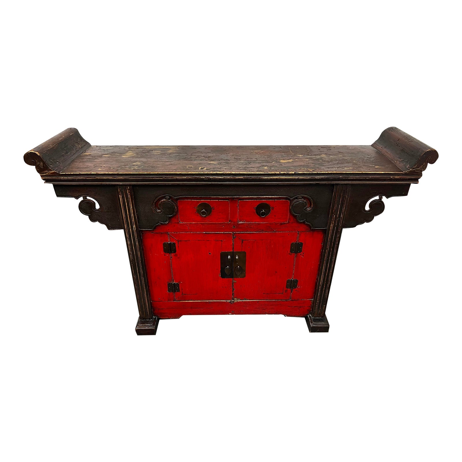 Design Plus Gallery presents an Antique Chinese Console Table. Features include a rectangular tabletop with upward rounded ends, and a fluted accent on the leg’s fronts. The front body with two drawers and pair of cabinet doors is in red lacquer and features metal hardware. The wood is naturally distressed with age. Visible and minor wear from age and use; console is in good condition.