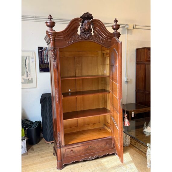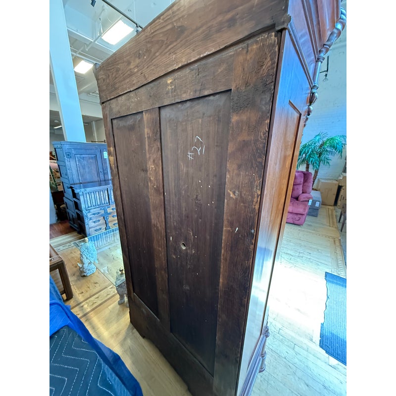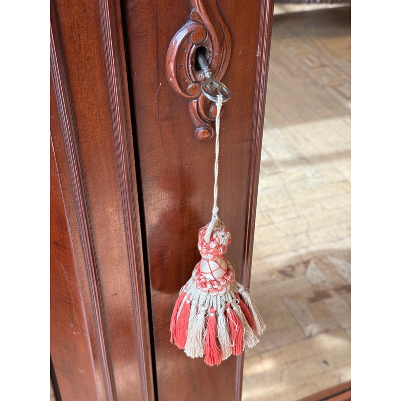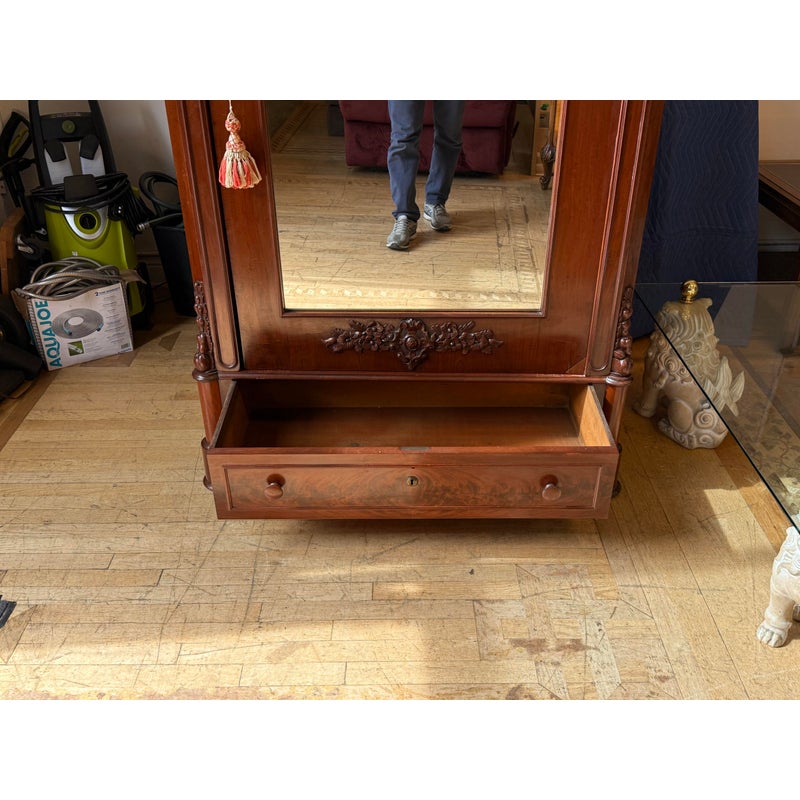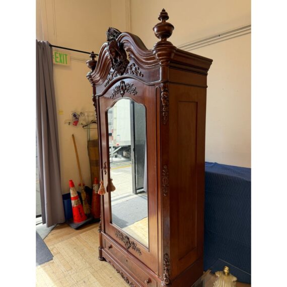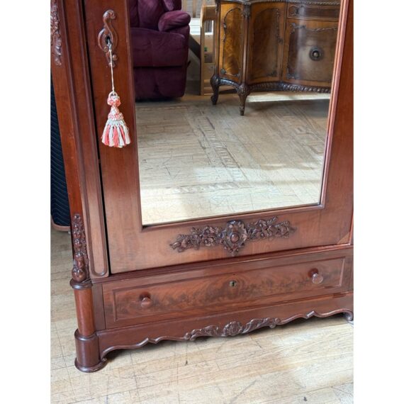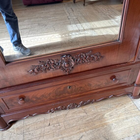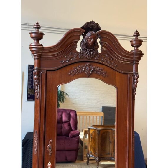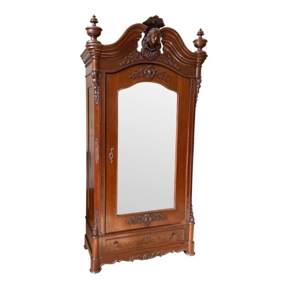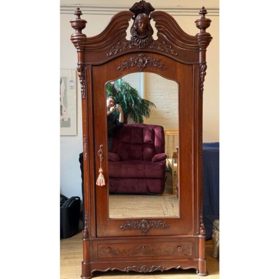 Design Plus Gallery presents a Richly Carved + Appointed Armoire from the Early 20th Century. The armoire has lobed finials, arched beaded crest centered by a foliar cabochon mediation, acanthine brackets, mirrored door, chamfered base with deep drawers, three inner shelves and bracket feet. Is in good condition for its antique age. Comes with single key.