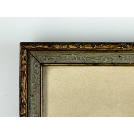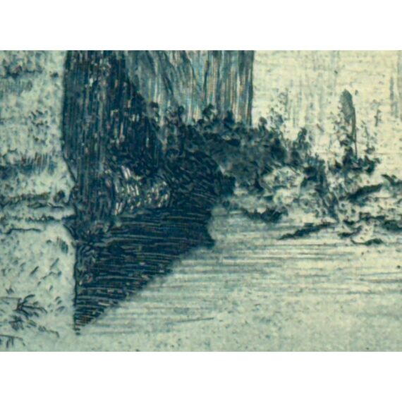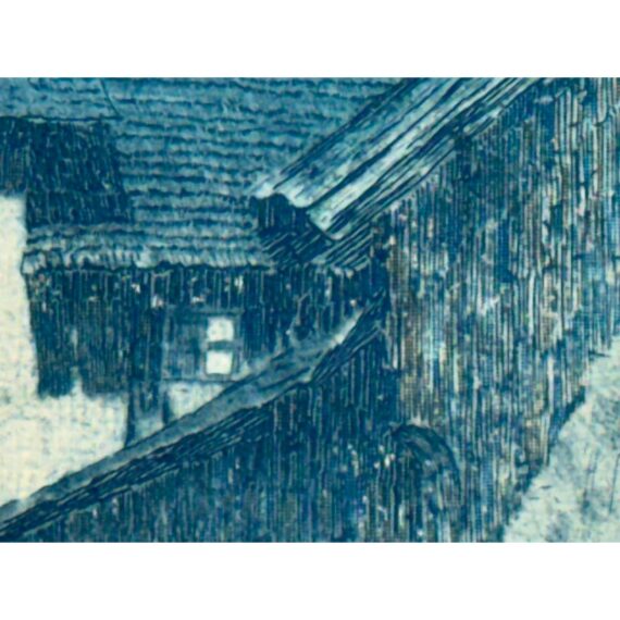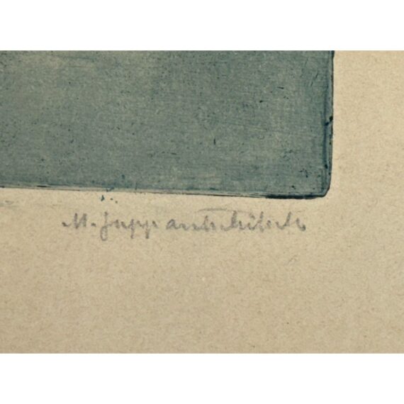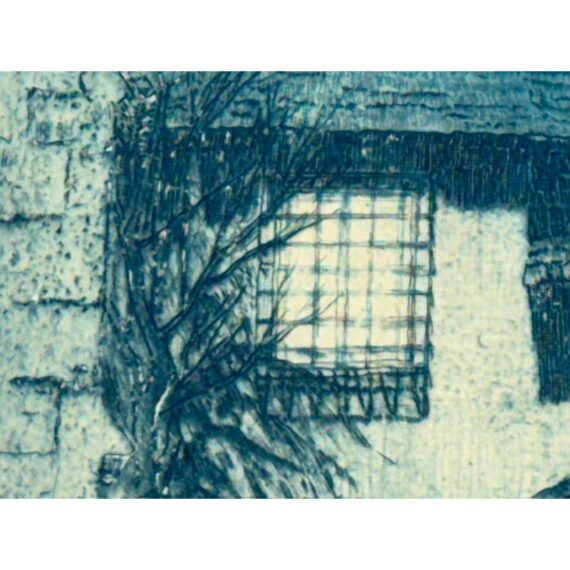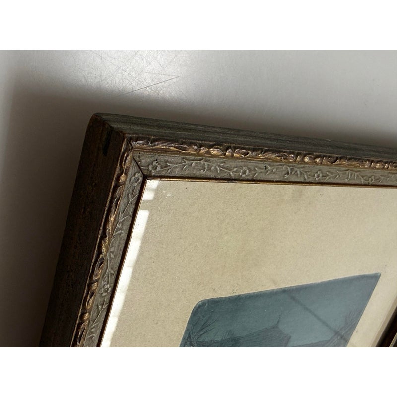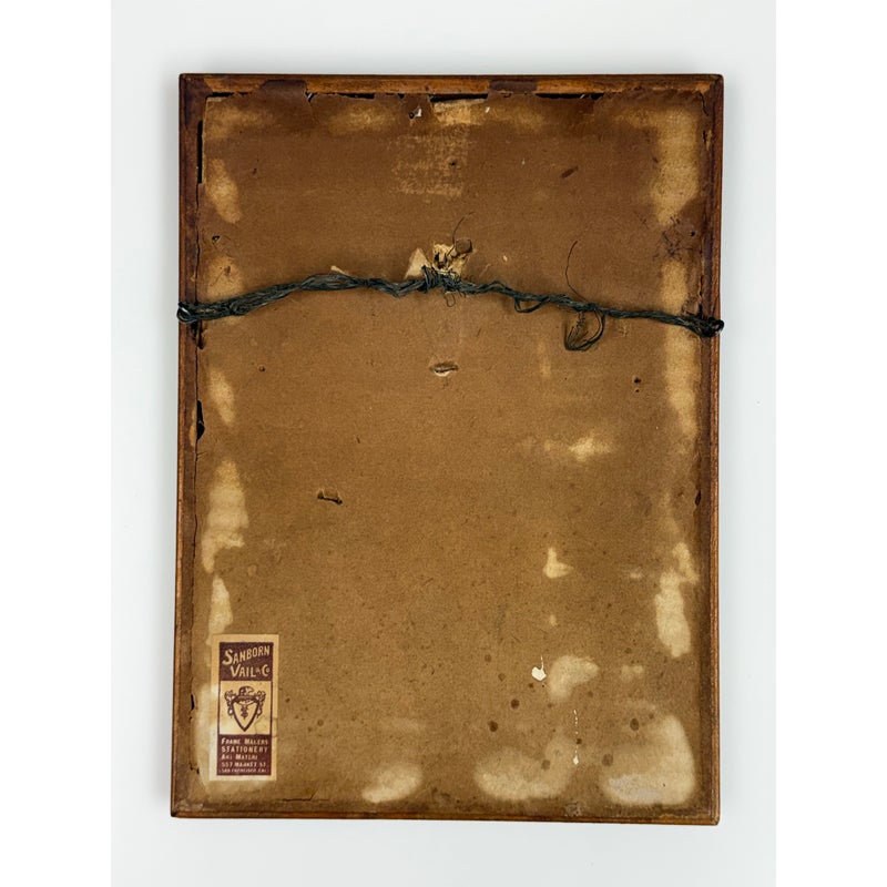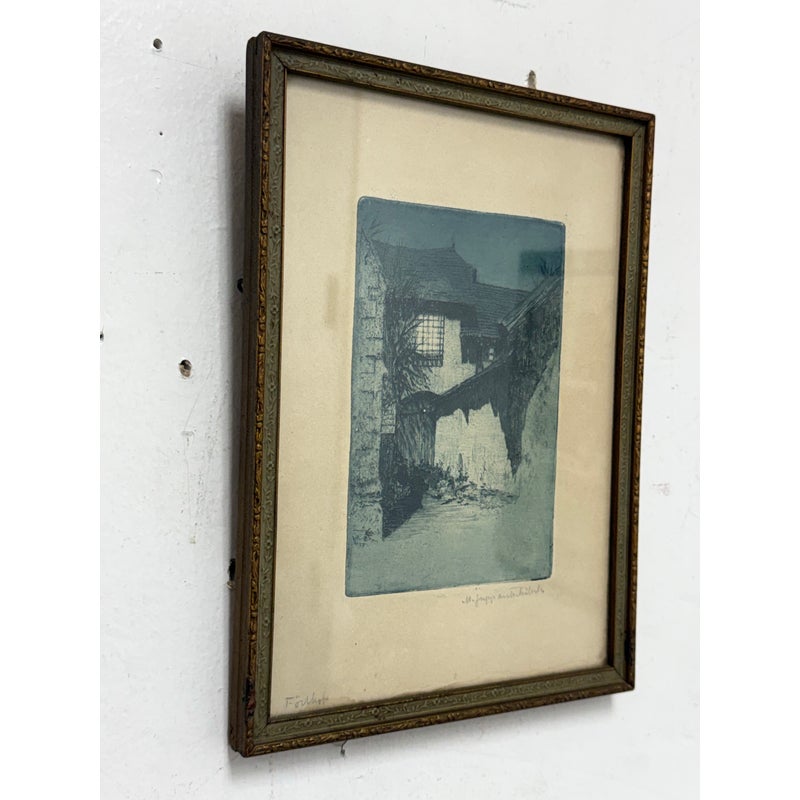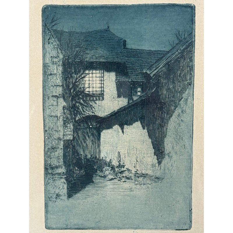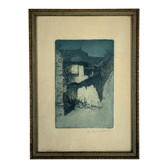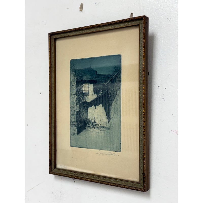 Design Plus Gallery presents an Architecture Art Piece from the Early 20th Century. The piece shows the front or side entrance to a European home. Shadow work is in the image with angles and foliage growing on its foundation and ground. The wood and metal with matte. Visible wear is on the piece and is in fair condition.