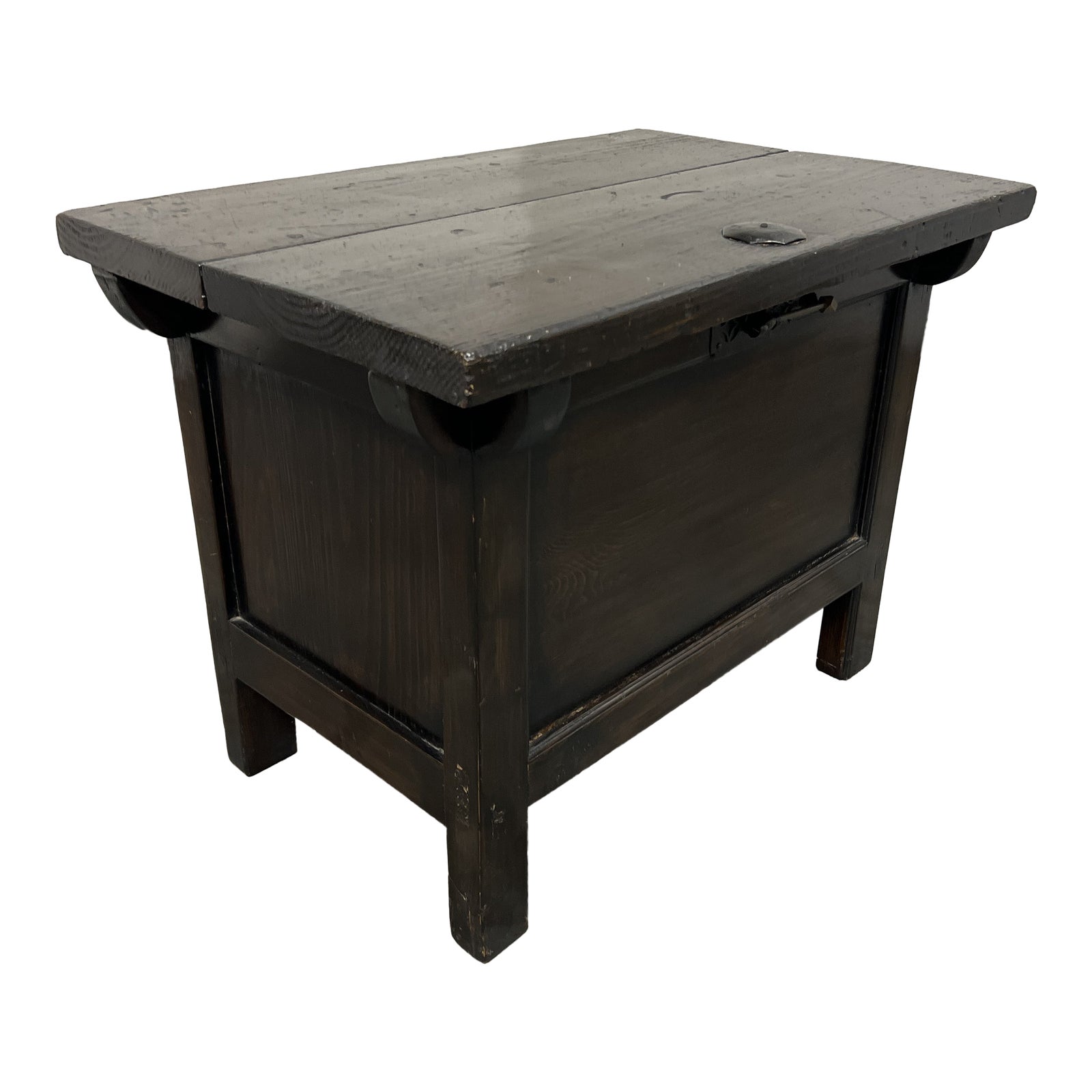 Design Plus Gallery presents an Antique Wood Chest. Rustic in its beauty, the solid wood cabinet is raised slightly on square legs formed from the structure of the box. Unhinged lid opens to undivided storage. Small ironwork details. Still has original rice paper intact. Antique condition, consistent with age and use.