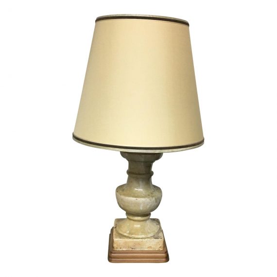 Design Plus Gallery has an Antique balustrade stoneware table lamp. The stoneware balustrade has been glazed in hues of Beige which makes it look like Marble. It sets on a wood base as well as the top has been capped with a wood disk. This beautiful lamp is crowned by a gorgeous custom Silk shade.