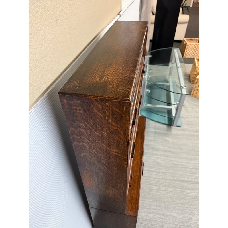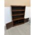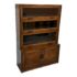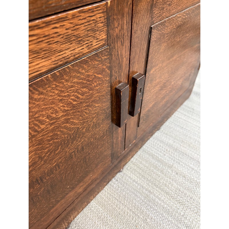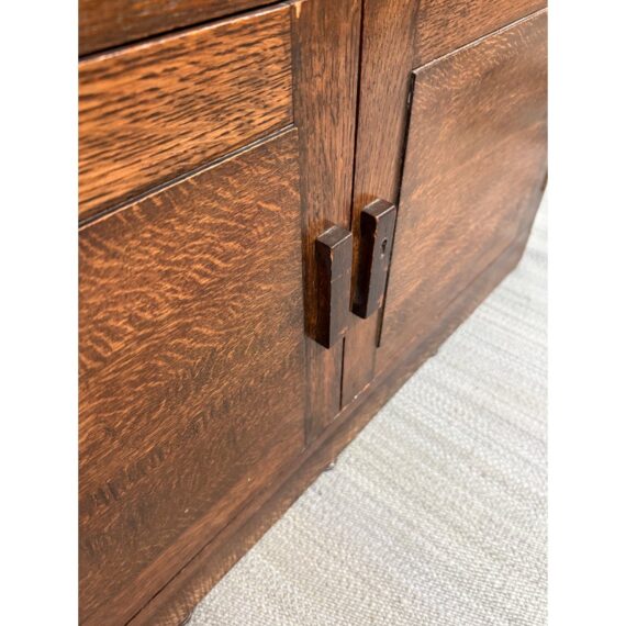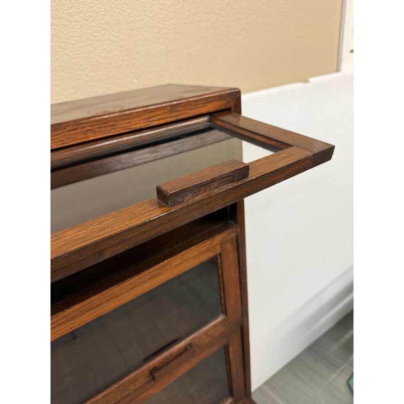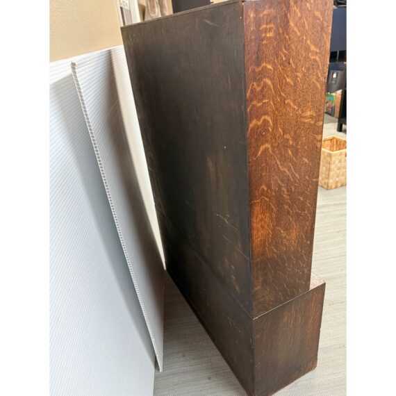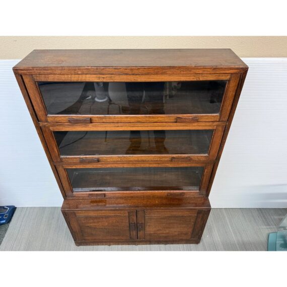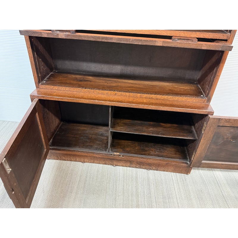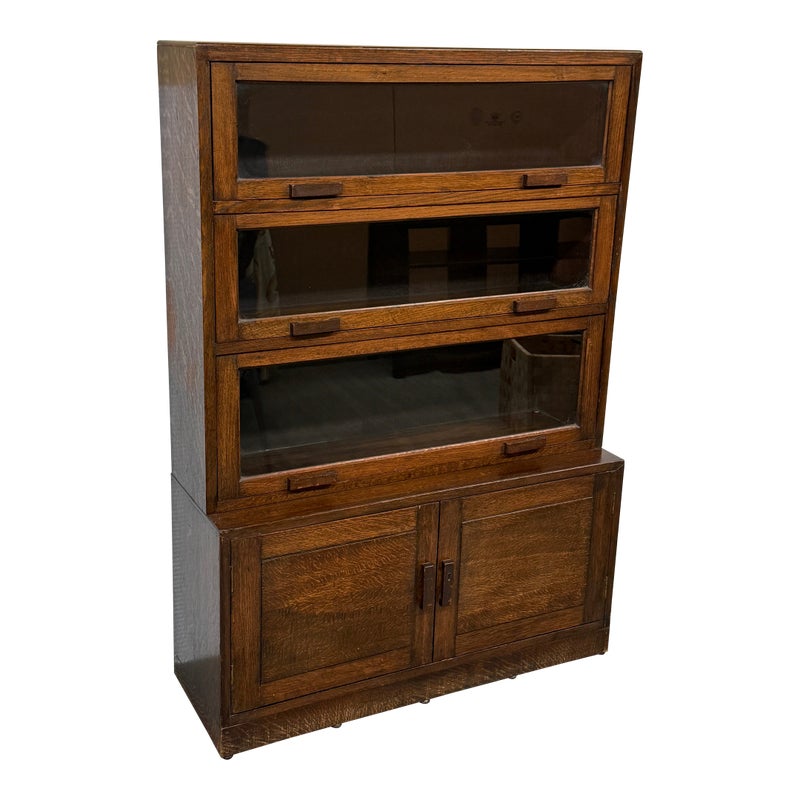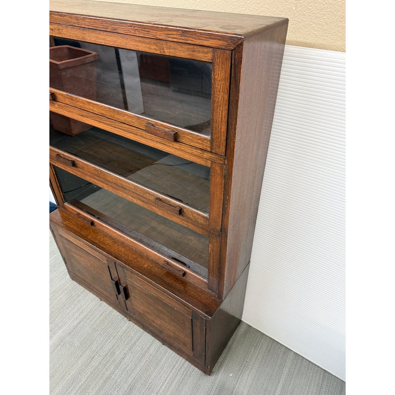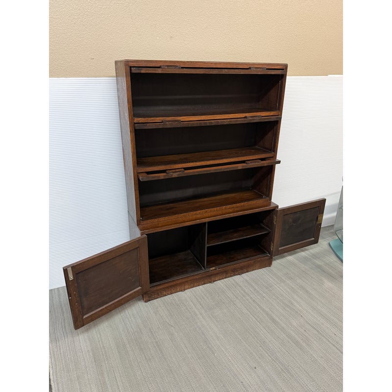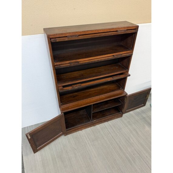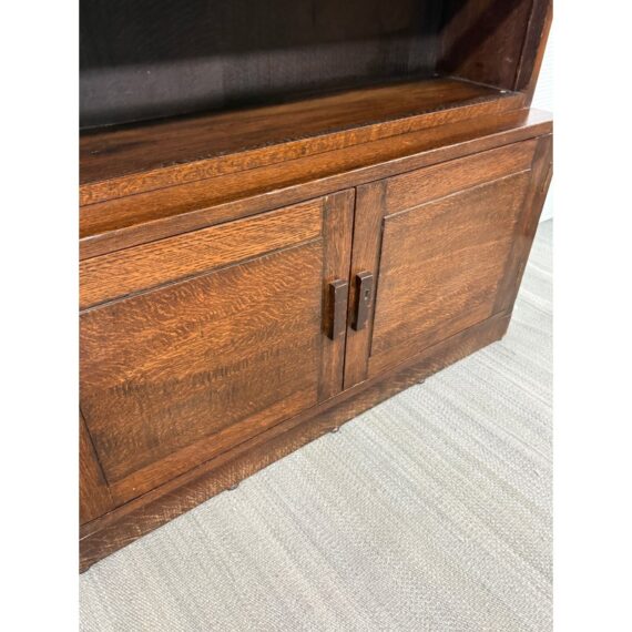 Design Plus Gallery presents an Oak Wood Bookshelf with Closed Storage. The shelving takes a timeless style sense that was popularized in Arts & Crafts furnishings from the Mission era. The oak wood has a dark stain to the frame with three shelves having doors that open from the bottom upwards with glass to expose their contents. The lower section has two cabinet doors with three shelves. It is in good condition with visible wear that is consistent with its antique age.