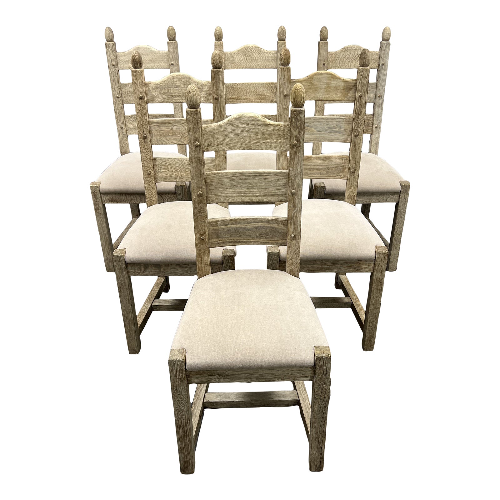Design Plus Gallery presents a Set of Six Wooden Dining Chairs with upholstered seats from Belgium. A farmhouse shape, with four square legs joined by a strut, and a wooden backrest made of three slats. The seat is upholstered in a soft cream color. The light finish of the restored wood draws out a handsome grain. The arched upper slat of the backrest and acorn shape accents provide charming decorative notes. Some spotting on the seat cushions but they are in relatively good condition.