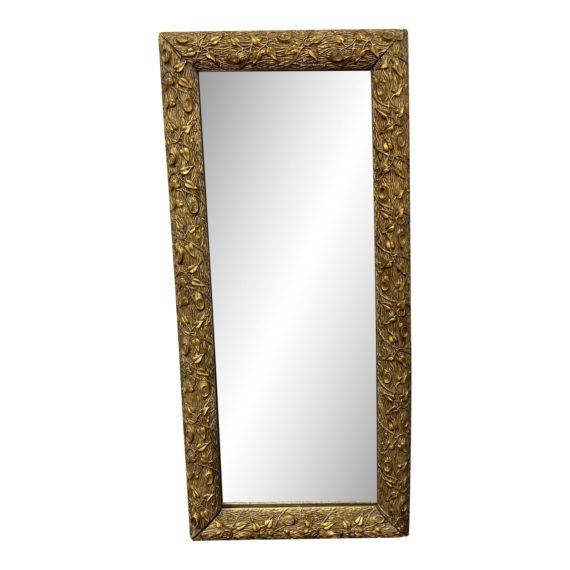 Design Plus Gallery presents the Antique Botanical Frame Gold Finish Mirror. A rectangular mirror is secured in a frame that is finished in gold. All around the frame are botanical accents that give the mirror a natural appeal. Visible corner chipping and minor wear on the corners from use; mirror is in good condition.