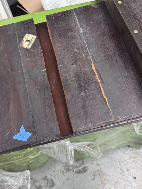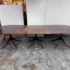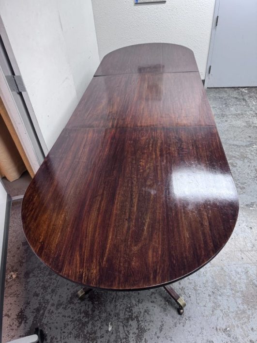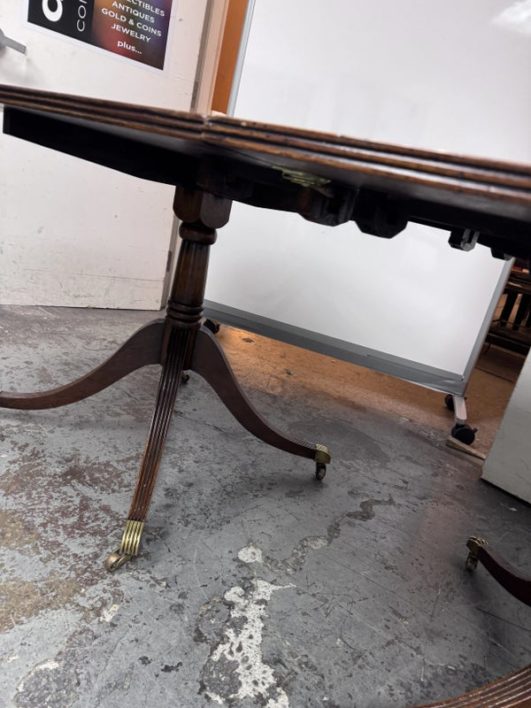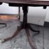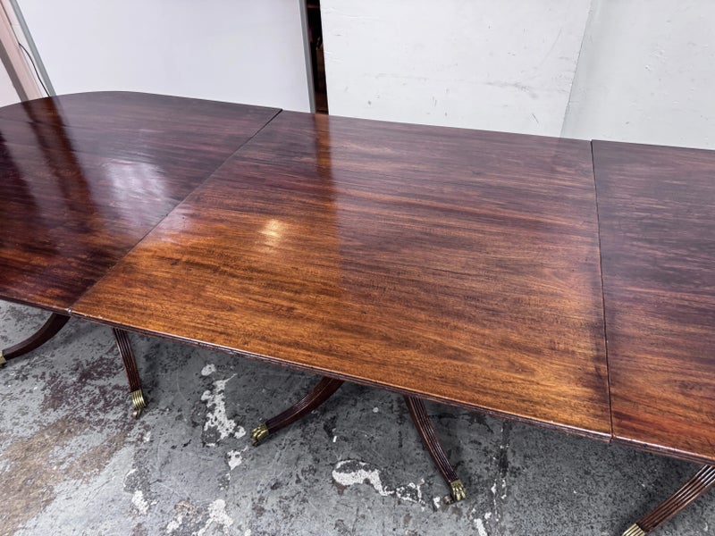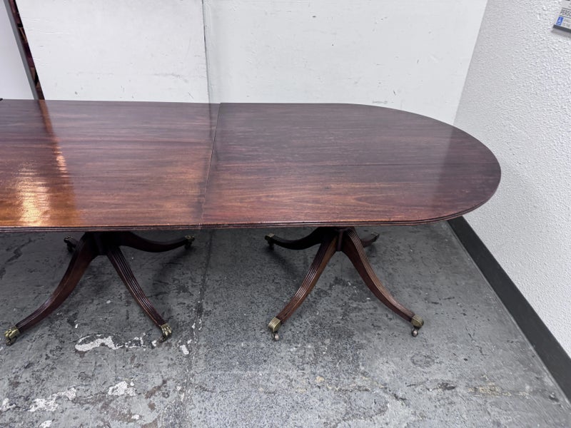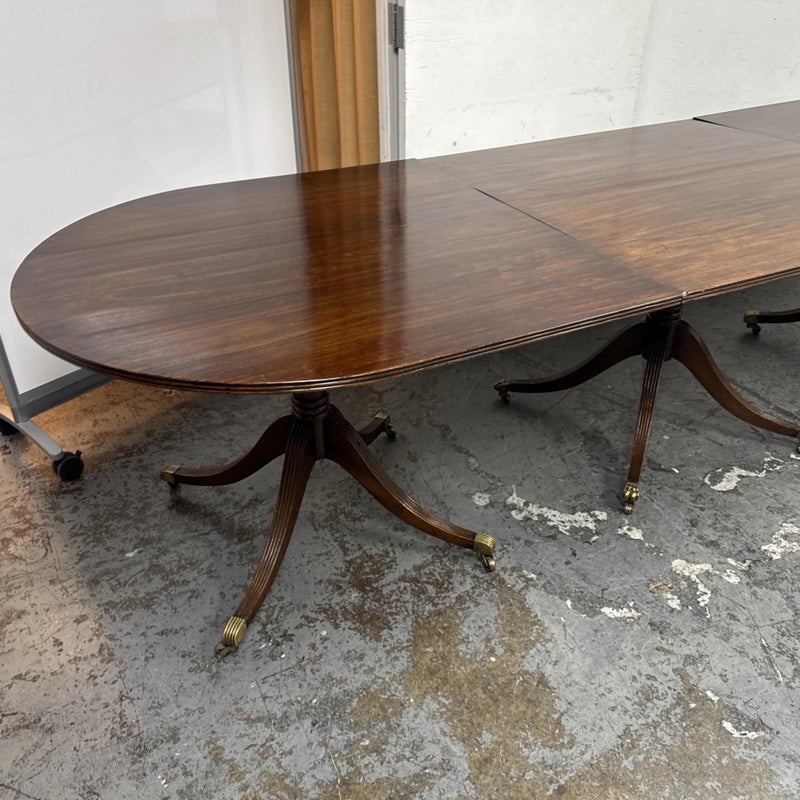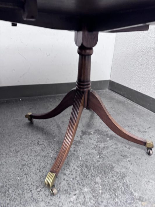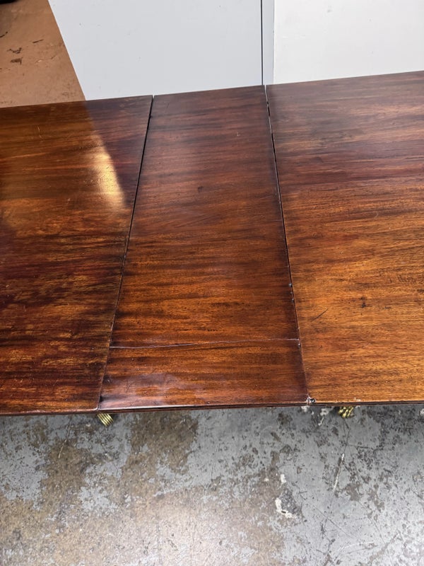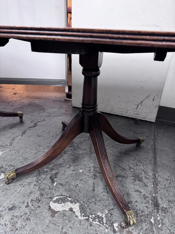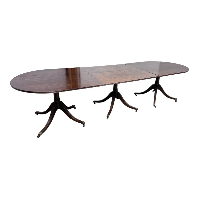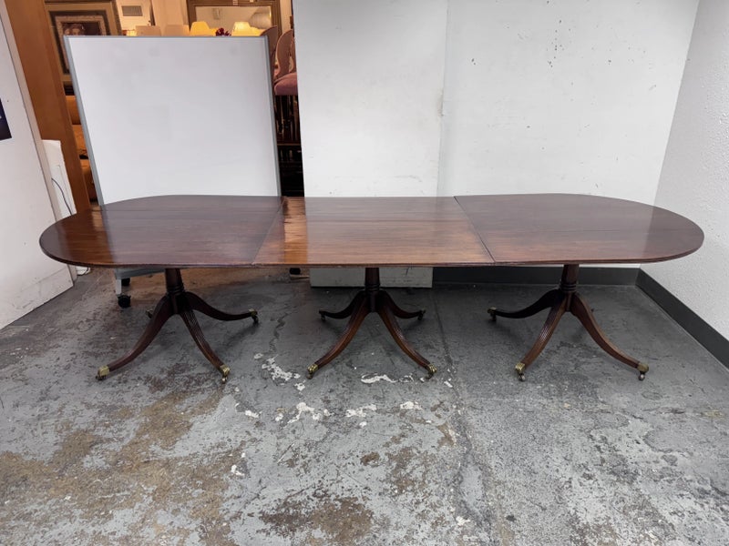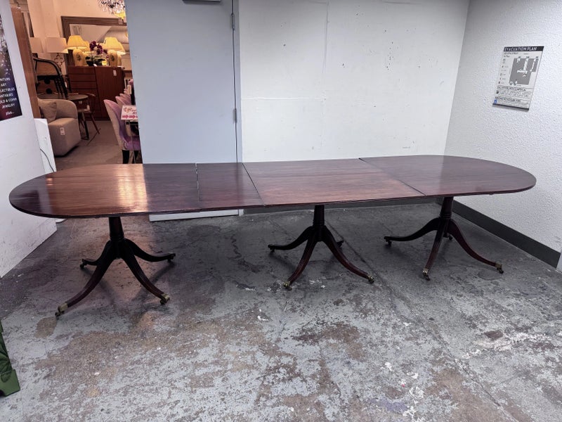Design Plus Gallery presents an Extension Dining Room Table Likely Antique in Age. The unique table has three pedestal bases each having four feet with antiqued brass tips. Great table for a grand dining room as entertaining could be plentiful. The middle section can be segmented and stand on its own for space constraints too. Is in good condition for its antique usage.