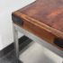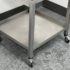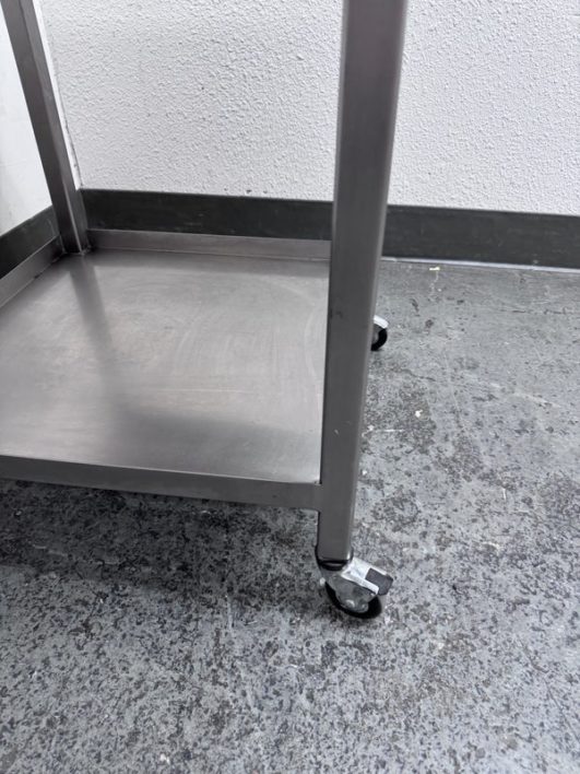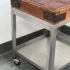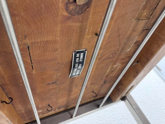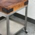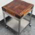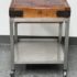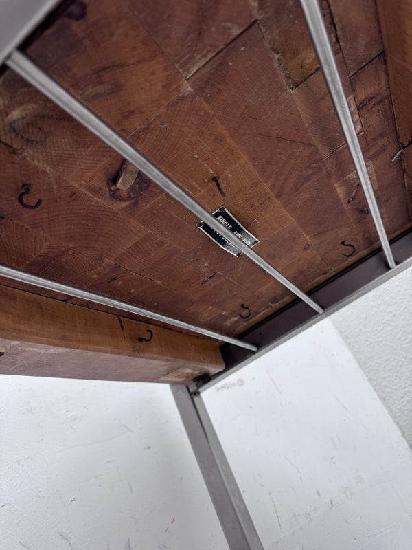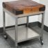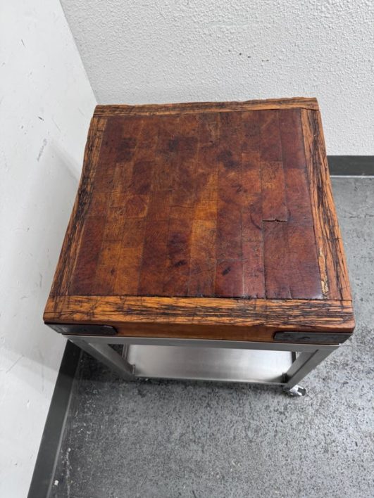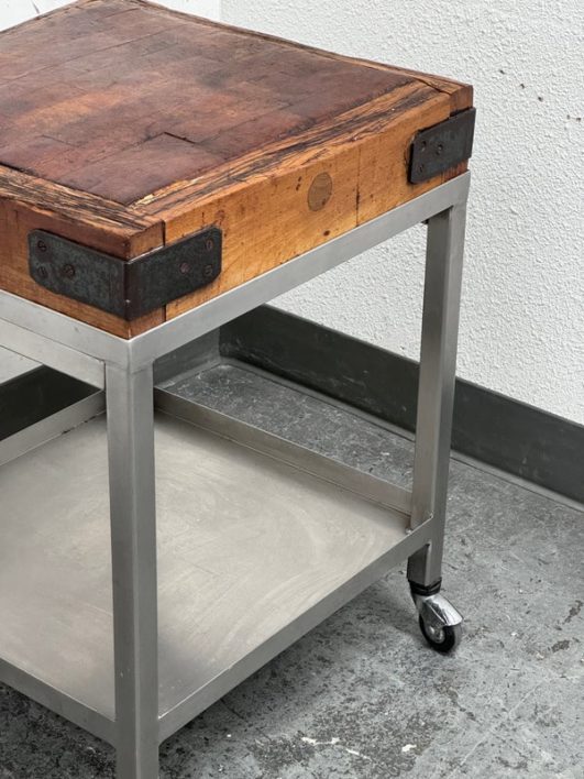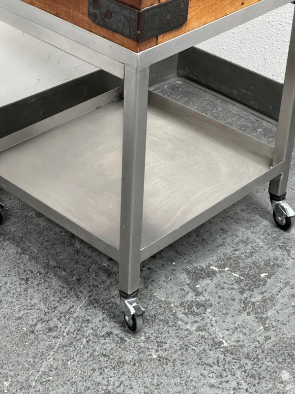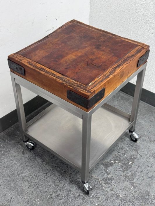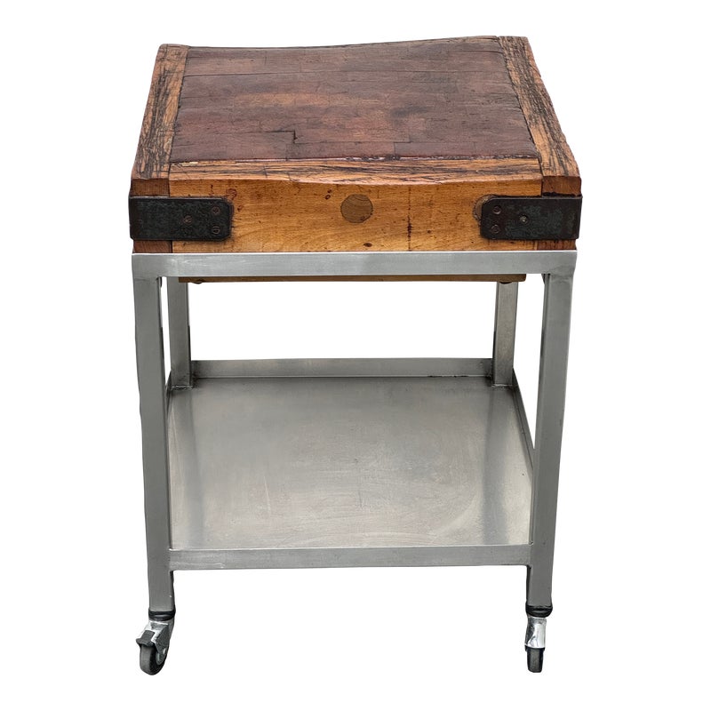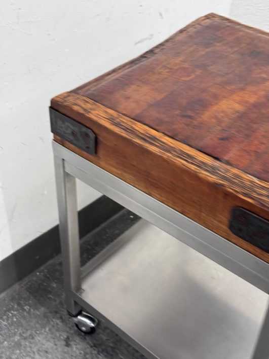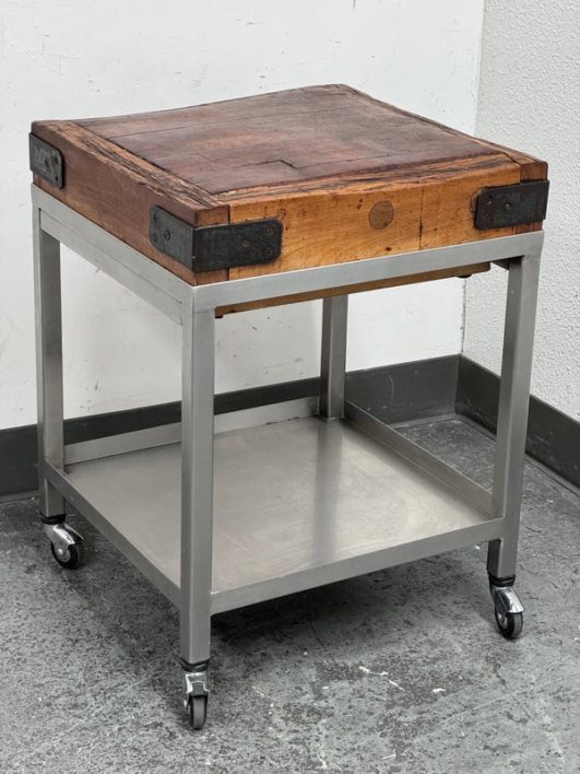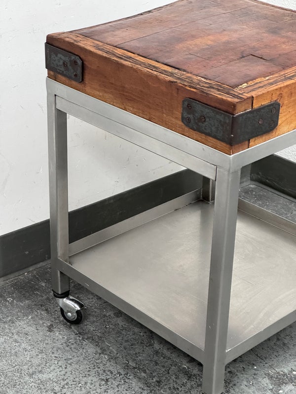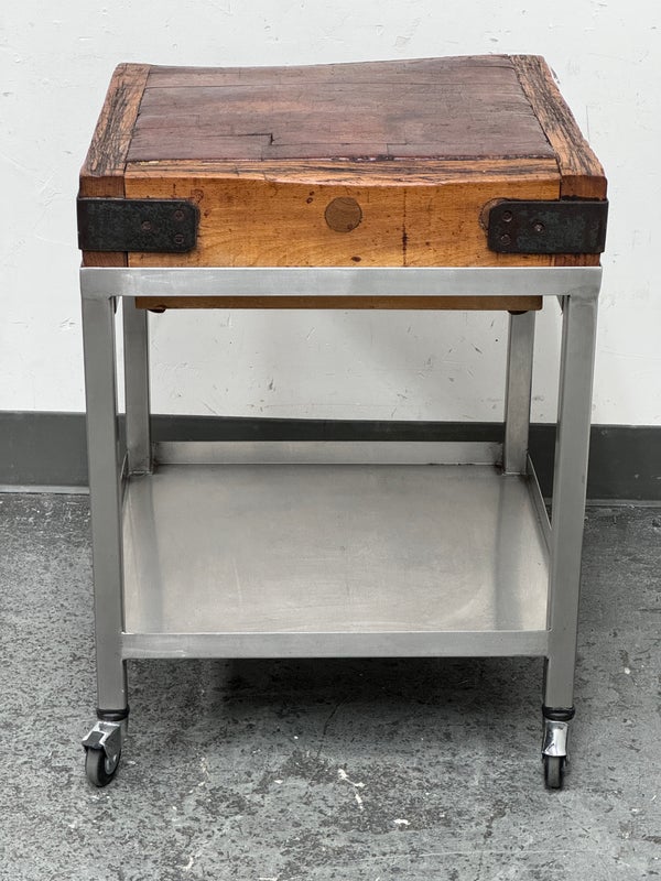 Design Plus Gallery presents a Well Treated Butcher Block on Wheels. The stainless steel cart is on casters, has a lower shelf and is a heavy duty sturdy industrial cart. The solid thick cut wood has been consistently cleaned with wood oil that is safe for edible consumption. Custom made in Mendocino, California. Is in very clean and good condition.