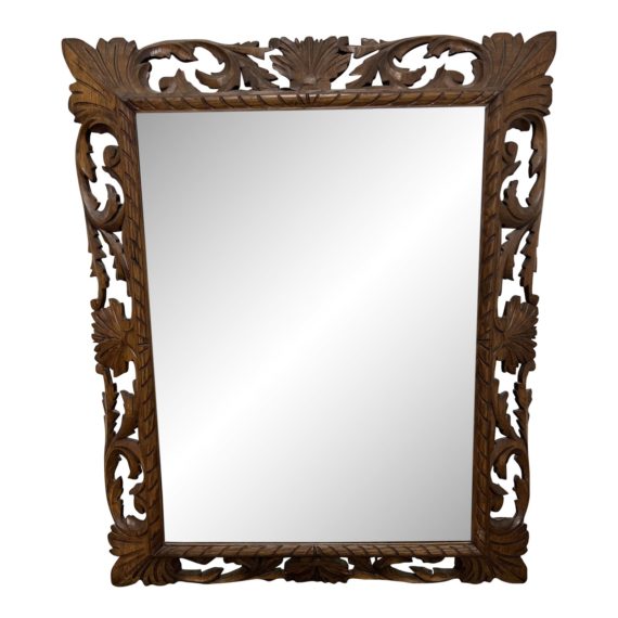 Design Plus Gallery presents a Carved Oak Acanthus Leaf Mirror. A sprawling perimeter is beautifully accented to layer with wall colors and coverings. The acanthus leaf design is symmetrical with accents on the the corners and crown of the mirror. There is minor wear through out, mirror is in good condition. Mirror is wired for vertical orientation.