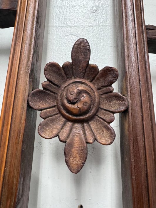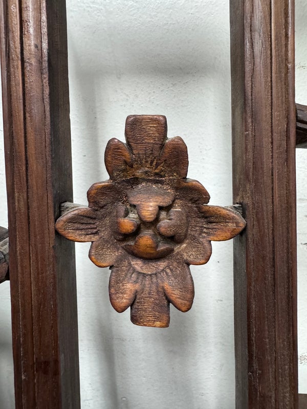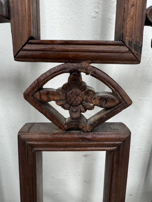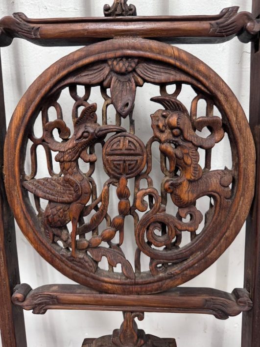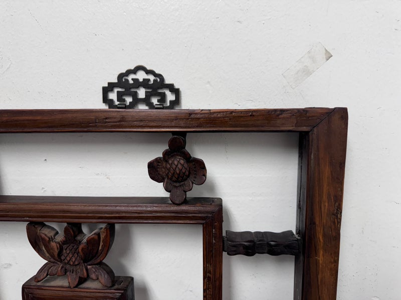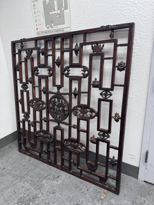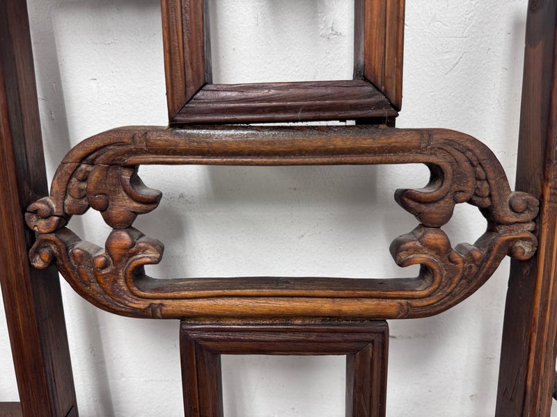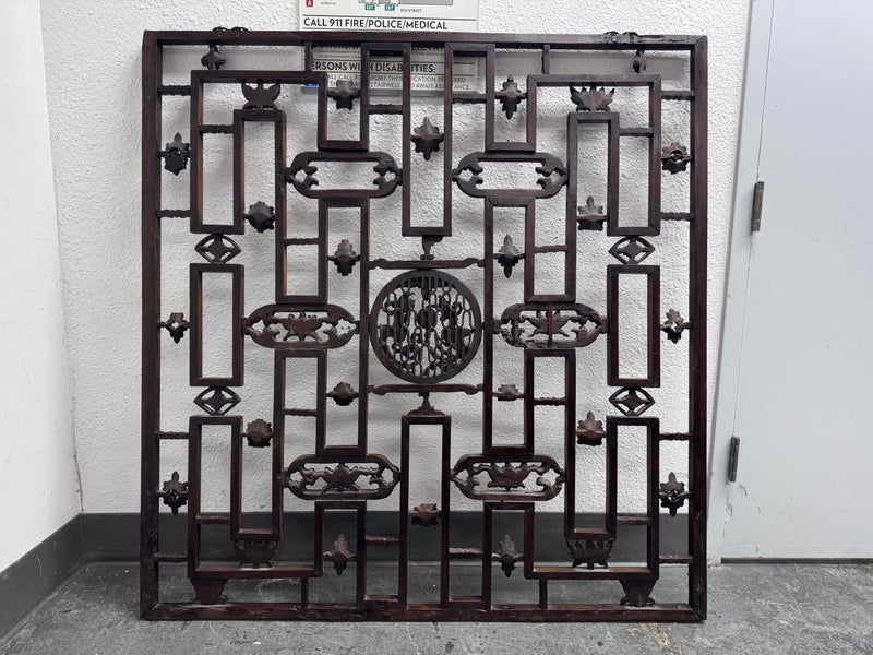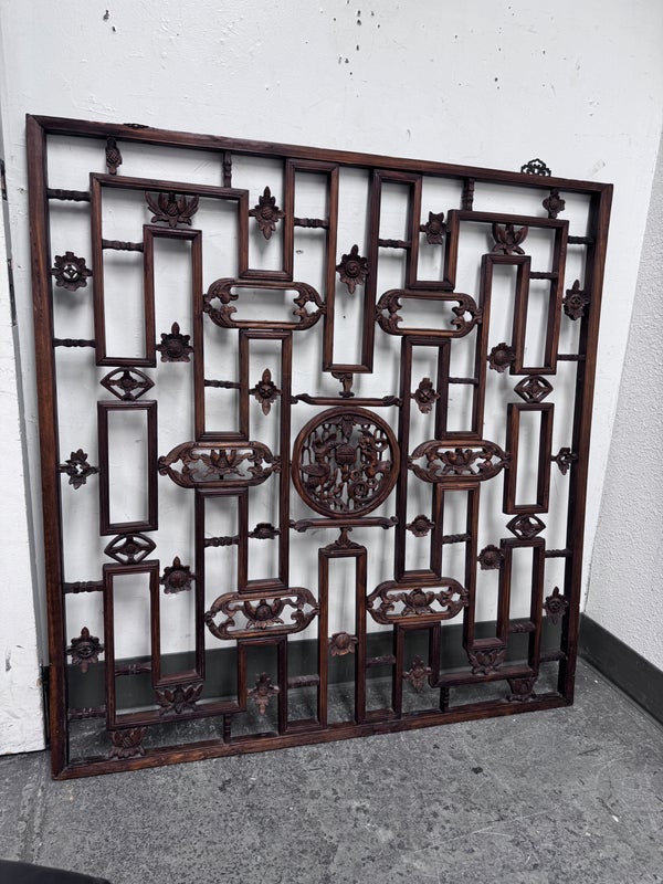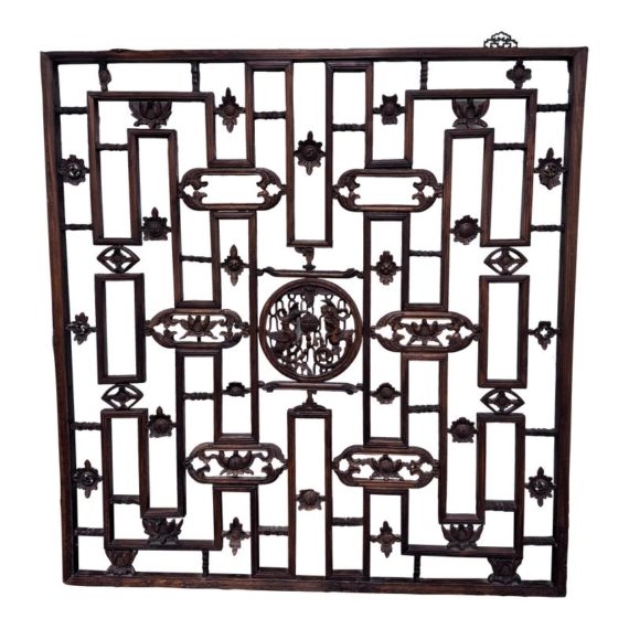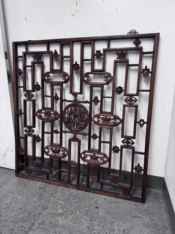 Design Plus Gallery presents an Antique Carved Trellis Style Chinese Window Panel. The symbolism of is longevity and happiness is replicated throughout in various stylized forms. It’s various forms are expressed as a reminder of the many ways we are blessed with good luck and fortune in our lives. Likely of the 19th Century and made entirely of rosewood with carved characters repeating itself. Is in good condition for its antique age.