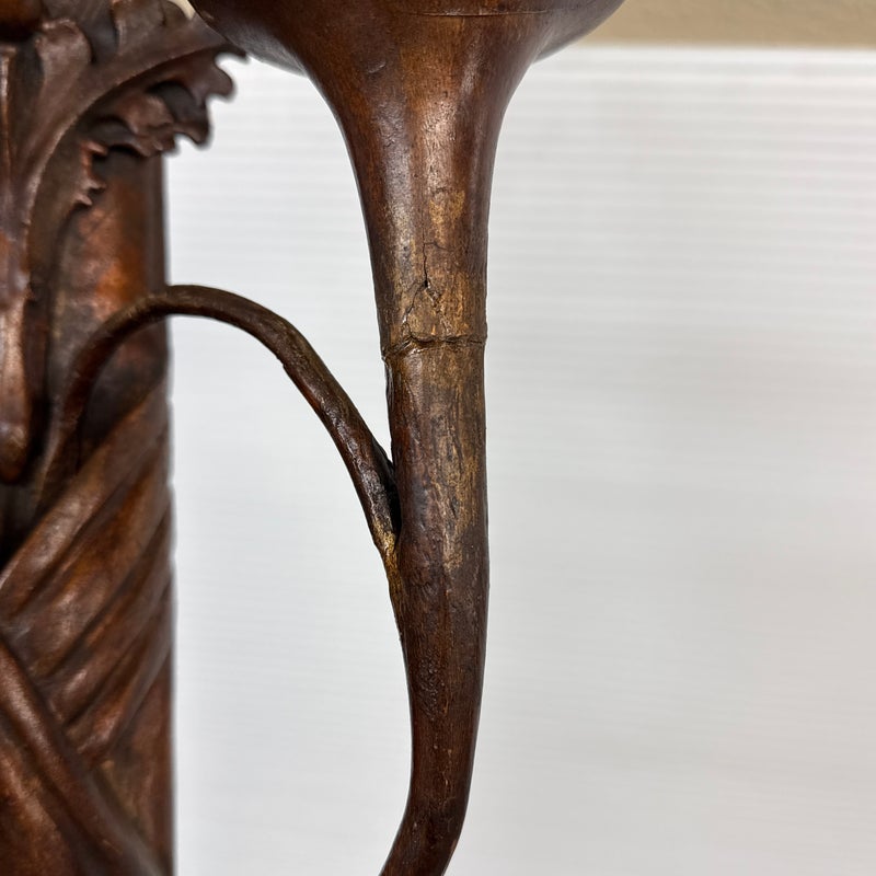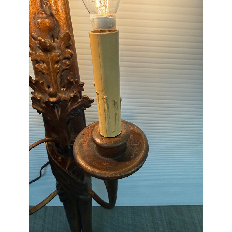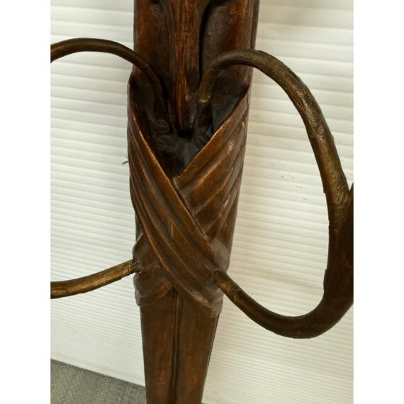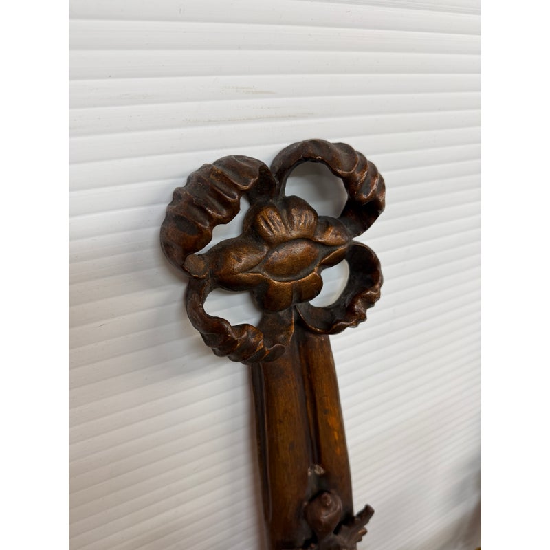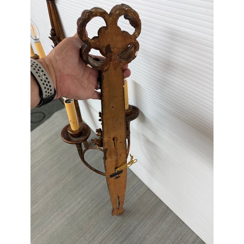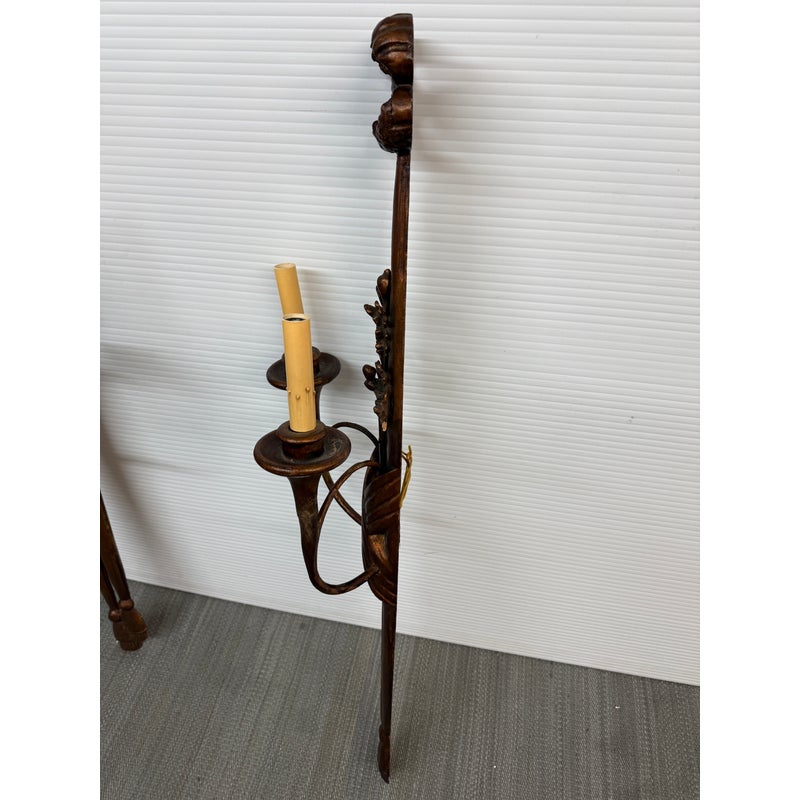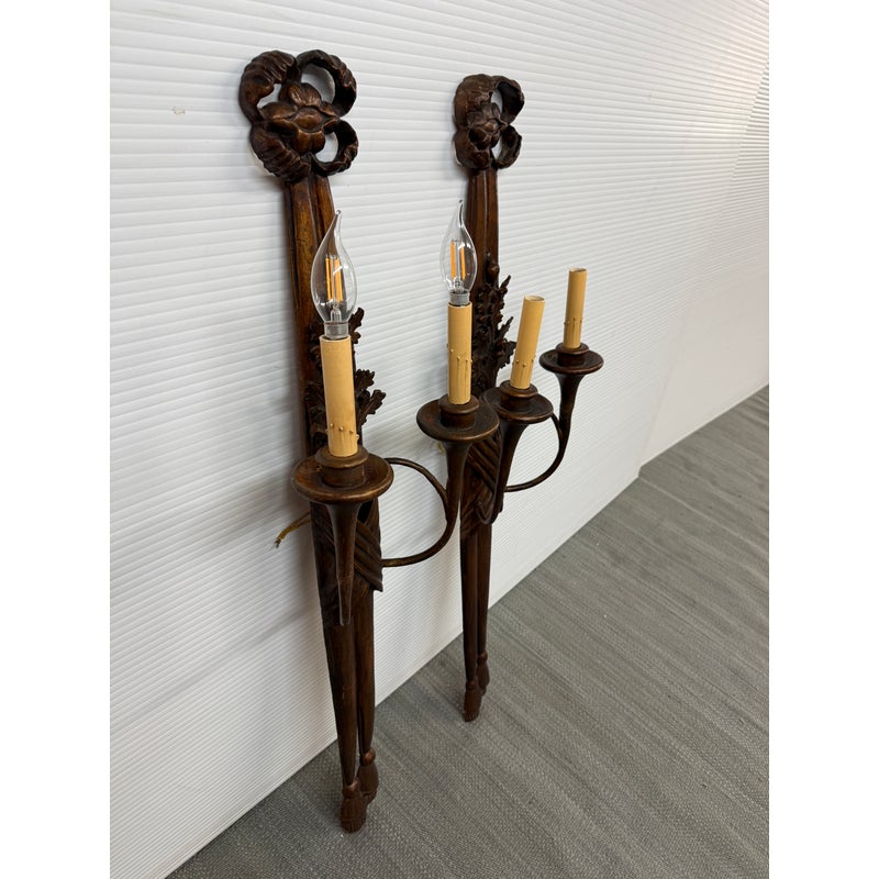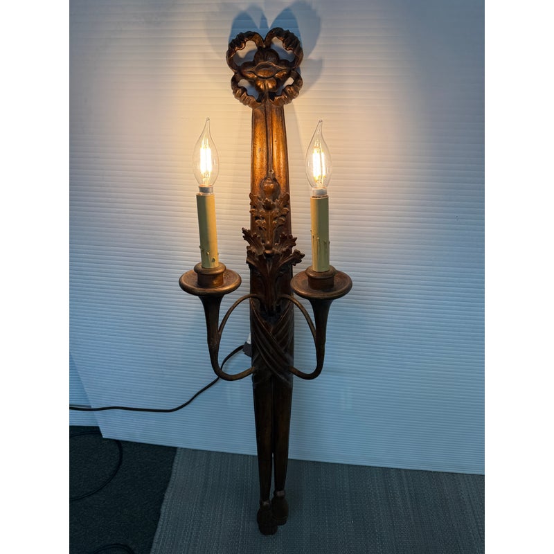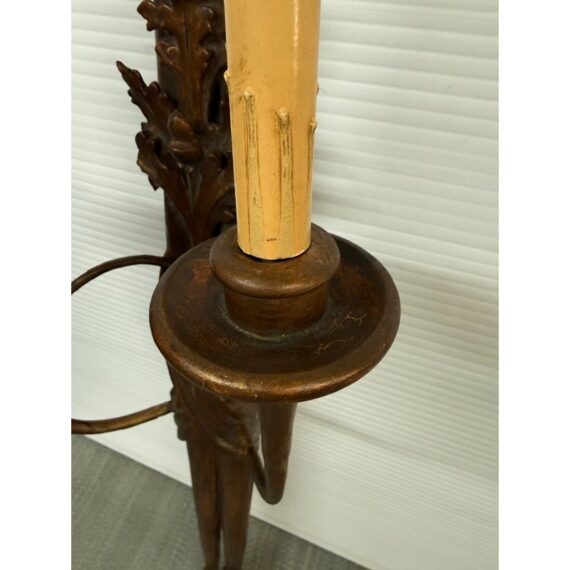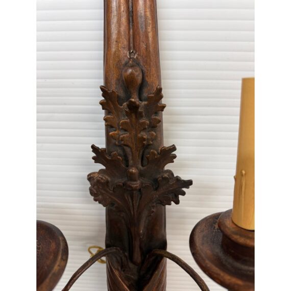 Design Plus Gallery presents a Pair of Antique Wall Sconces. The beautiful pair do homage to the mighty oak tree with acorn and curling leaf motifs. They are carved to mimic tasseled wall candlesticks with “candelabra” bulbs for illumination (not included). Visible wear consistent with age; repair as shown.