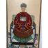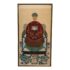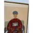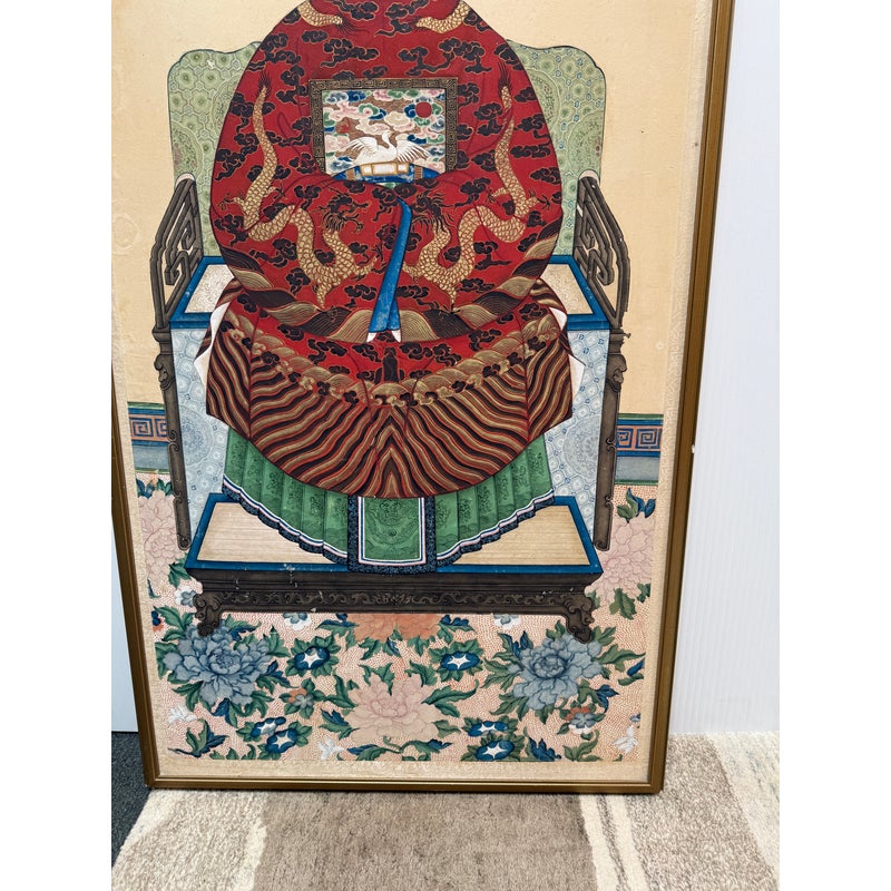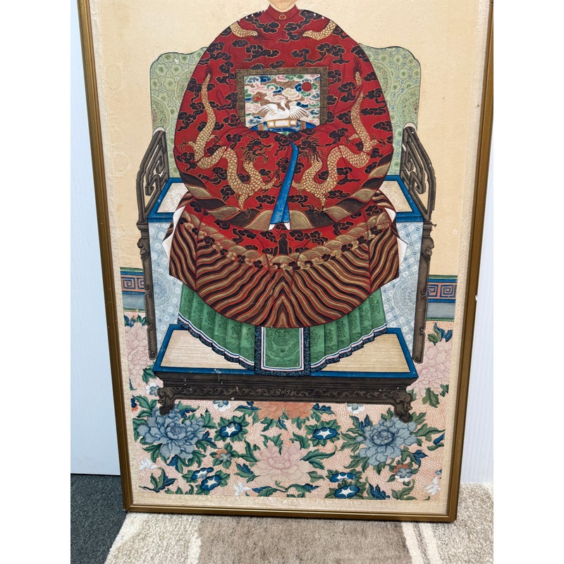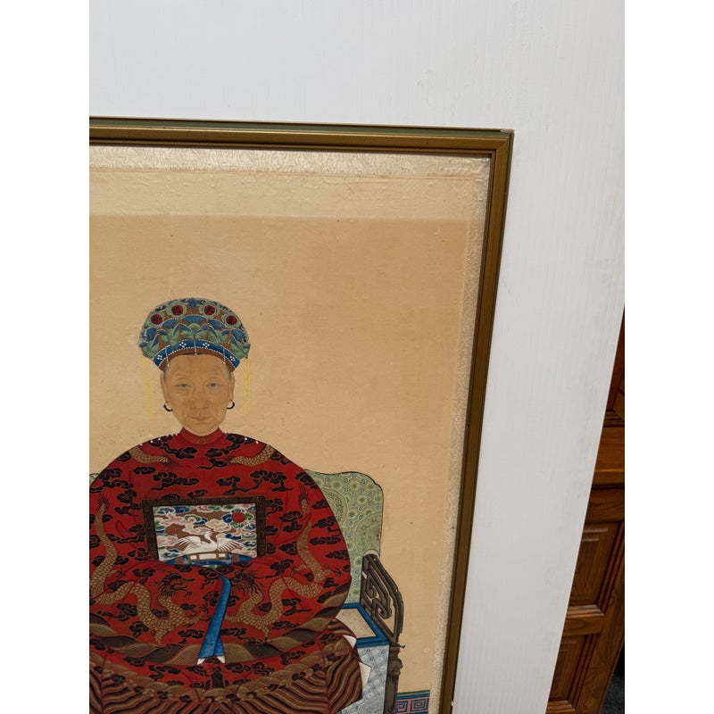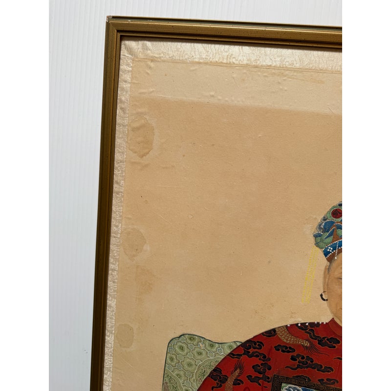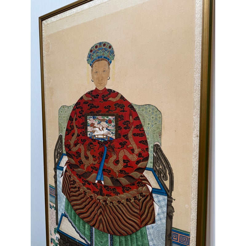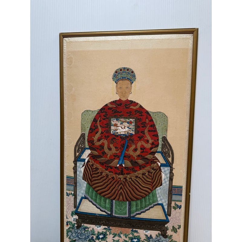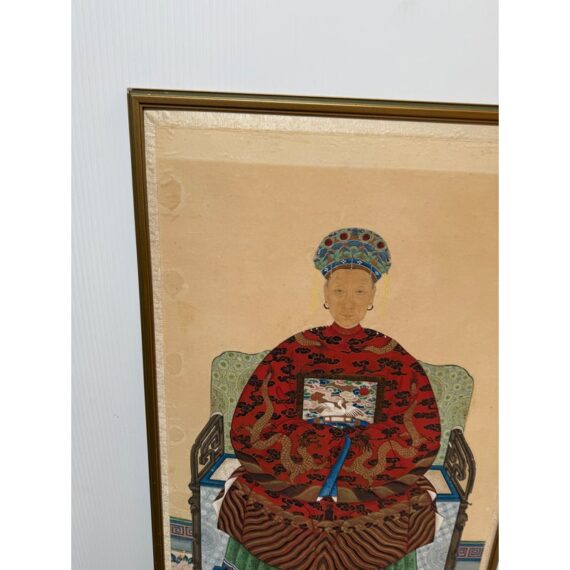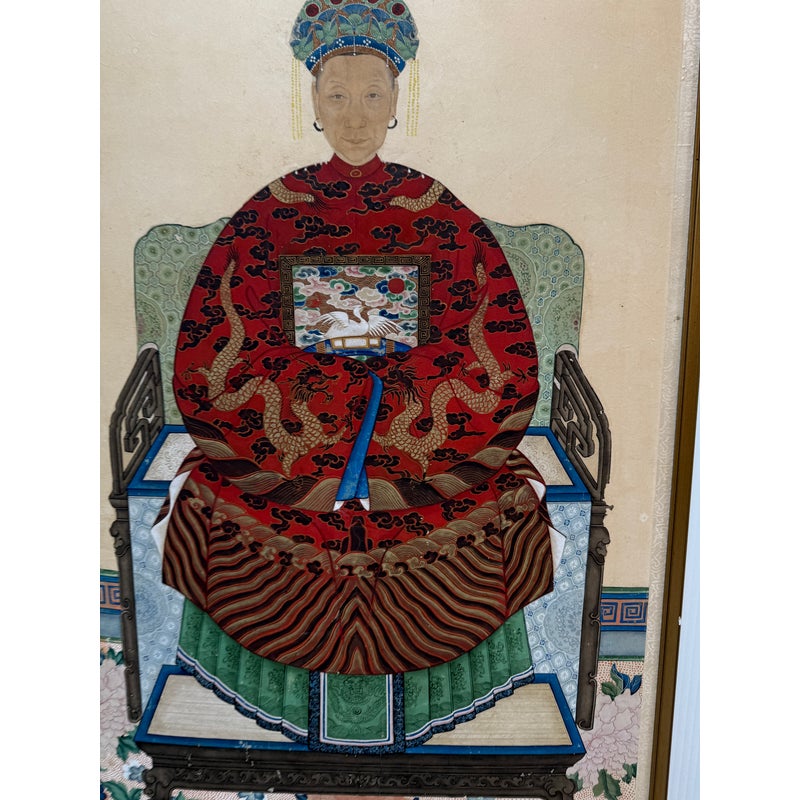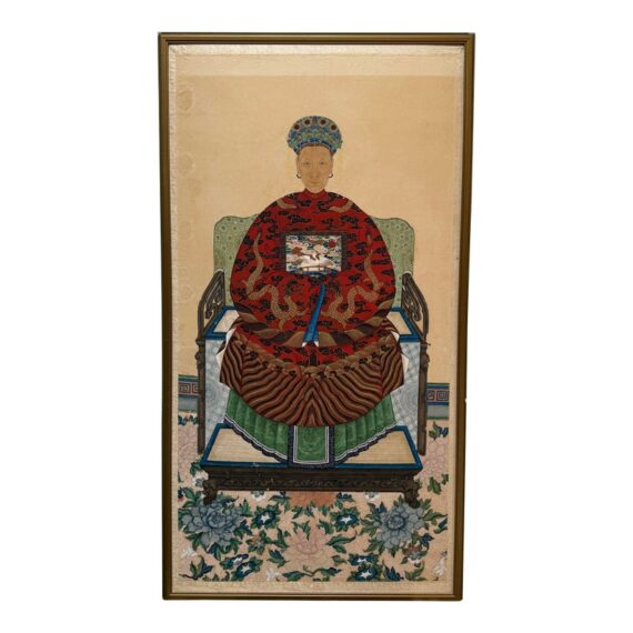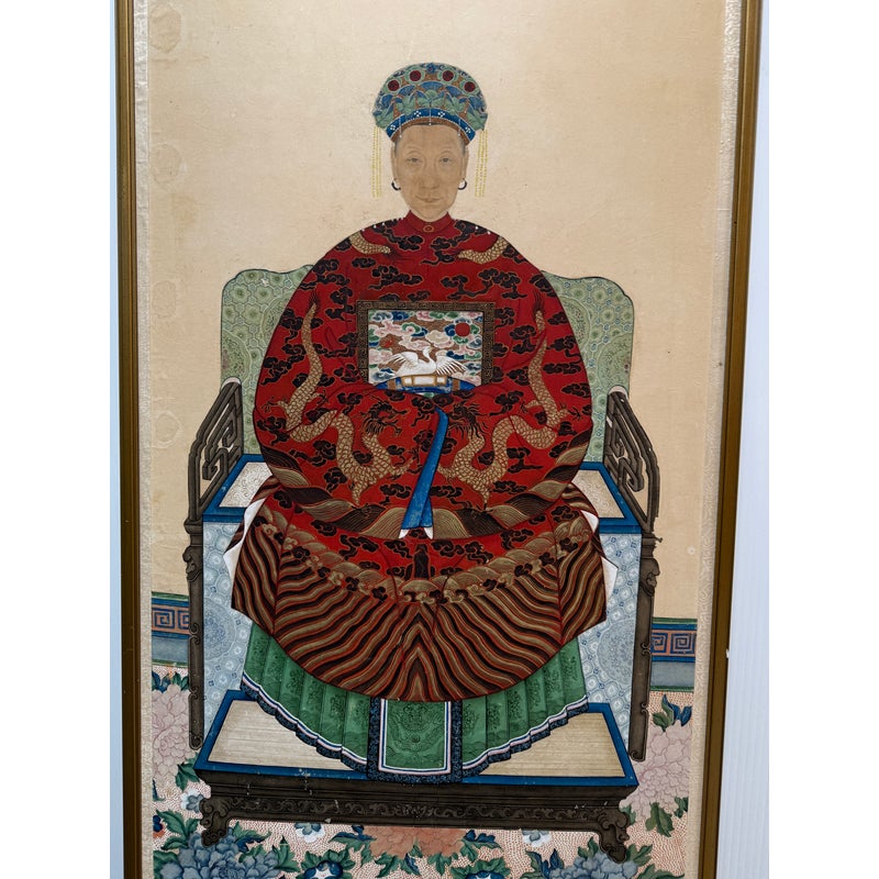 Design Plus Gallery presents an Antique Chinese Ancestral Portrait with stork and floral symbols. This type of commemorative painting was commissioned by families as a representation of family lineage, as a way of honoring and paying respect to one’s elders. Each painting, finely detailed, portrays a family member in a type of formal attire that directly relates to their social or professional status. Other components such as headgear, jewelry, furniture, and even hand placement can represent certain characteristics of wealth, and cultural significance. The painting is natural pigments (gouache) on heavy paper. Matted in silk and mounted in a slim green and gold wood frame. Visible soil and glue marks; condition is fair for antique age and use.