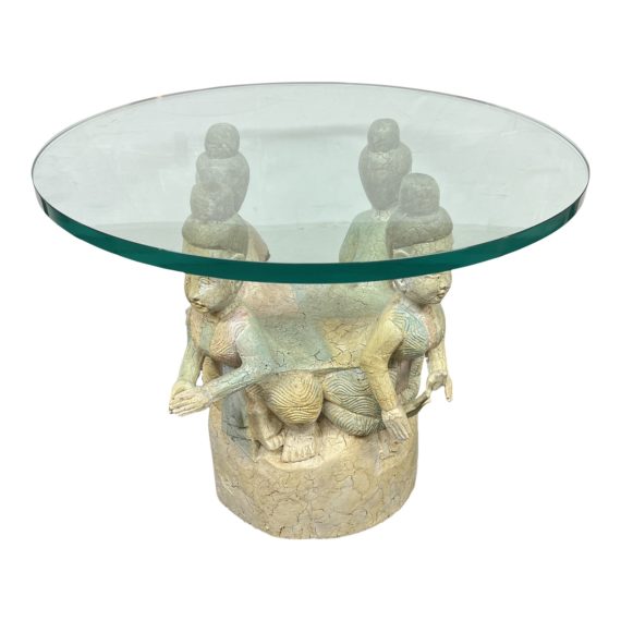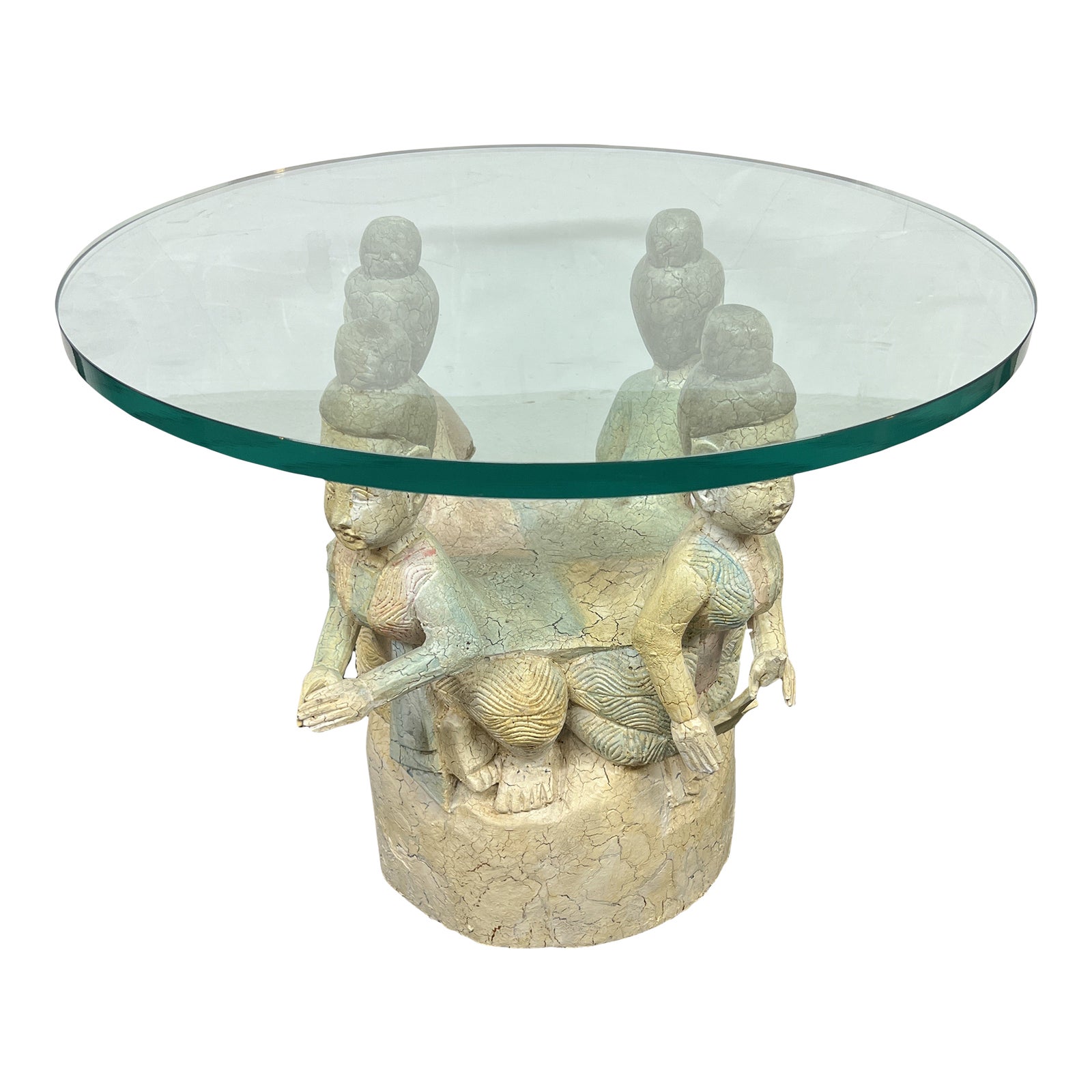 Design Plus Gallery presents an Antique Side Table. The base is an incredible tableau of women in a circle, carved from a single piece of wood. Hand painted and topped with a thick round of glass, it becomes a stunning focal piece. Antique condition, two arms are cracked, visible surface wear; no chips in glass.