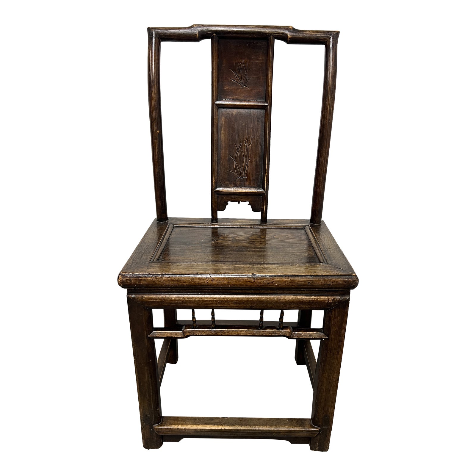 Design Plus Gallery presents a Chinese Antique Elm Chair. Solid joinery has a time loved patina and beautiful shapes carved into the wood. There is minor wear through out due to age, chair is in good condition. Back splat curves with raised panels. Box trestle reinforces the integrity of the sold elm with a decorative apron.