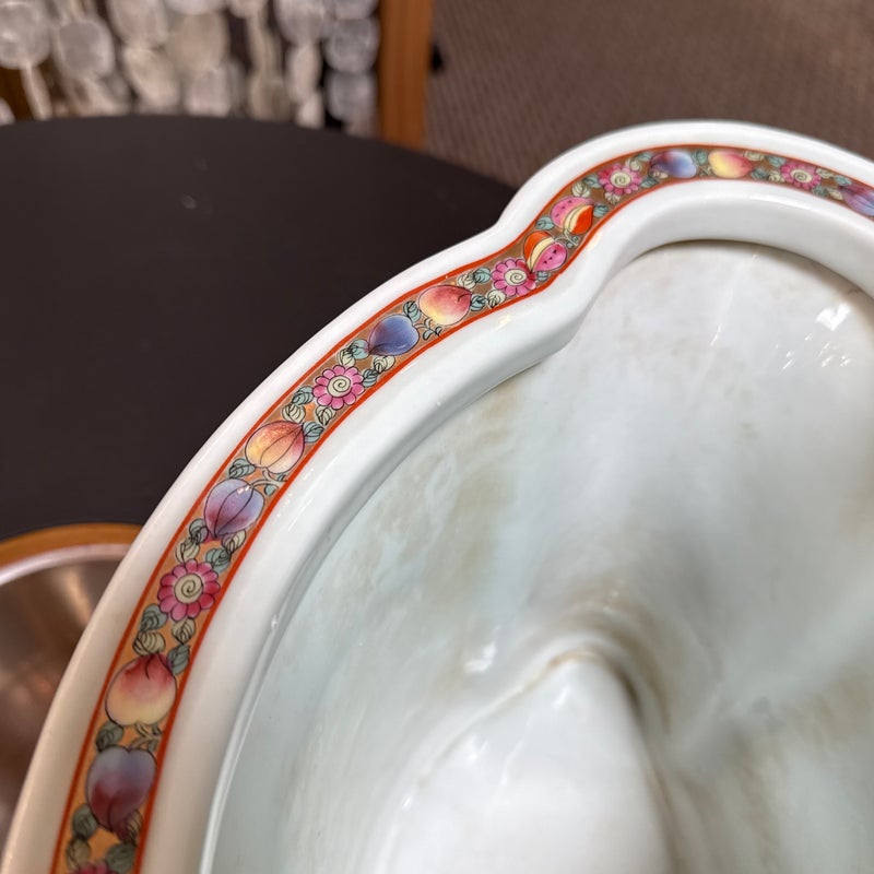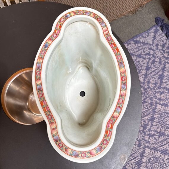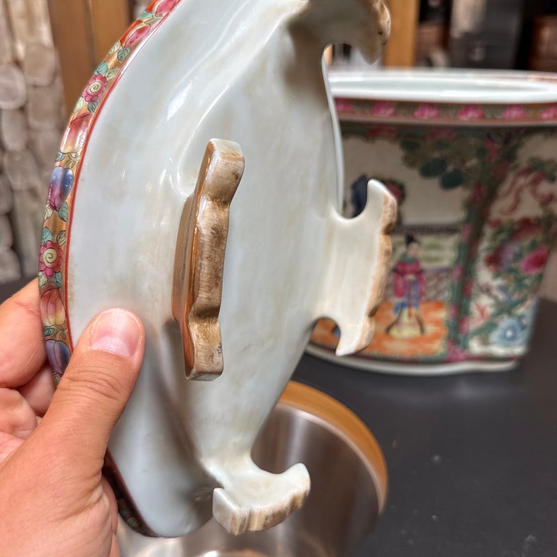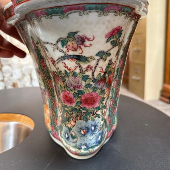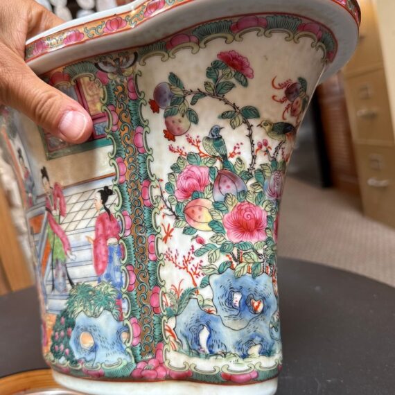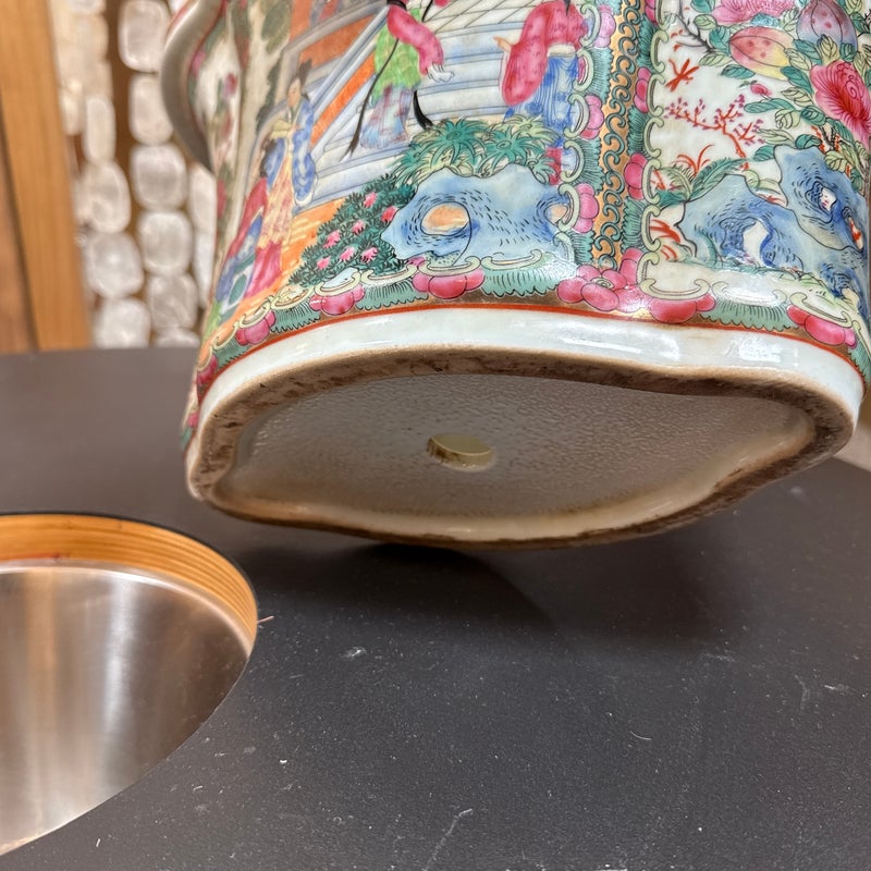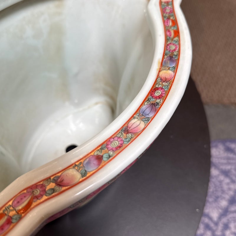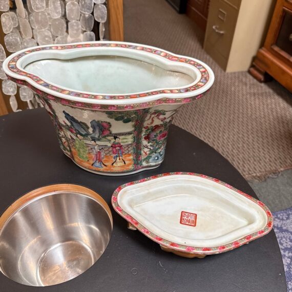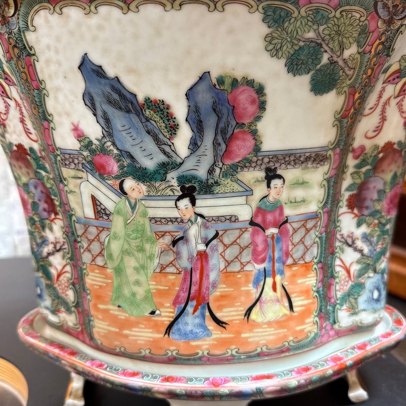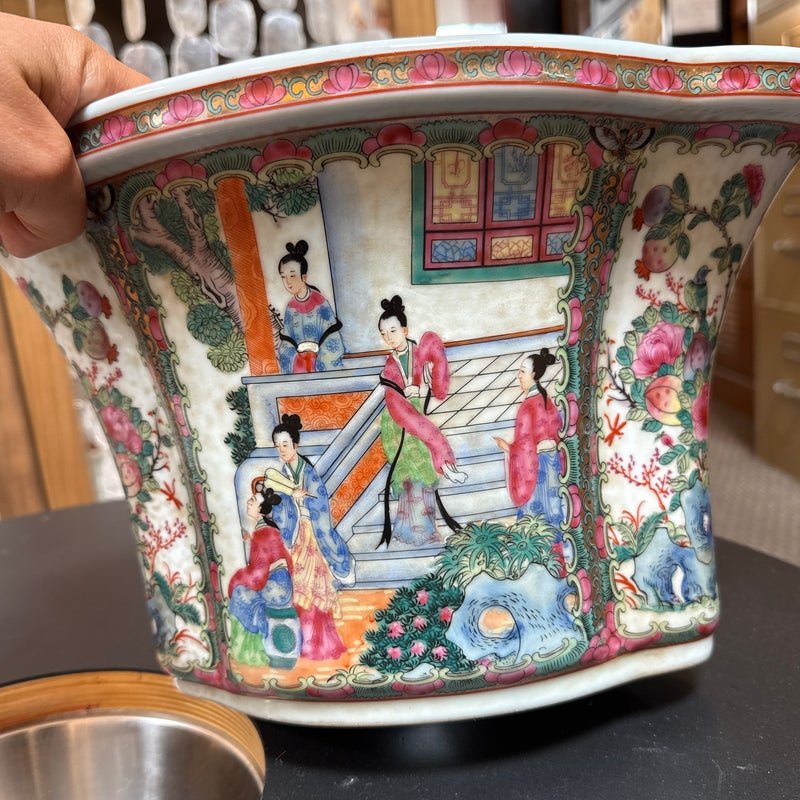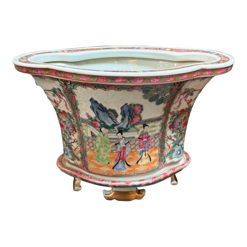 Design Plus Gallery presents an Antique Chinese Famille Rose Jardiniere. Early 20th century for export, the porcelain is know by its opaque overglaze rose hue, that were introduced by Europe in the mid 17th century. Intricately hand painted venues depicting scenes indoors and out. The large cachepot has an oblong, lobed body and matching under tray. Light surface wear; condition is consistent with age and use.