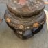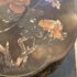 Design Plus Gallery presents an Antique Chinese Floral Stool. The image showcases a beautifully crafted wooden stool that appears to be of Asian origin, featuring an intricate design with ornate and painted motifs, showcasing delicate flowers and vines. The stool’s top is petal shaped and the base has carved openings that create a visually appealing structure. A fine decorative piece saved for use as a side table or pedestal. Paint details are worn in places; Condition is fair for age and use.