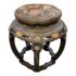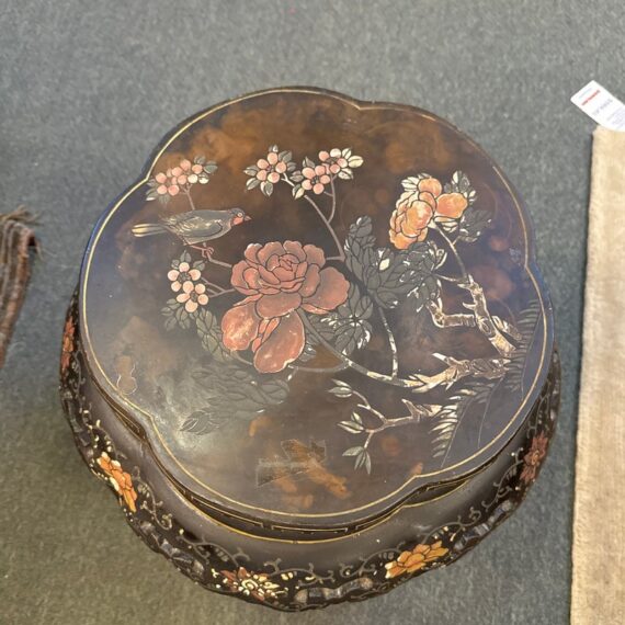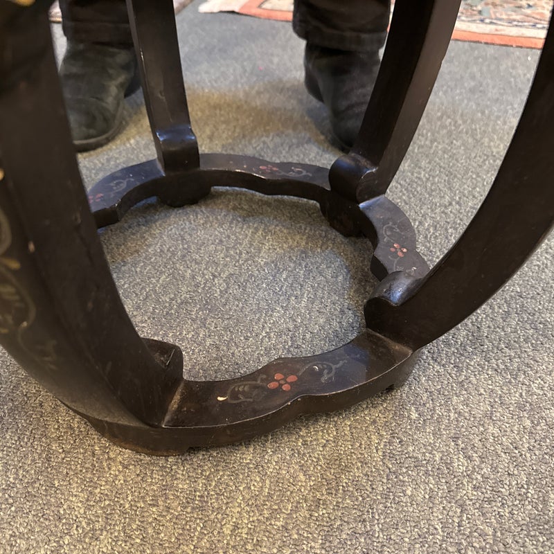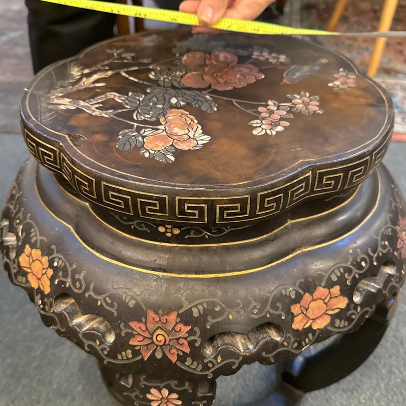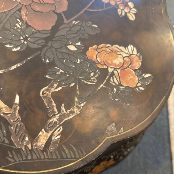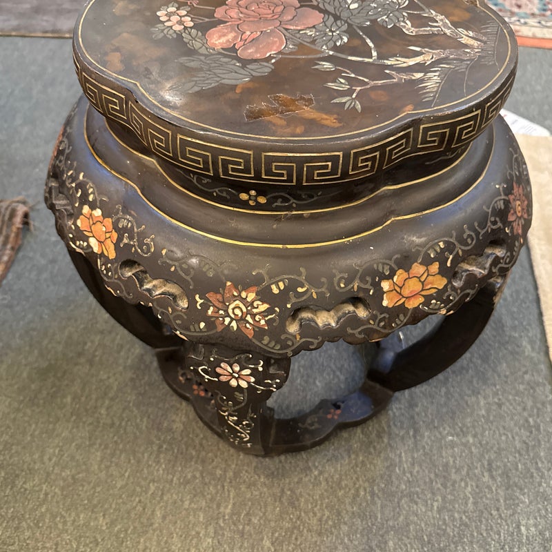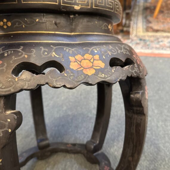 Design Plus Gallery presents an Antique Chinese Floral Stool. The image showcases a beautifully crafted wooden stool that appears to be of Asian origin, featuring an intricate design with ornate and painted motifs, showcasing delicate flowers and vines. The stool’s top is petal shaped and the base has carved openings that create a visually appealing structure. A fine decorative piece saved for use as a side table or pedestal. Paint details are worn in places; Condition is fair for age and use.