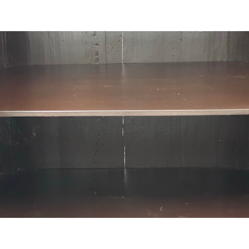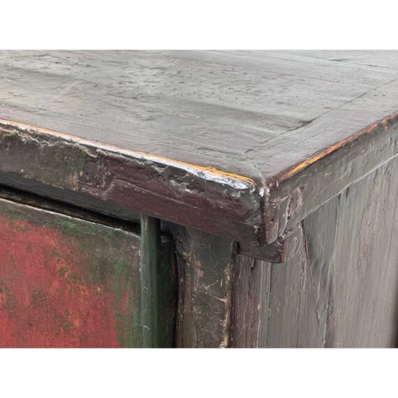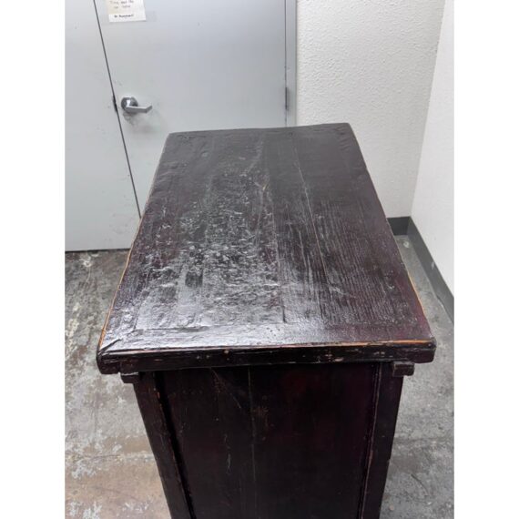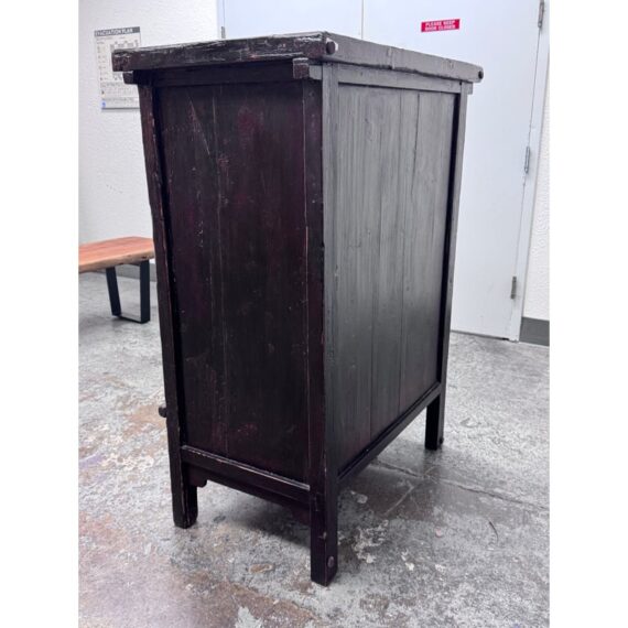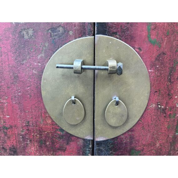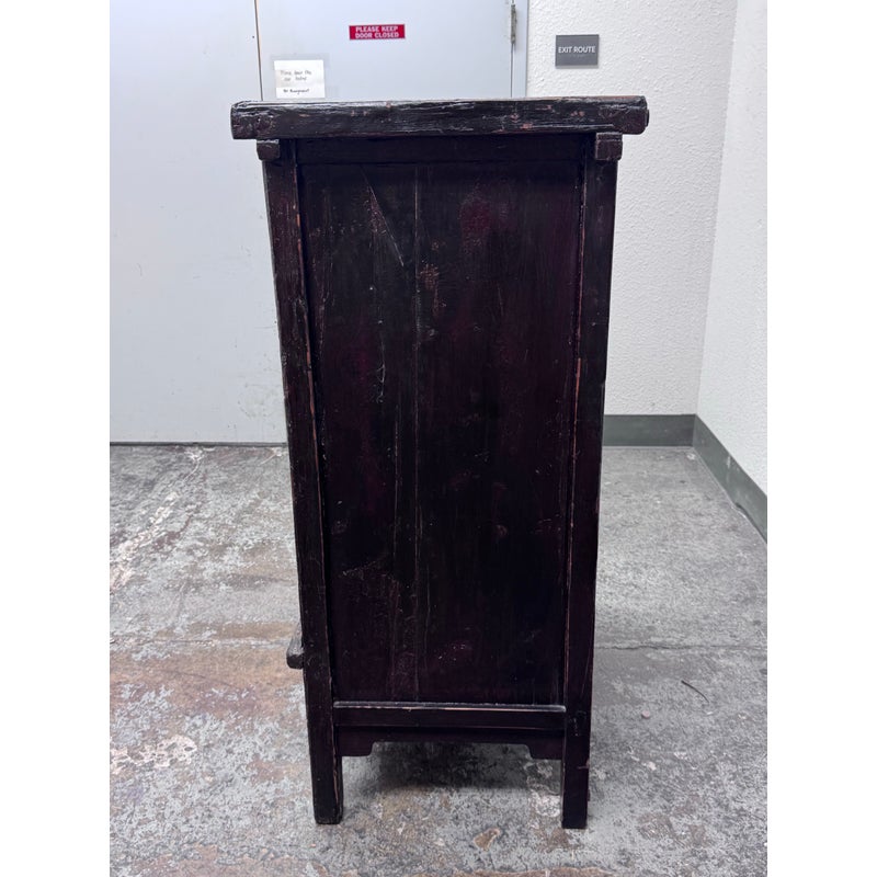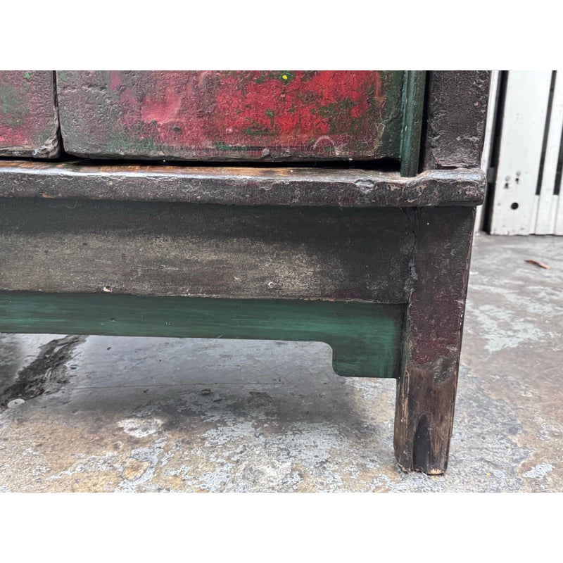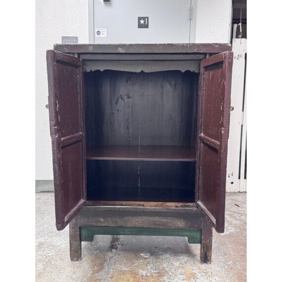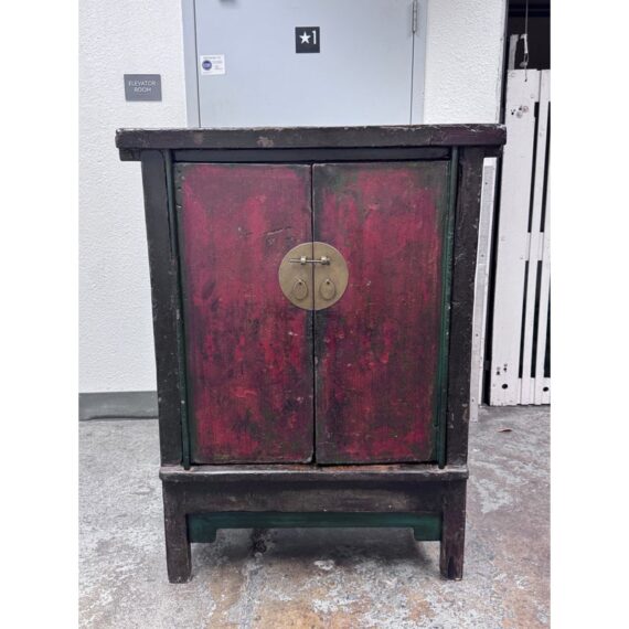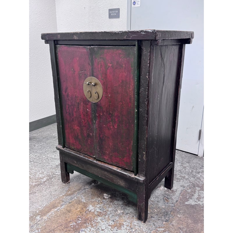 Design Plus Gallery presents an Antique Chinese lacquered Cabinet. A two-door cabinet in the Qing Dynasty “wedding cabinet” style, scaled as a small armoire or bedside cabinet. Crafted from solid wood with traditional mortise-and-tenon joinery, it features a richly distressed red and black lacquer finish with subtle green undertones. The time-softened surfaces and areas of natural wear lend depth and authenticity to its presence. Two paneled doors are centered by a classic circular brass medallion lock plate and pulls, showing minor, attractive patina. Inside, a single shelf offers practical storage—ideal for bedside essentials, entryway organization, or as an accent piece. Sourced from the once known “Forgotten Shanghai” Showroom of San Francisco. In good condition, visible and minimal wear from usage.