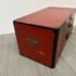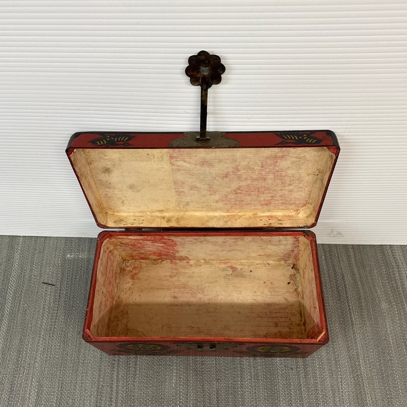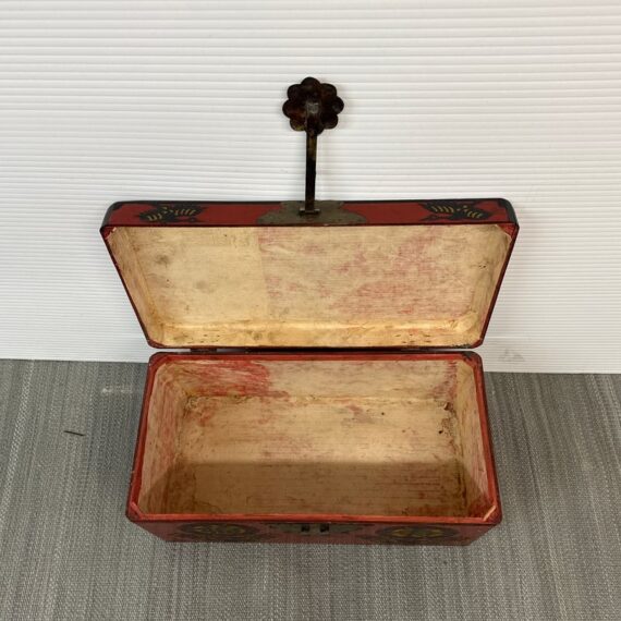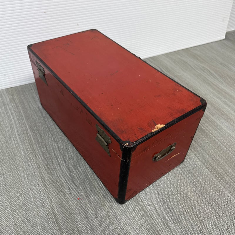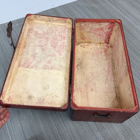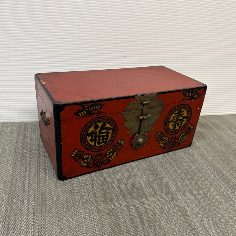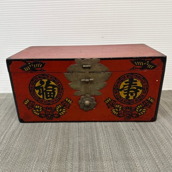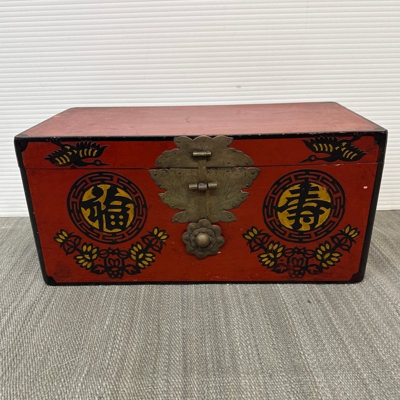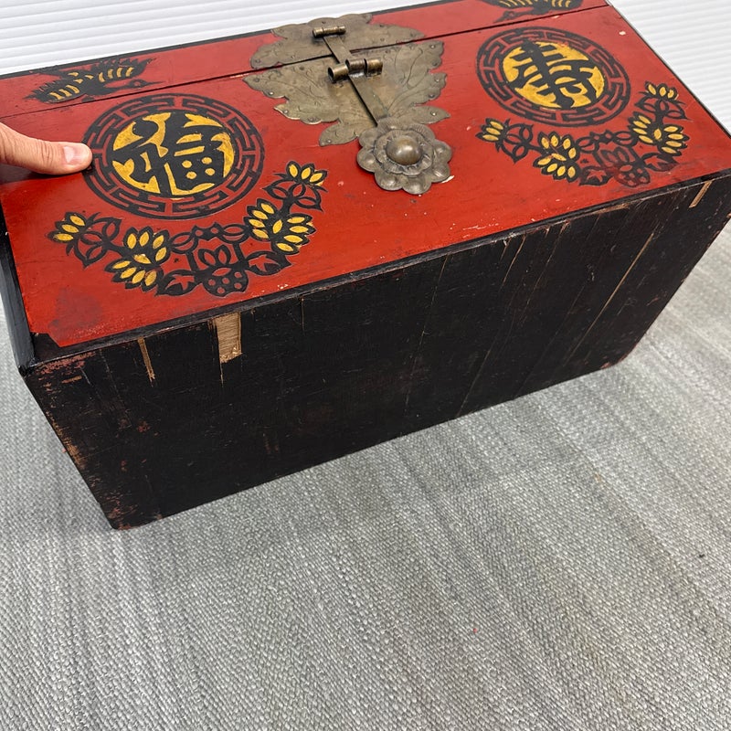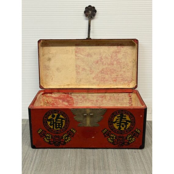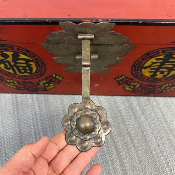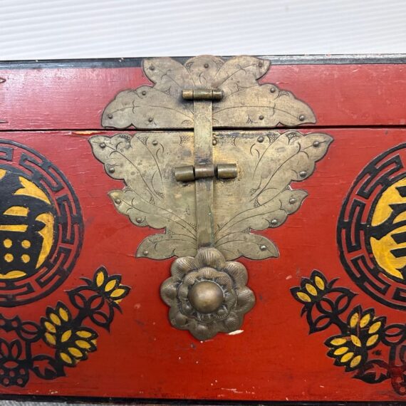 Design Plus Gallery presents an Antique Chinese Wedding Box. Korean wedding boxes, features wooden boards are generally thin and lightweight, with pine or paulownia being the most popular. Finished with red lacquer and hand Painted with Happiness and Longevity characters. The fittings on this box are made from yellow brass, the lock is fashioned in a flower motif. Light surface wear; condition is consistent with antique age and use.