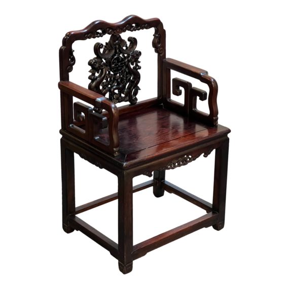Design Plus Gallery presents an Antique Chinese Rosewood Arm Chair. The large, heavy arm chair is detailed with intricately carved bat motif, symbolizing longevity and happiness. A piece of sculptural, cultural art that is functional as well. Visible surface wear; condition is consistent with antique age and use.