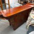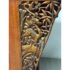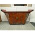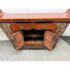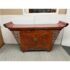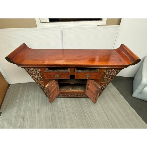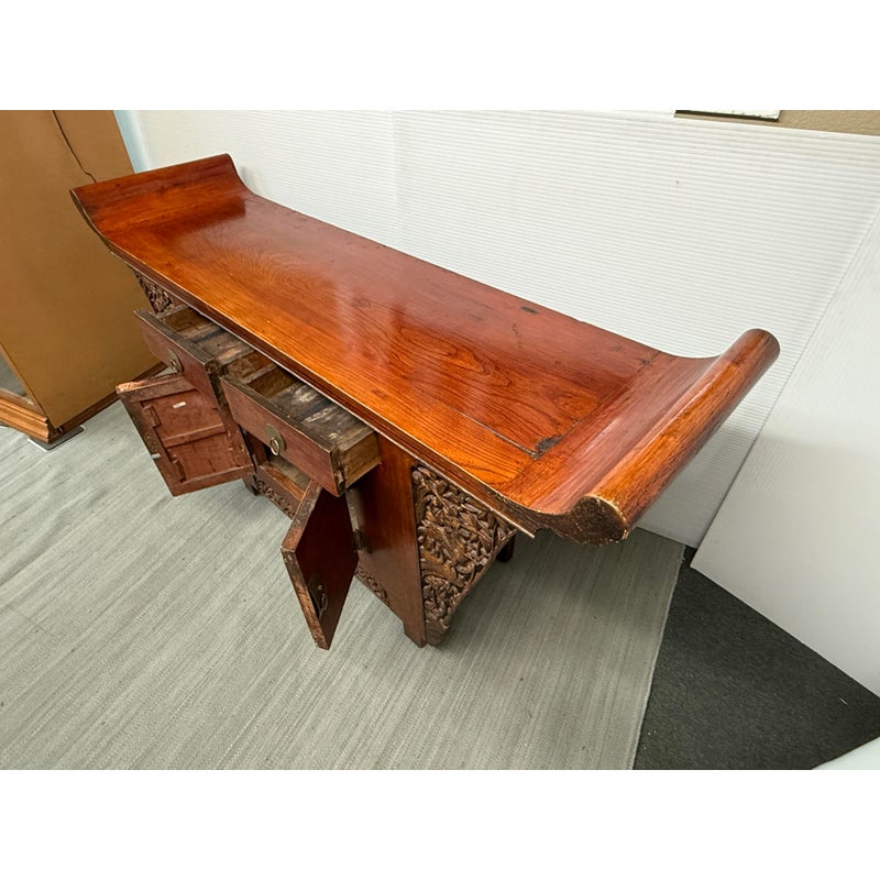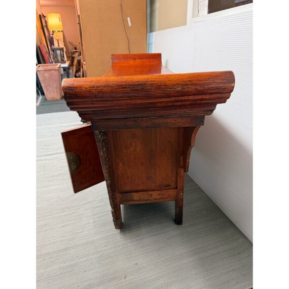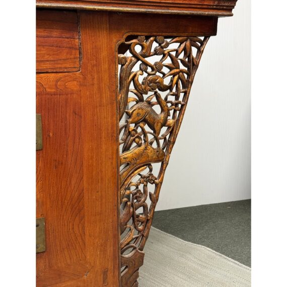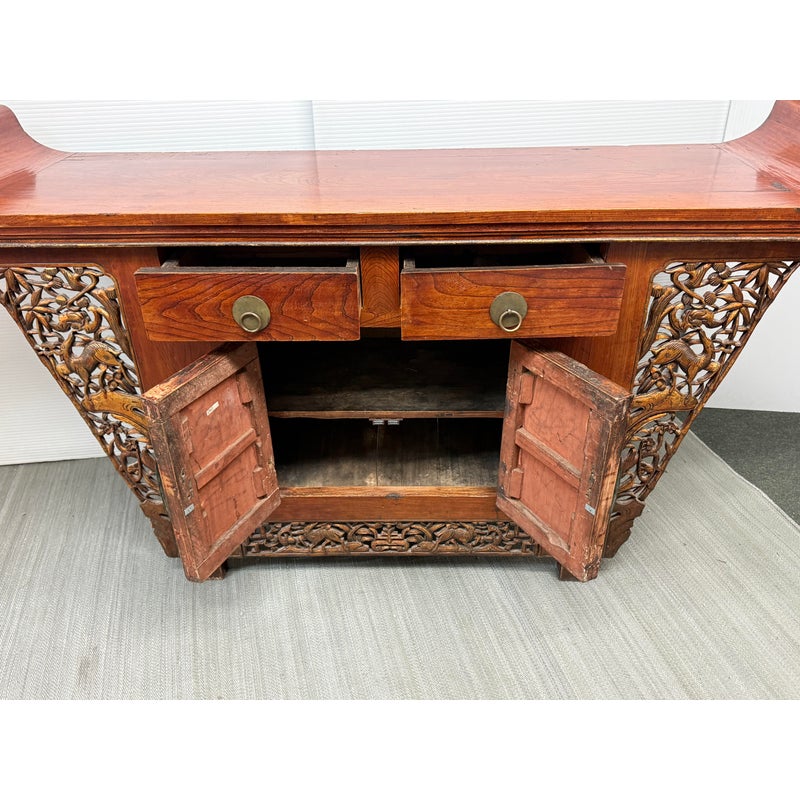 Design Plus Gallery presents a Tongzhi Style Altar Elmwood Cabinet. This altar has ornately pierce-carved and gilt finished jabots with a lower frieze panel that decorate the trestle structure with a flora + fauna design. The two interior shelves are fronted by two doors with antiqued brass fittings. Two storage drawers also have antiqued brass pulls. Items in good condition, visible and minimal surface wear that is consistent with use.