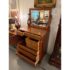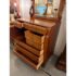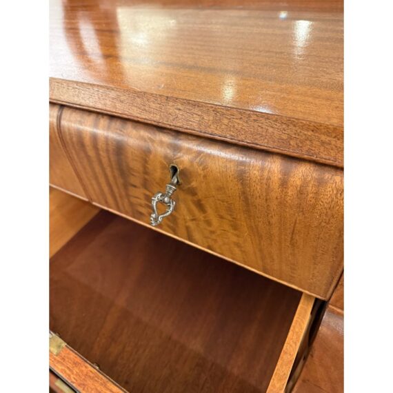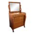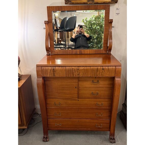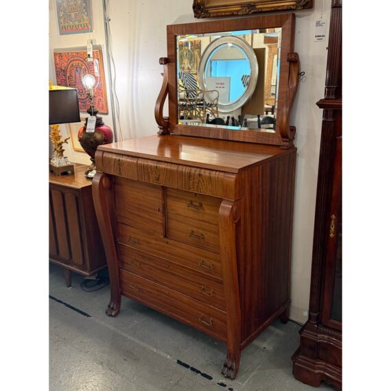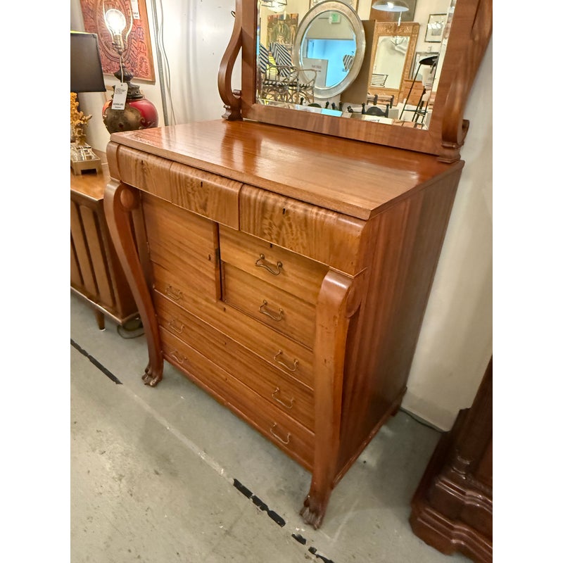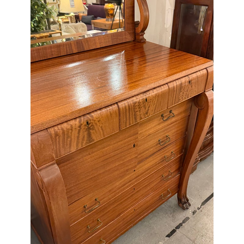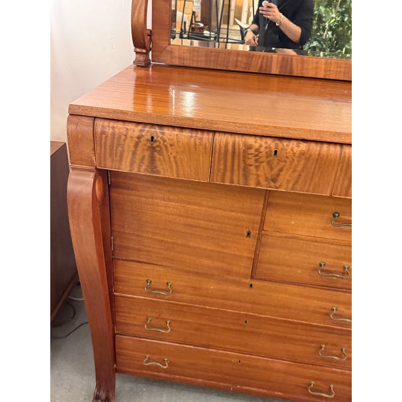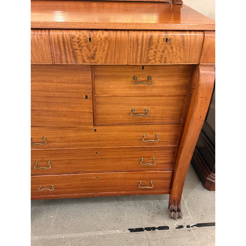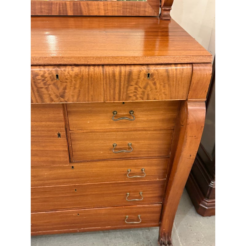 Design Plus Gallery presents a Solid Wood and Veneer Front Dresser with Mirror from the Early 20th Century. The dresser is unique and rare find with its use of drawers and interior cubby. The piece is made from solid wood and has a finely done veneer over that matches up wood grain for an elevated look. The dresser has eight drawers of various sizes and one cabinet door with open cavity that goes to full depth of the piece. Each drawer and the cabinet door has a locking key. The design is fine too, with scrolled arms holding the spinning mirror and claw feet fronts. The dresser is in good condition for its antique age + use.
