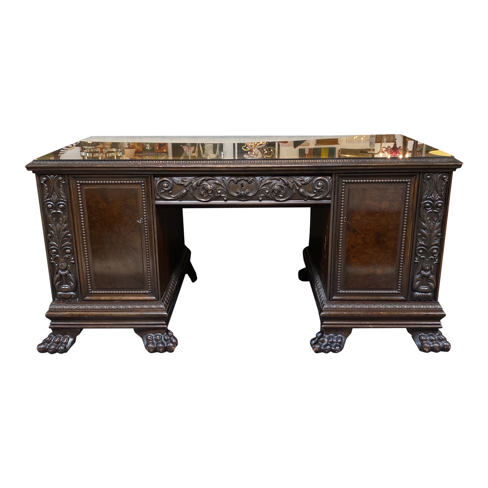 Design Plus Gallery presents a stunning Antique Executive Desk. Elaborate details abound, including inset and bordered work surface, burled panels, beaded trim, lovely carvings and massive claw foot base. The locking left burled panel door opens to reveal three deep drawers. Intricate carvings identify the locking shallow center drawer. Right burled panel drawer opens to a sliding shelf and a fixed shelf. Back is finished, but with less detail. Key and glass protector included.