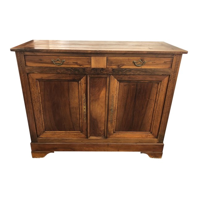 Design Plus Gallery presents a beautiful large scale vintage cabinet. This piece has been modified so the doors slide into the sides, revealing an opening large enough for a television or components. The aged patina, antiqued brass fittings and rich woodgrain are authentic.
