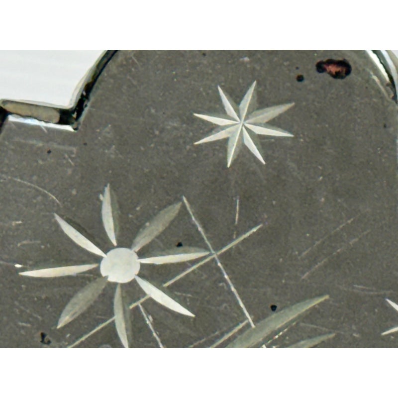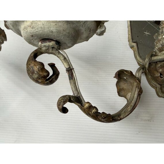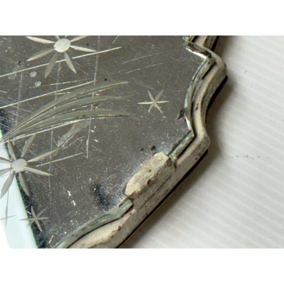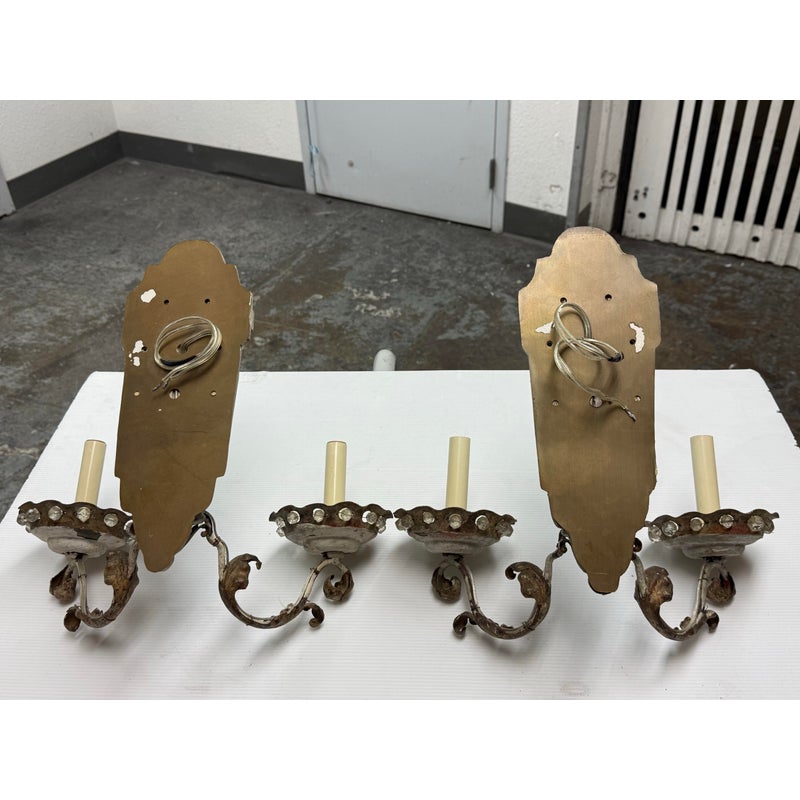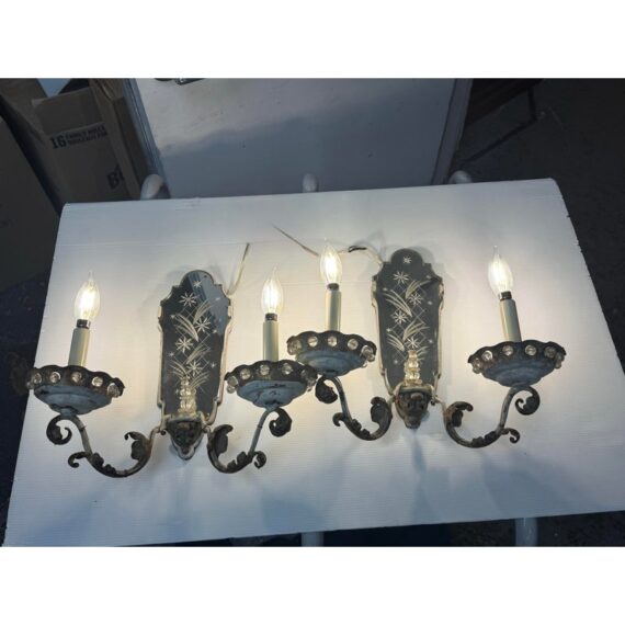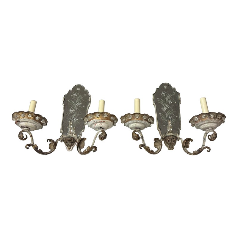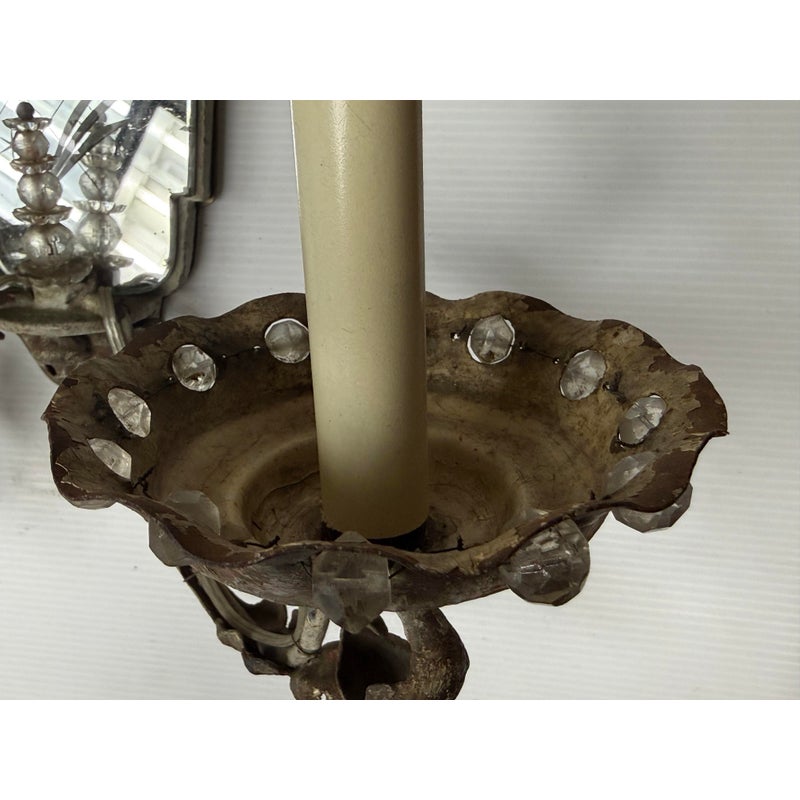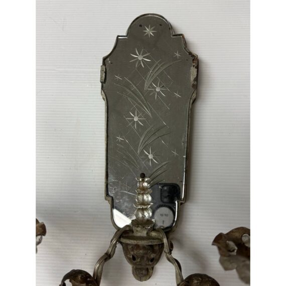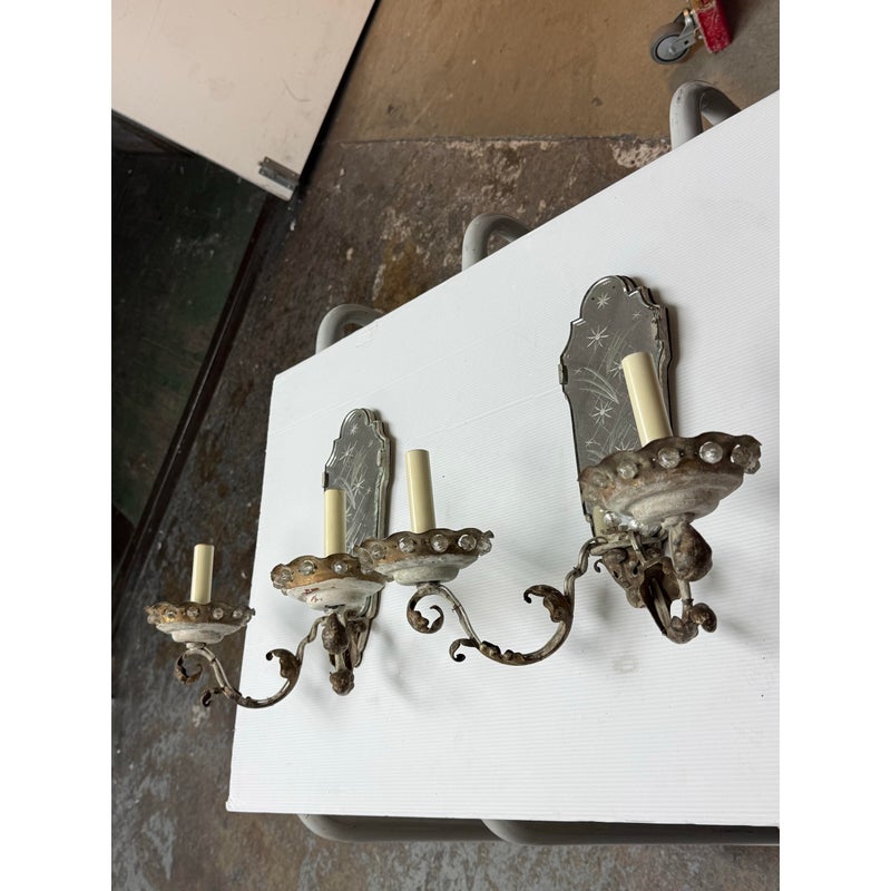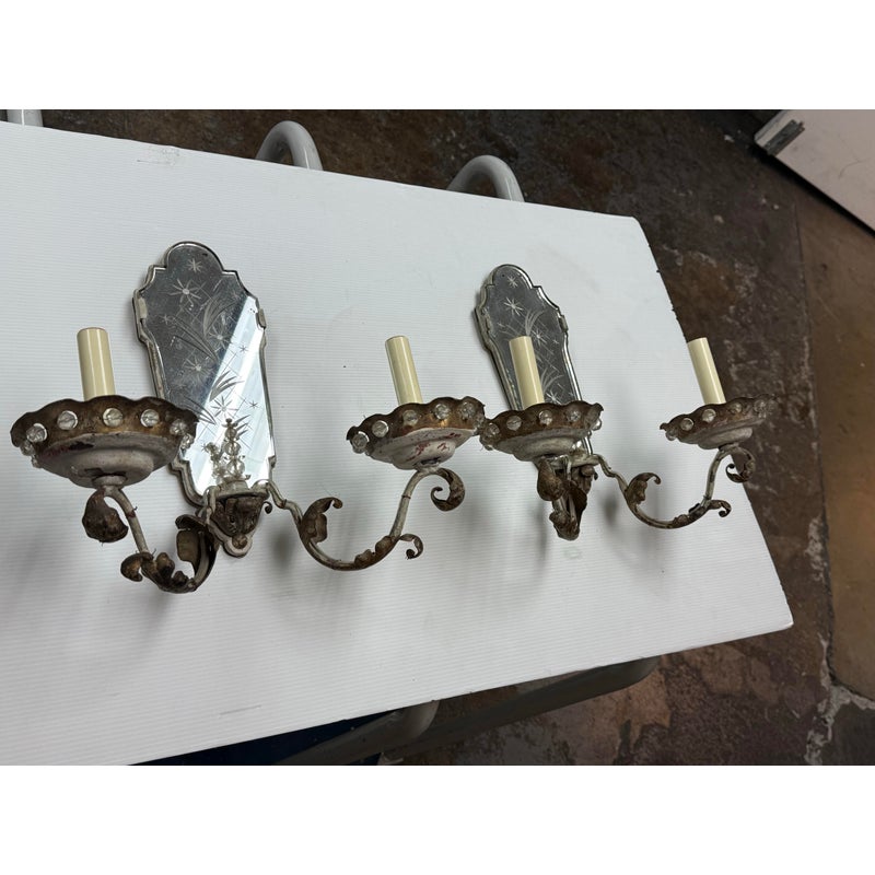 Design Plus Gallery presents a Pair of Etched Mirror Wall Sconces from the Early 20th Century, Likely 1920s. The sconces offer a mirror backing that plates up against the wall with stars and flowers etched into them. There have two iron arms apiece that curve outward, with scrolled design pattern, holding the candelabra candle with a drip plates. The drip plates are not a necessary part of the sconce as they are wired for electricity but add beauty and historic reality to them. The drip plates are surrounded by crystals for extra glam. They are distressed for their age but you may find charm in them for that reason.