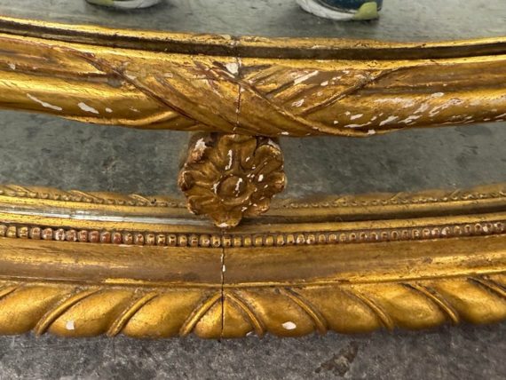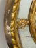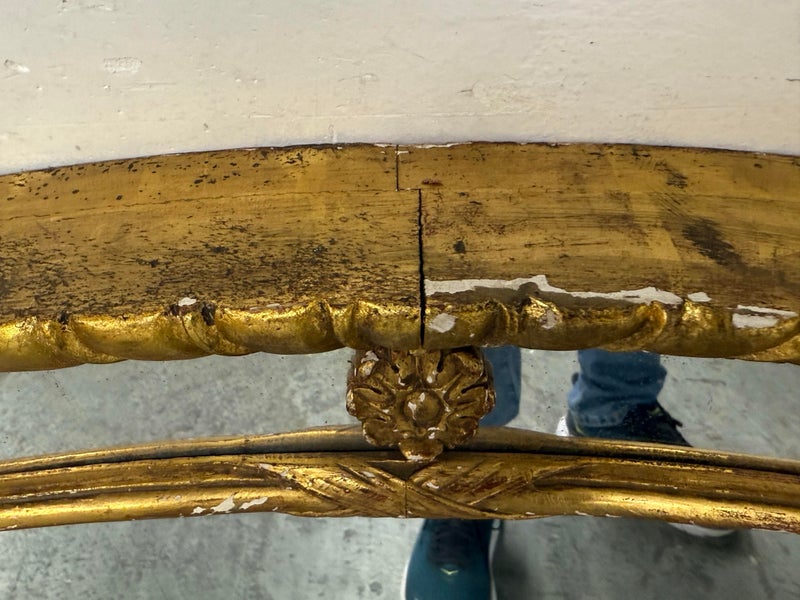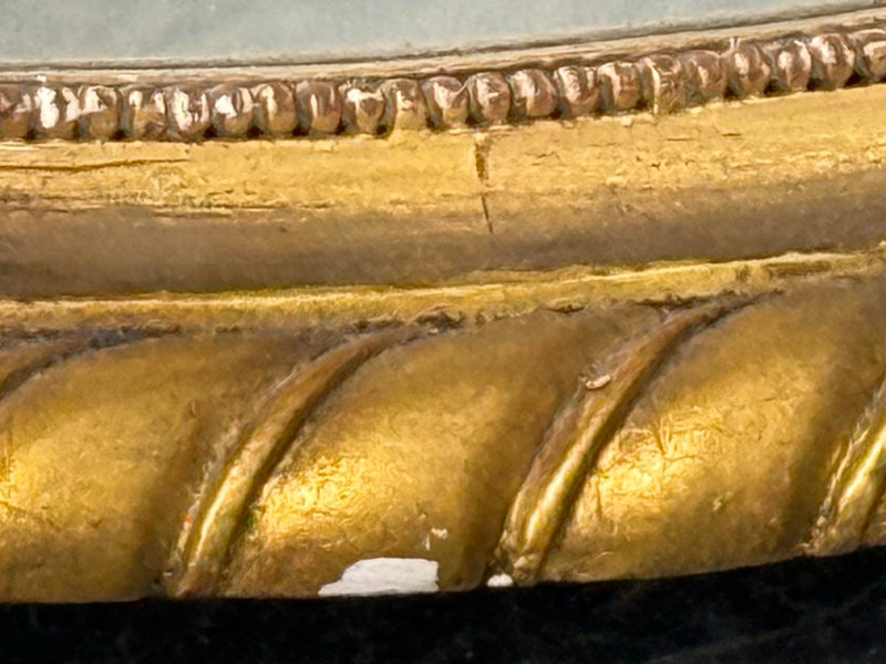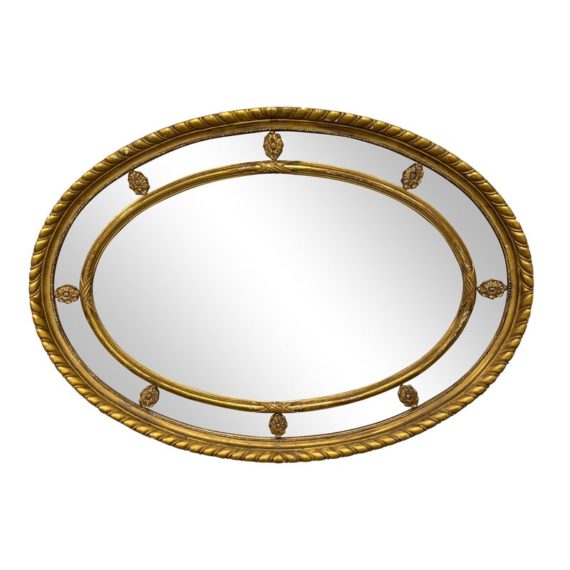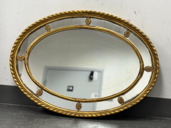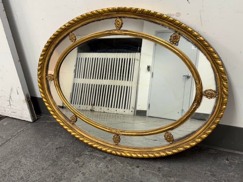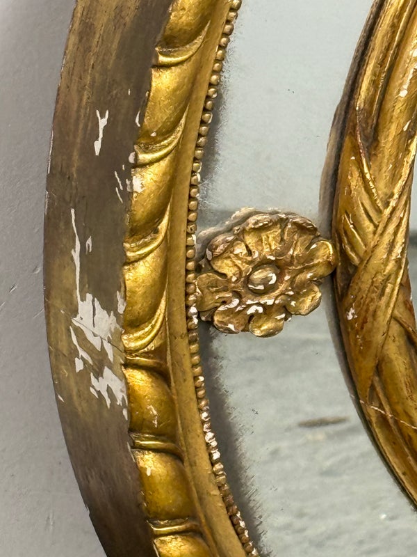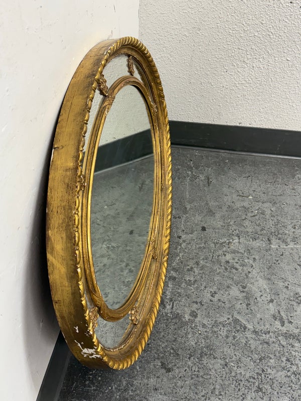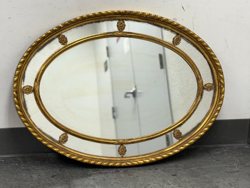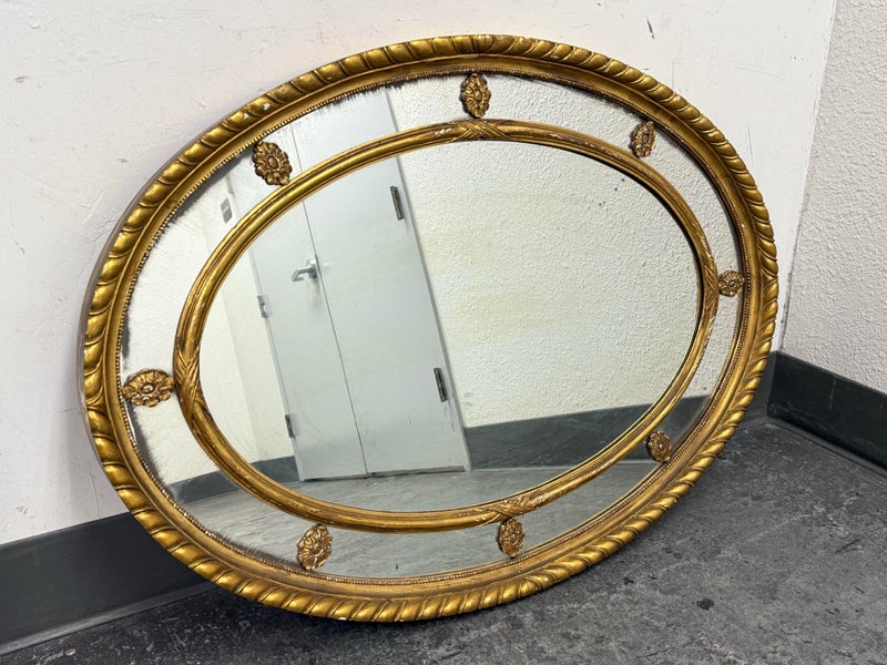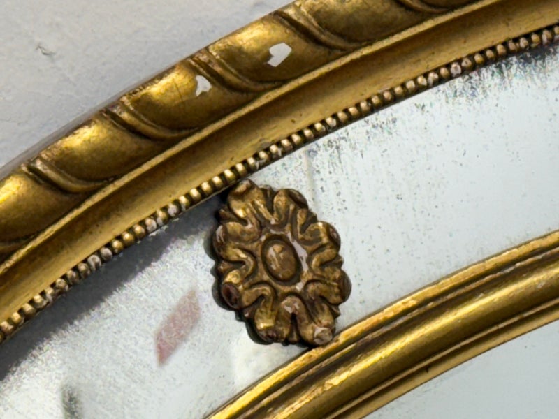 Design Plus Gallery presents an Antique Oval Wall Mirror that is Edwardian in Style. The Edwardian border mirror offers a gilded gesso frame, thee avert moulded frame with tongue and dart border with attached spaced panteras, main plate and border plates are all original. The mirror is in good condition for its vintage age with visible patina and visible chips and minor wear.