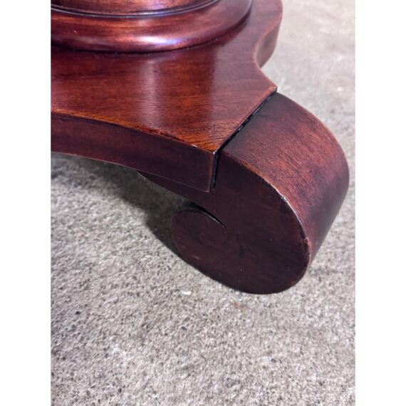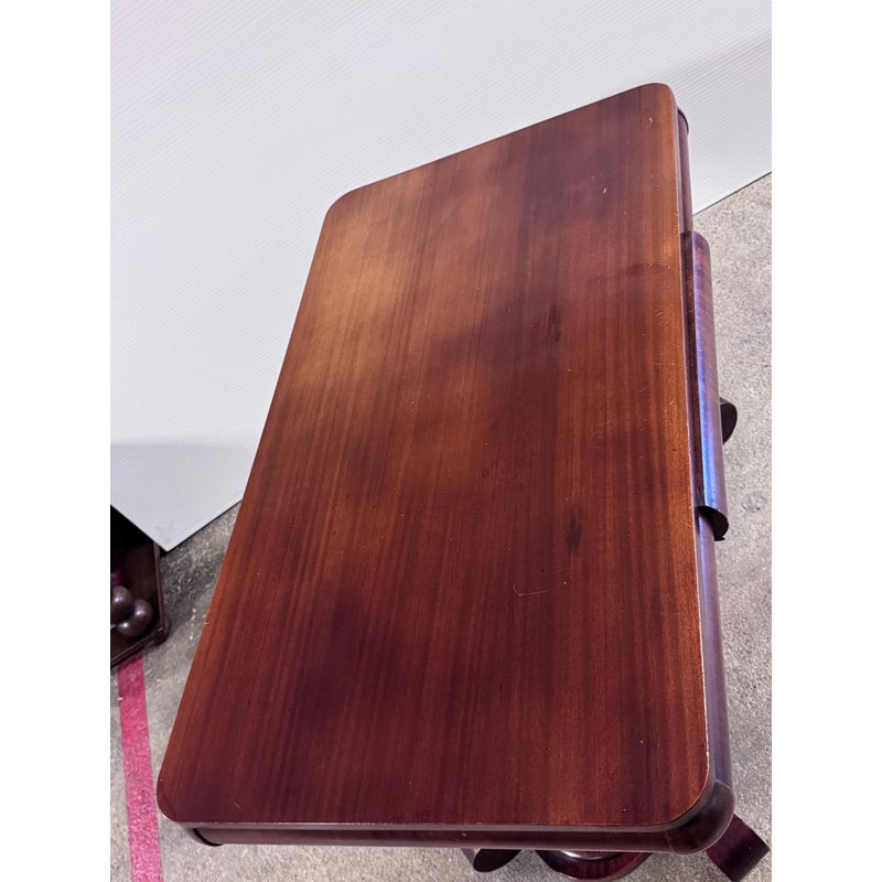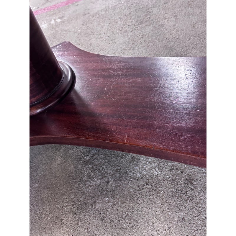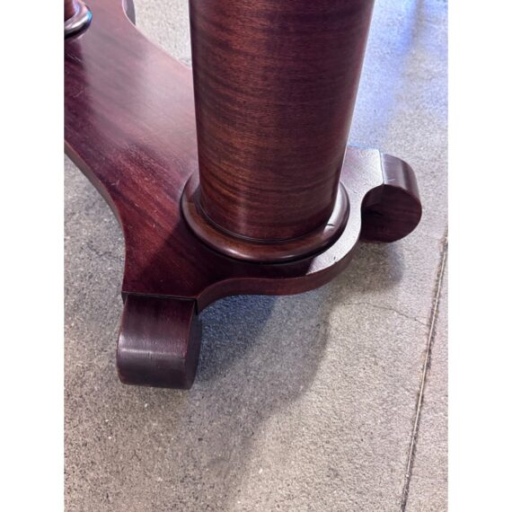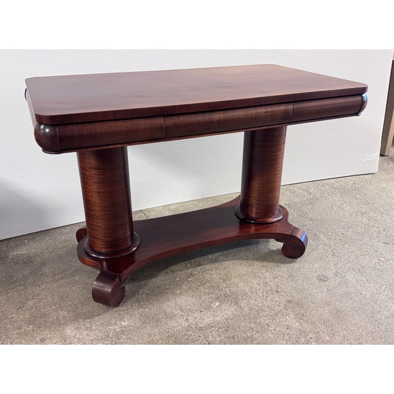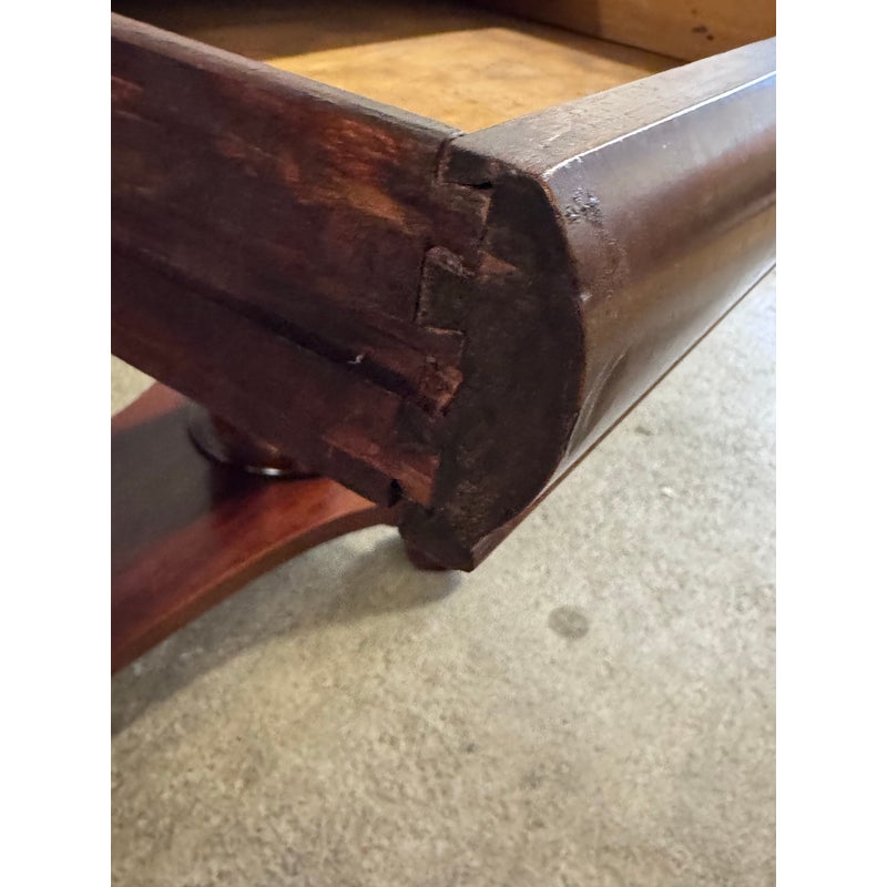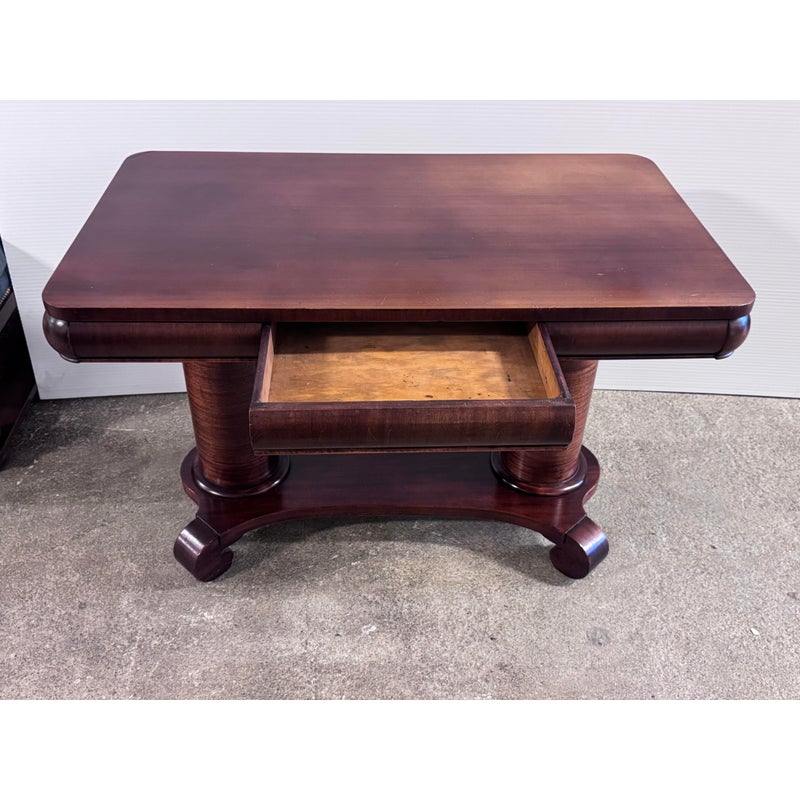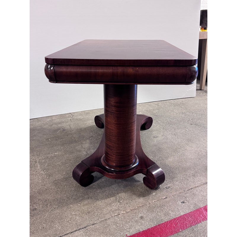 Design Plus Gallery presents an Antique Library Table. A classic craftsmanship and enduring style. Expertly crafted from solid woods, the table boasts a rich patina and characterful presence, enhanced by visible distress and gentle discoloration that speak to its genuine antique age. The rectangular top surface features gracefully rounded edges, providing a softened silhouette and comfortable workspace. Below the top, the apron presents a central, dovetail-joined drawer, ideal for storing writing utensils or important papers, and showcasing the care and detail poured into its construction. The table is supported by two stately pedestals at its base, each flowing into a connecting platform. Stability is ensured by four thick, curved scrolled feet, which add a decorative flourish and a sense of robust permanence. With its timeworn finish and graceful proportions, this Antique Library Table effortlessly blends history, utility, and timeless beauty, making it a remarkable centerpiece for any study or reading room. In good condition, visible and minimal wear form antique age.