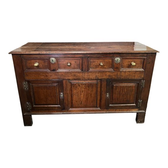 Design Plus Galley presents an Antique English Walnut Sideboard, Circa 1680. The sideboard is constructed with walnut wood and features brass hardware with an antique finish. The two top drawers have lock accents, and the lower two cabinet doors are lockable. Key is not included. The legs are rectangular without a taper. Minor wear from age and use; sideboard is in good condition.
