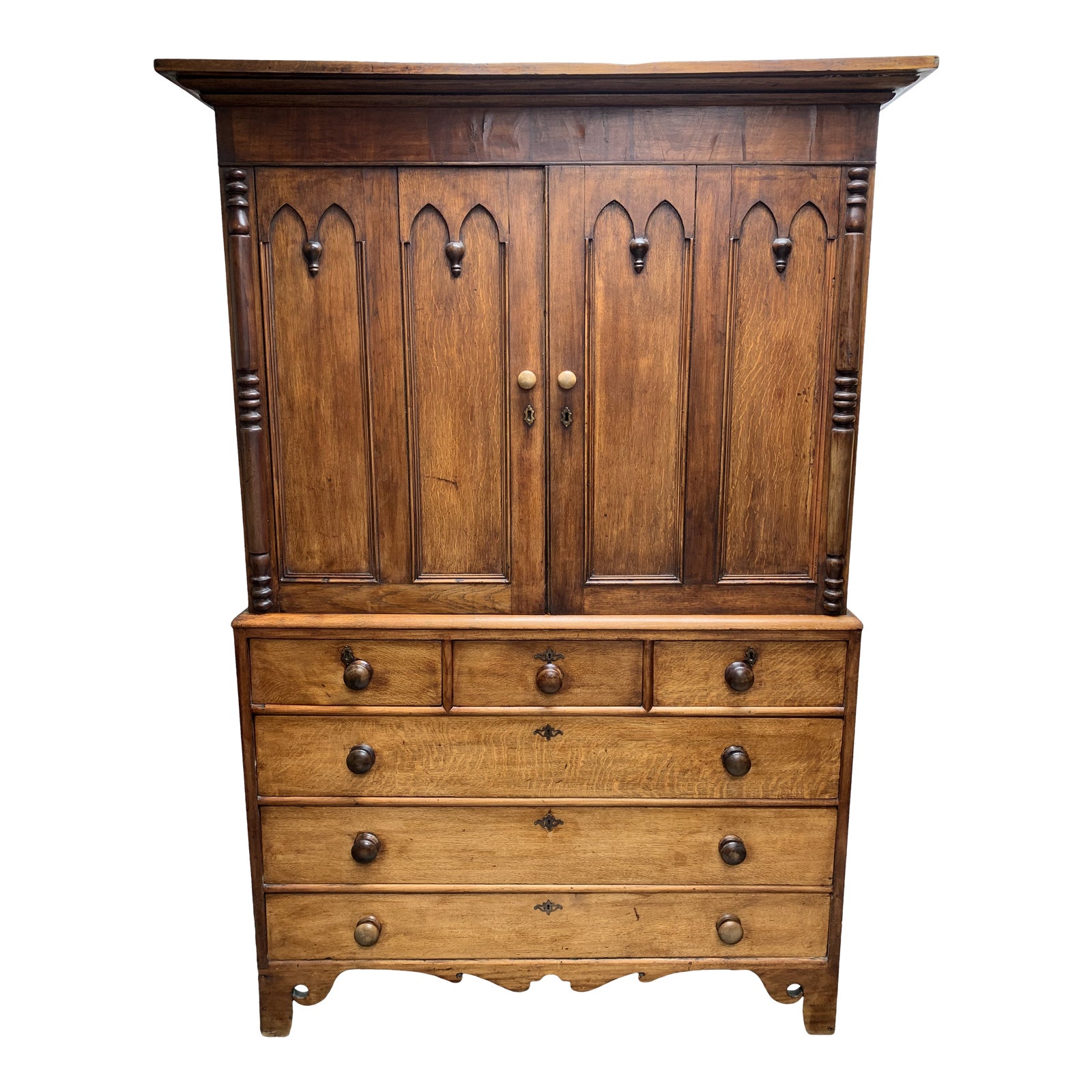 Design Plus Gallery presents an Antique English China Cabinet. The 2 pc cabinet offers lovely details, inside and out. Lower segment offers storage for linens and flatware, while upper segment has room for large serving pieces.