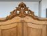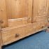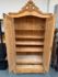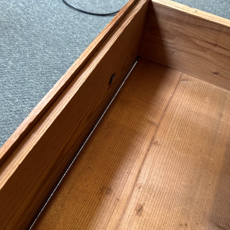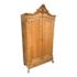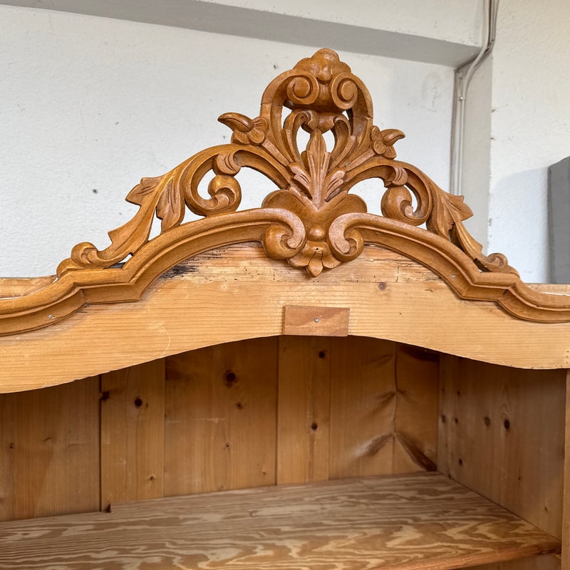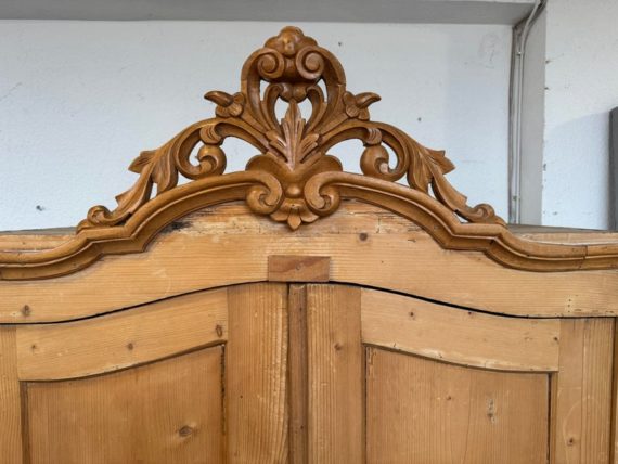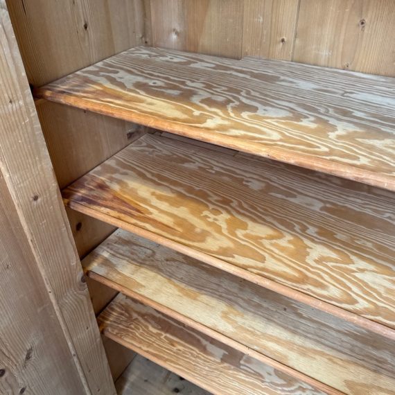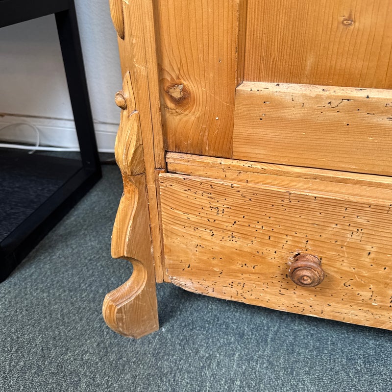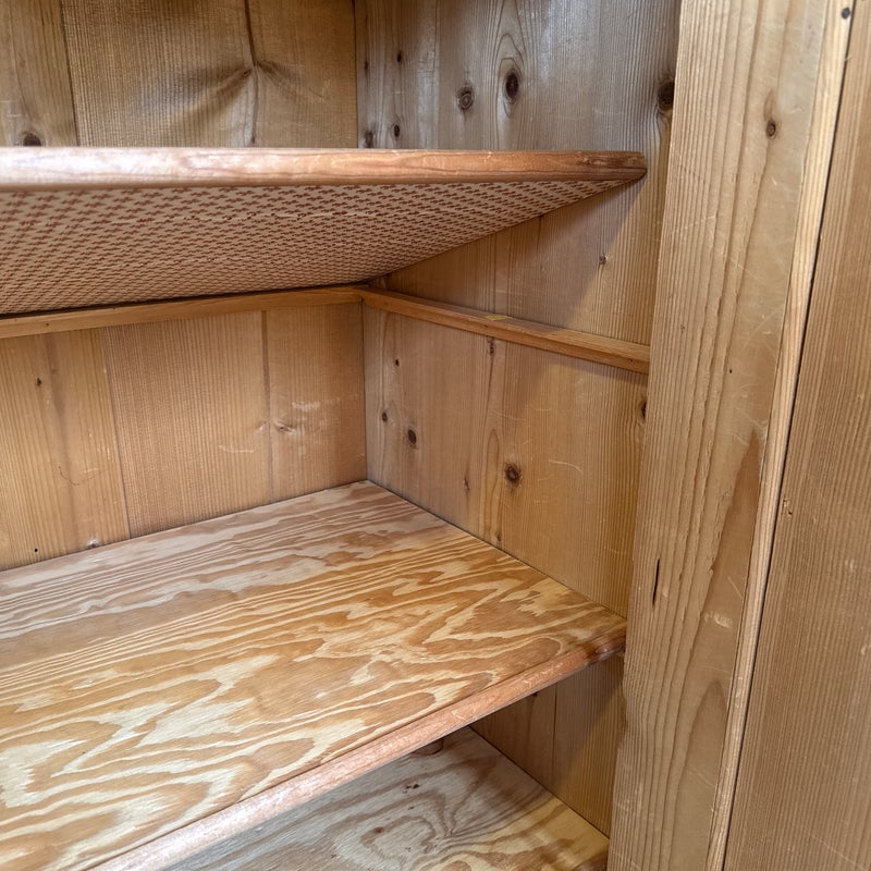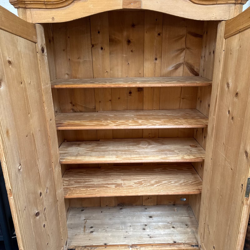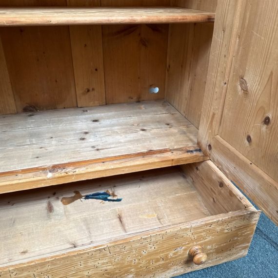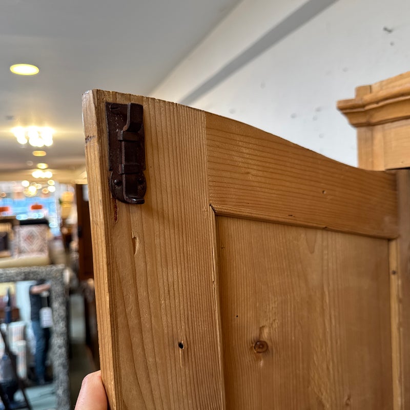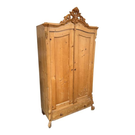 Design Plus Gallery presents an Antique English Pine Wardrobe. Lightly embellished, with carved crown, the very old classic beauty offers ample storage for linens, clothing or for use as pantry. Removable shelves have been notched for cord organization, and papered for whimsy. A full drawer opens at the base with turned knobs. No key, see wood block closure at top. Inactive termite damage visible, and adds to character of this antique piece, otherwise functions as intended.