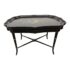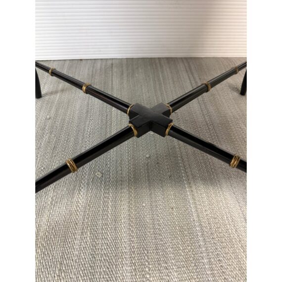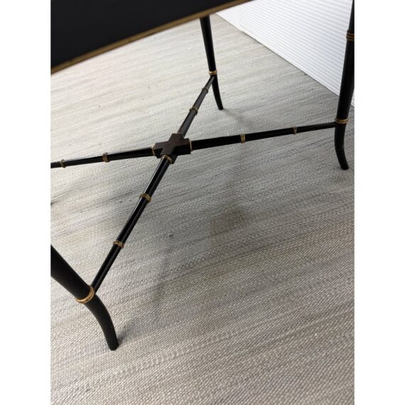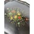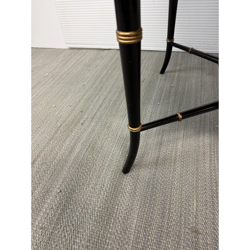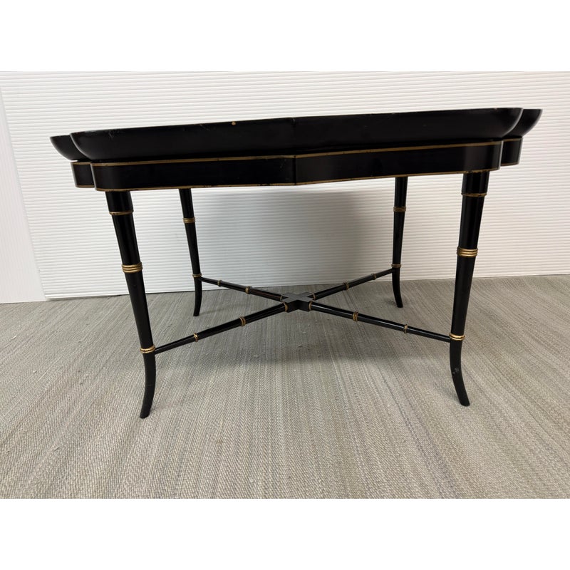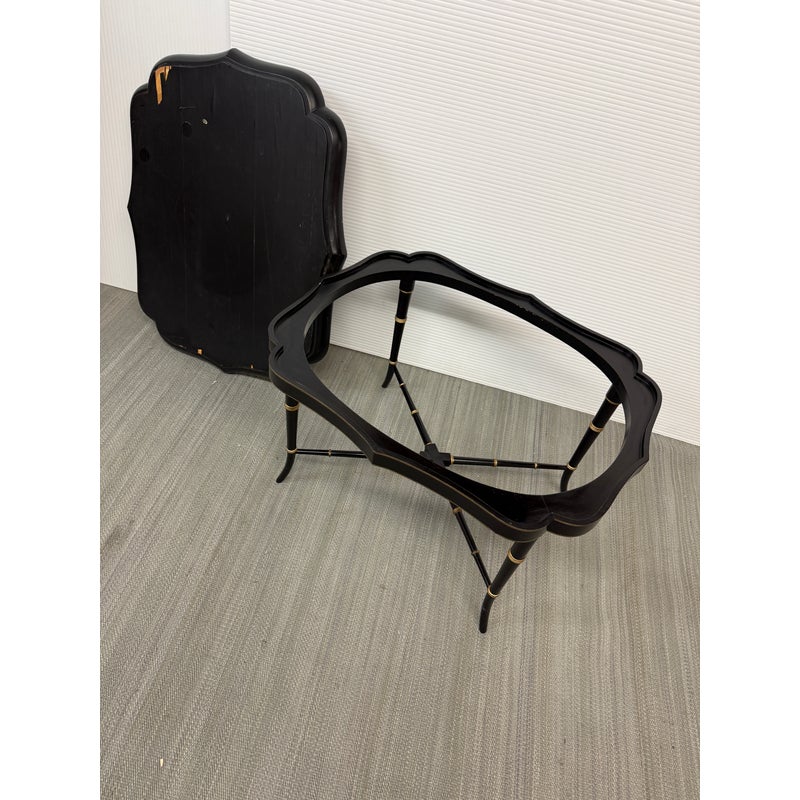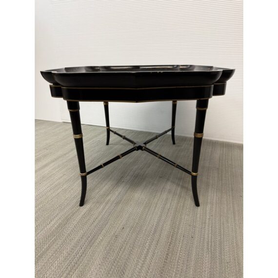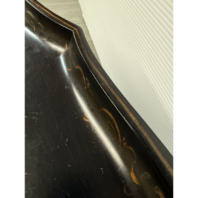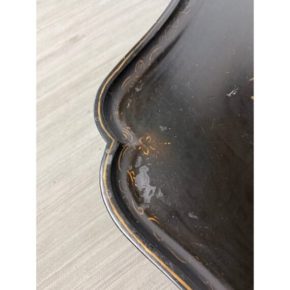 Design Plus Gallery presents an Antique English Regency Floral Painted Tray Table. The focal point for this table is on the scalloped edge and removable tray top. It is hand-painted with floral motifs and rests securely on a stand. The stand has faux bamboo legs thus an iconic Regency detail. The legs are joined by an “X” shaped cross-brace stretcher, further embellished with gold detailing, that not only adds stability but also echoes the glamorous decorative flair of the era. With its dramatic black and gold palette, graceful curves, and intricate floral artistry, this tray table brings a touch of timeless refinement to any interior. In good condition, aged patina and distressed on finish, visible and minimal wear from use + age.