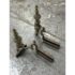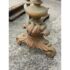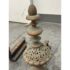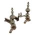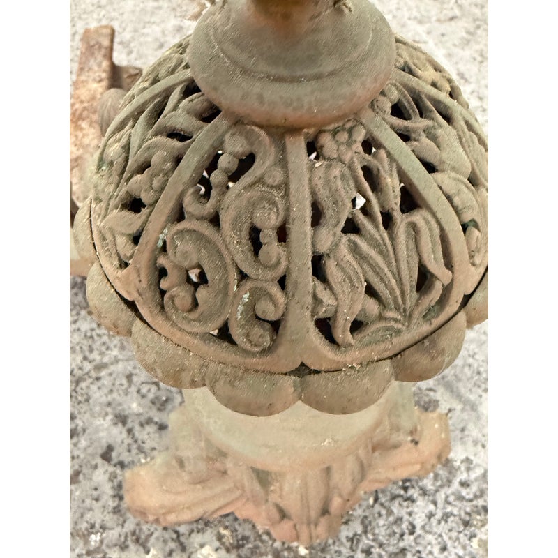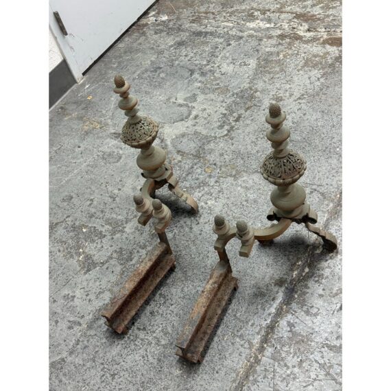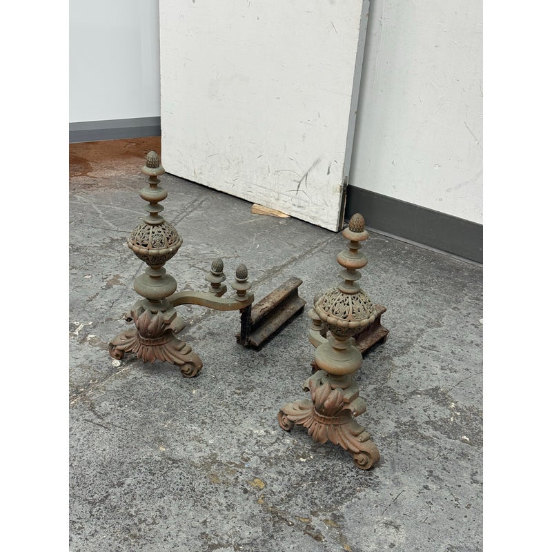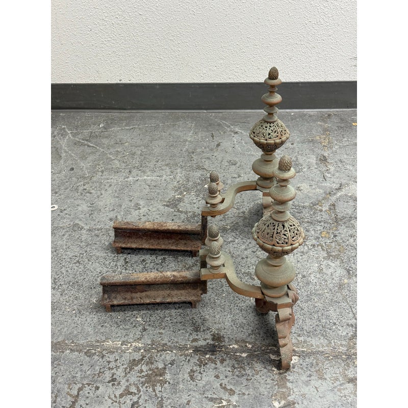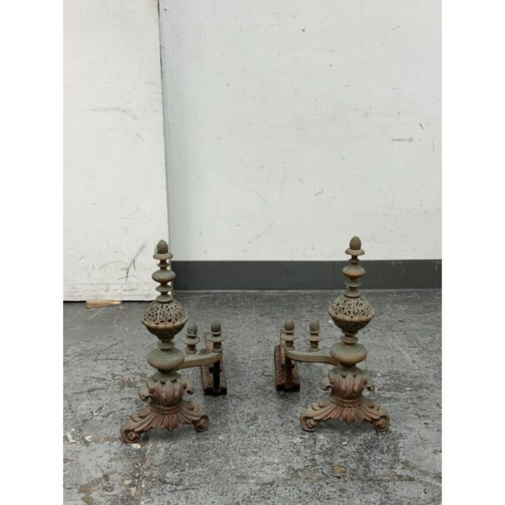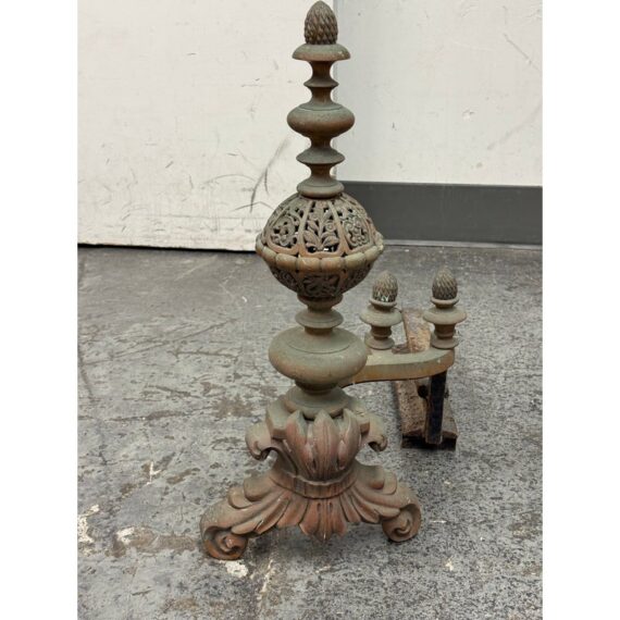 Design Plus Gallery presents a Pair of Antique Fireplace Andirons. Each piece has an anchored sculptural, acanthus inspired base with curled feet, topped by a turned column and crowned with an acorn-form finial. The pierced open lattice work on its orb adds intricate patterning and depth, while the side arms are accented with smaller matching finials for a cohesive, traditional silhouette. The surfaces show an aged patina with natural oxidation and visible wear consistent with age, highlighting the character of the metalwork and carved-style forms. They are in good condition with visible and minimal wear from usage.