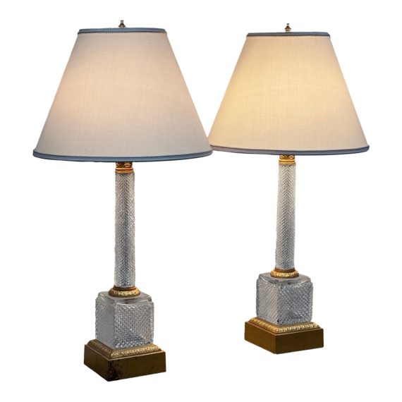 Design plus Gallery presents a Pair of Corinthian Capital Cut French Glass Table Lamps. The French cut glass and armful lamp bases are exquisite pieces that exude elegance and sophistication. The bases are crafted from high-quality, clear glass that has been cut in a meticulous manner to create a stunning faceted effect. At the top of each lamp base sits a gilt Corinthian capital.The capital features detailing of carved acanthus leaves + volutes, showcasing the craftsmanship of the artisans who created these masterpieces. Beneath the Corinthian capital, there is a repeat diamond-cut pattern on the glass base. This diamond-cut pattern creates an interplay of light as it reflects and refracts off the facets. Lastly, the lamp bases are mounted on gilt base adding a rich golden finish to the base, elevating its opulence. Both are in good condition with wear that is consistent with their age + use.