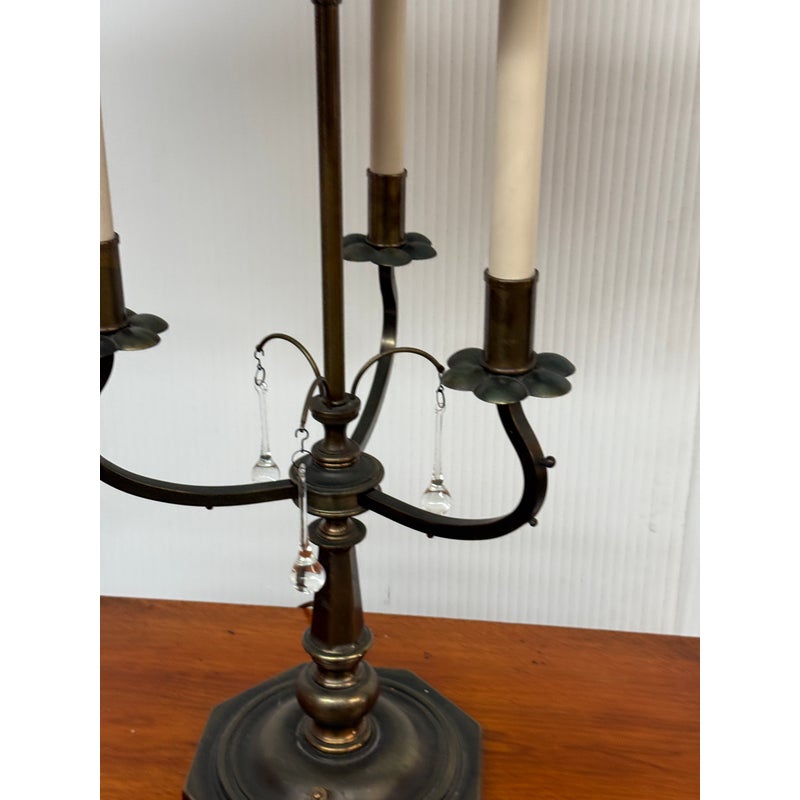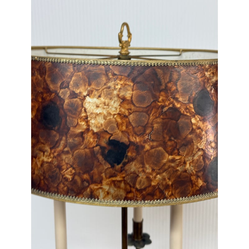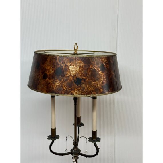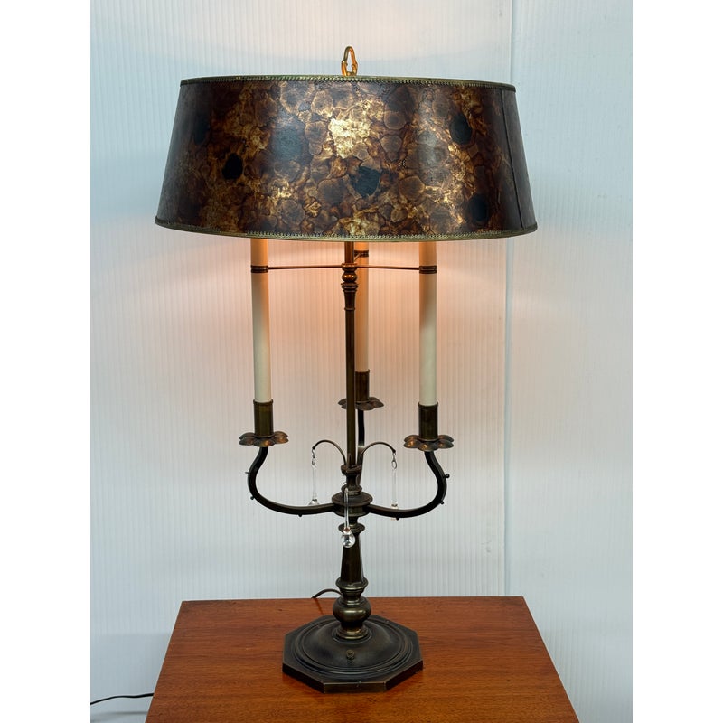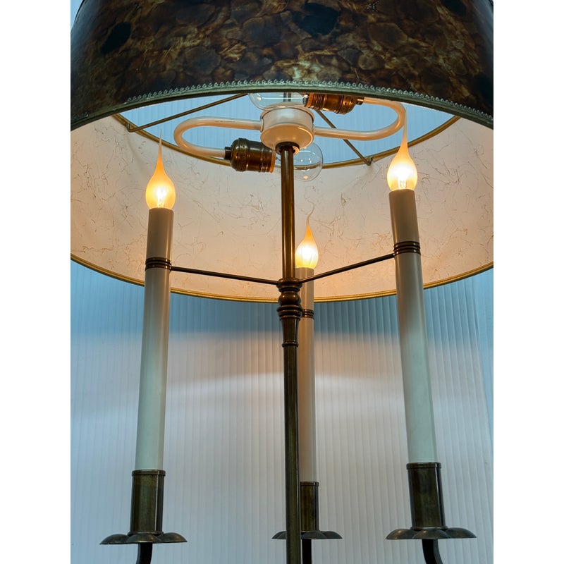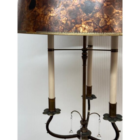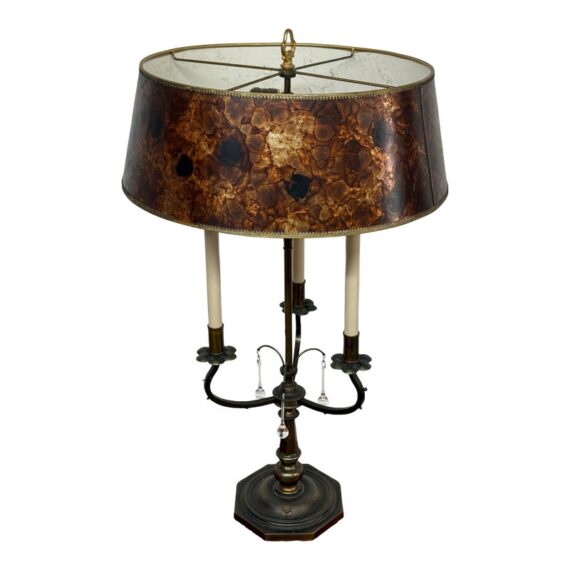 Design Plus Gallery presents an Antique French Bouillotte Table Lamp. Delicate brass arms hold a trio of “candles” that can light separate from the double bulbs, above the turned and cast brass base. A stunning marbled shade makes the lamp even more memorable. Finished with lovely brass finial. Light surface wear; missing base felt; condition is consistent age and use.