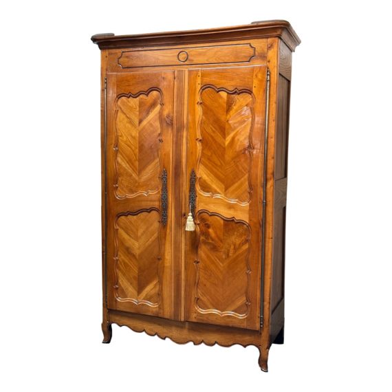 Design Plus Gallery presents a 19th Century French County Armoire. The two paneled doors have an inset herringbone pattern on each of four beveled panels. The base has a carved and apron with cabriole legs. Crafted of solid fruitwood. Has all original metal door hinges, locking mechanism and large metal key. The interior has been modified with one sturdy removable wood shelf, back of cabinet has been reinsforced as shown. Visible surface wear; condition is consistent with vintage age and use.