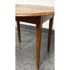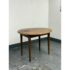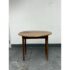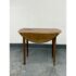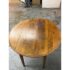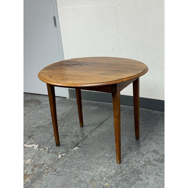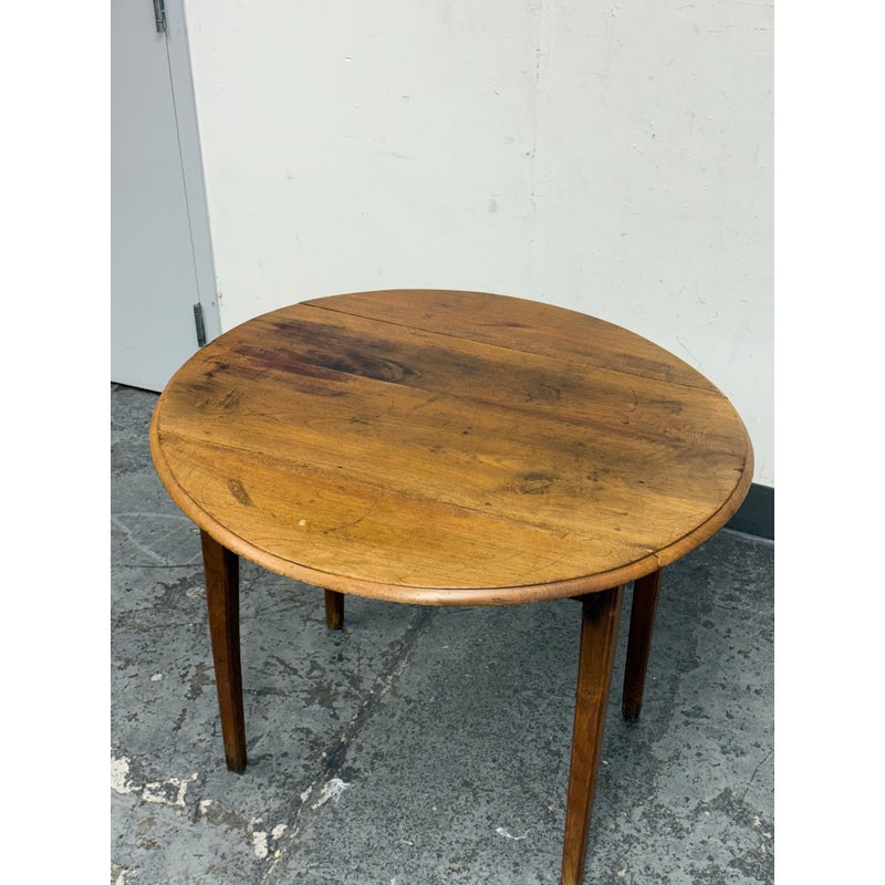 Design Plus Gallery presents an Antique French Drop Side Round Farm Table. The table features a round top with hinged drop sides that fold down into a compact profile. The wood surface showcases natural grain variations, an aged patina, and a softly worn edge detail, all characteristic of antique furniture. Four tapered legs and a straight apron ensure stable support, while the drop sides lift smoothly to expand the tabletop. It is in good condition with visible and minimal wear from usage.