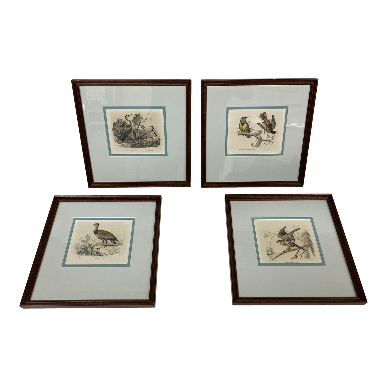 Design Plus Gallery presents a Set of Four unbound Antique Bird Prints published by Buffon, 1960’s. Artist Edouard Travies, hand-colored engravings titled La Petite Outarde (Small Bustard Crane); L’etourneau de la Louisiana (Starling of Louisiana); Le Heron Commun (Purple Heron); La Cresserelle ( American Kestrel). Delicately custom double matted in blue with slim wood frames. Light evidence of wear; overall good condition.