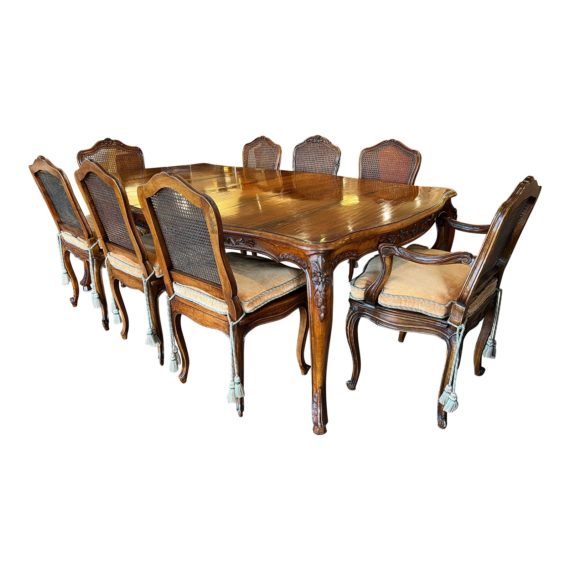 Antique French Extension Dining Table + 2 Leaves + 8 Caned Chairs Set