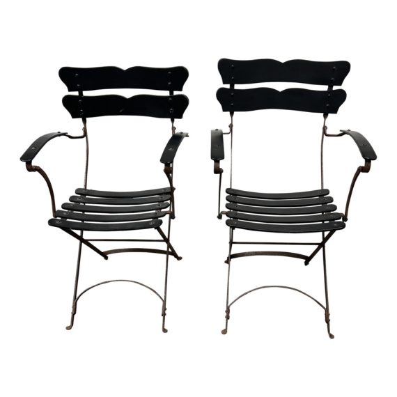Design Plus Gallery presents a Pair of Antique French Garden Chairs. The chairs are iron and date back from the mid twentieth century. Visibly worn and rusted, the chairs do not fold anymore. Will make a great addition into your blooming garden spot.